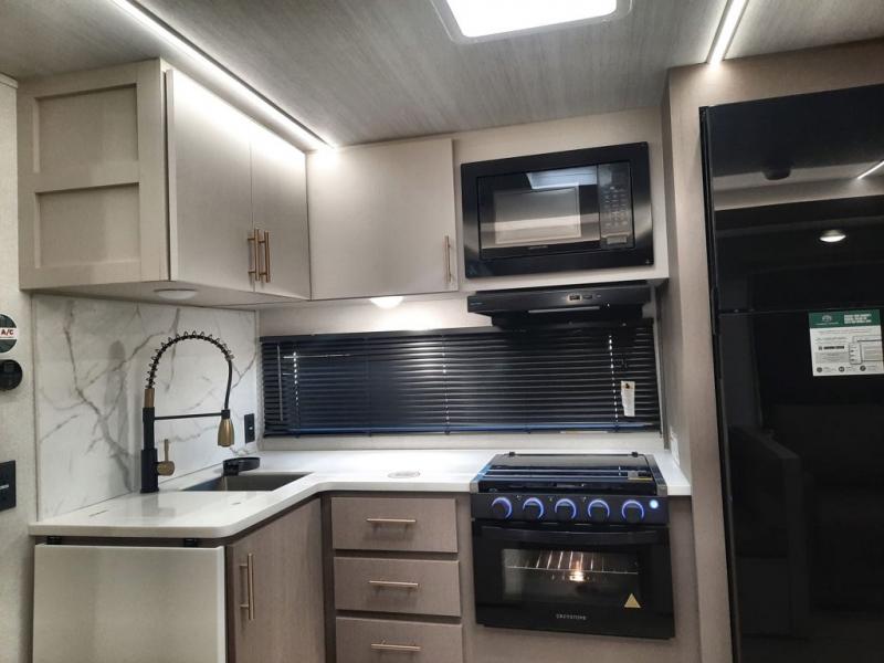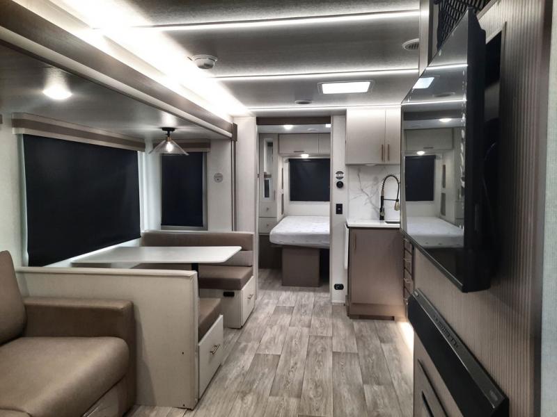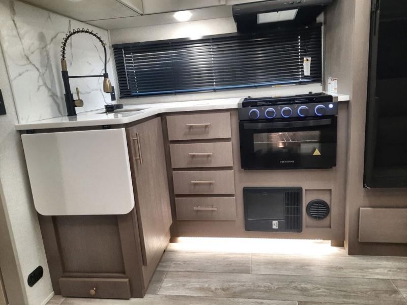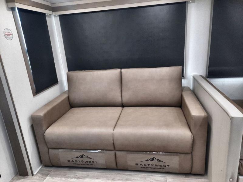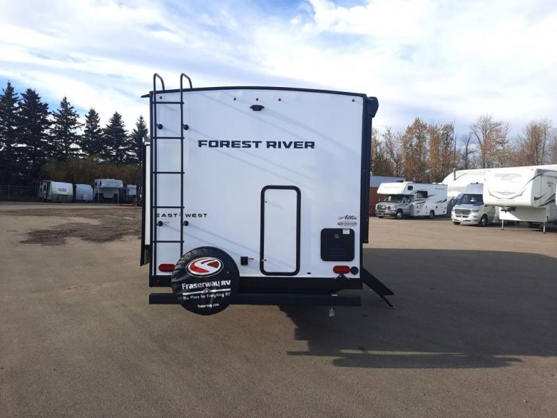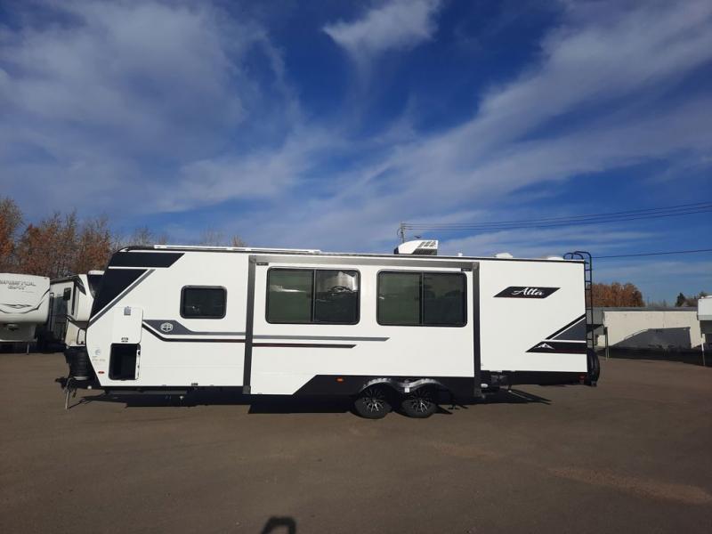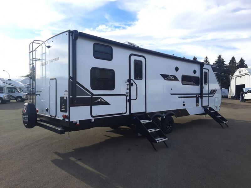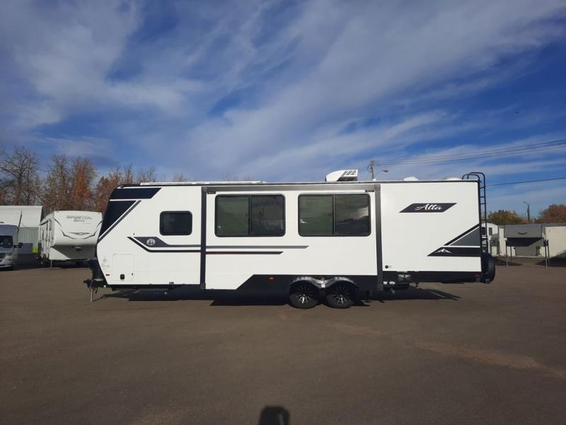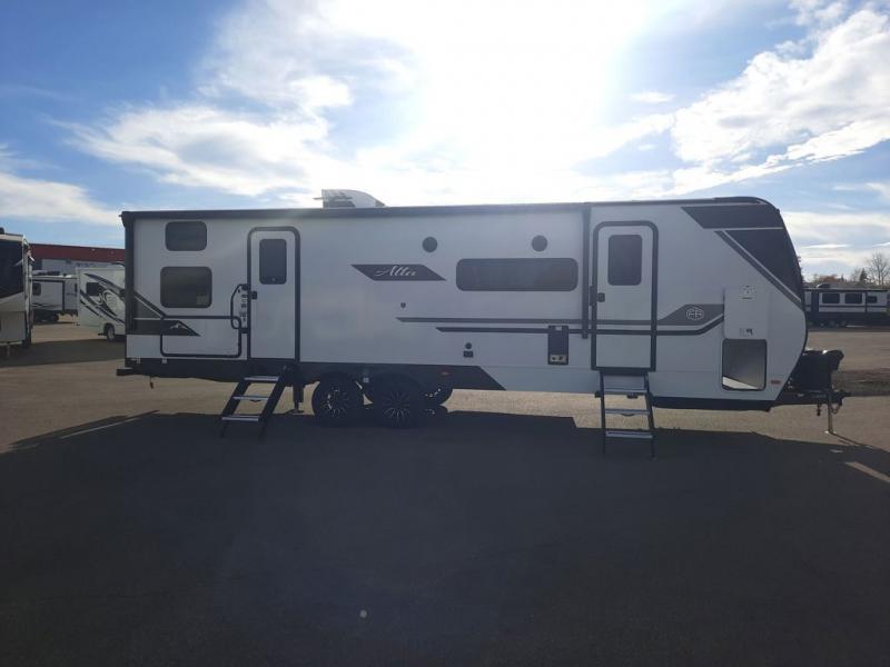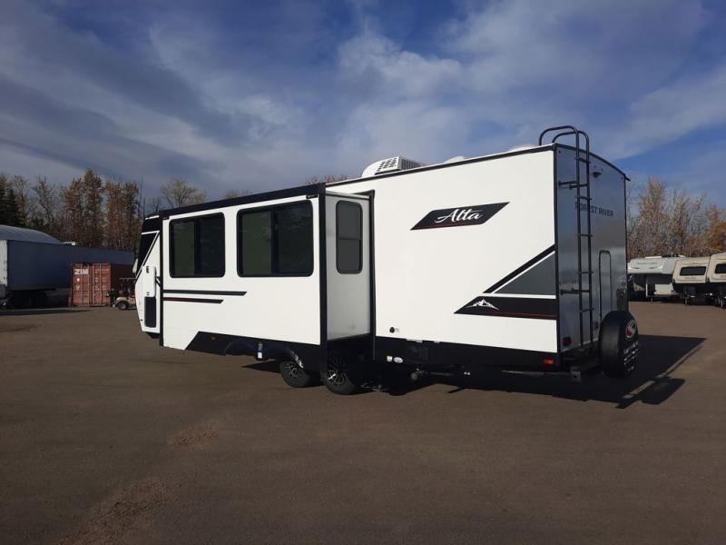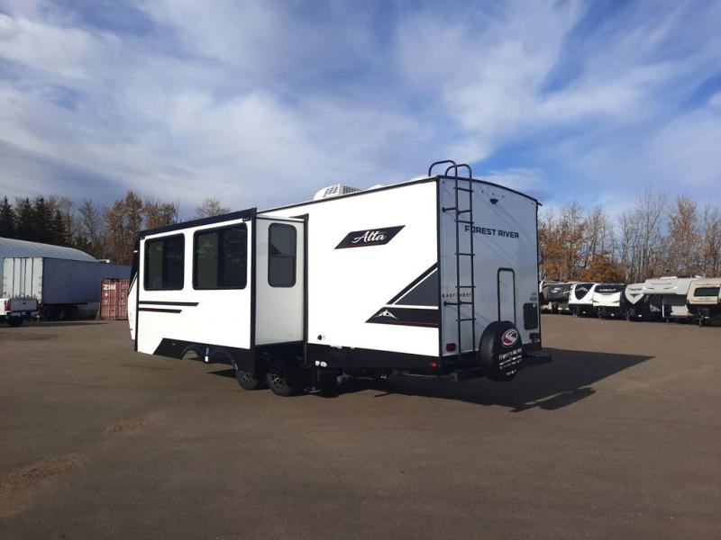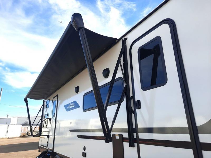 Each Alta travel trailer or toy hauler by EAST TO WEST is constructed with a 5" vacuum bonded roof, an enclosed and heated underbelly, and diamond plate front rock guard for added protection. Outside, you'll find marine-grade exterior speakers, a universal docking station, and back-up camera prep that can be added to make maneuvering in and out of campgrounds easier than ever. Inside, there are 4k interior LED lights, solid pressed membrane countertops, black roller shades, and many more interior comforts you are sure to love.