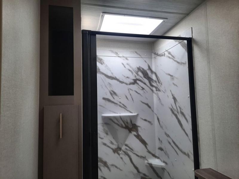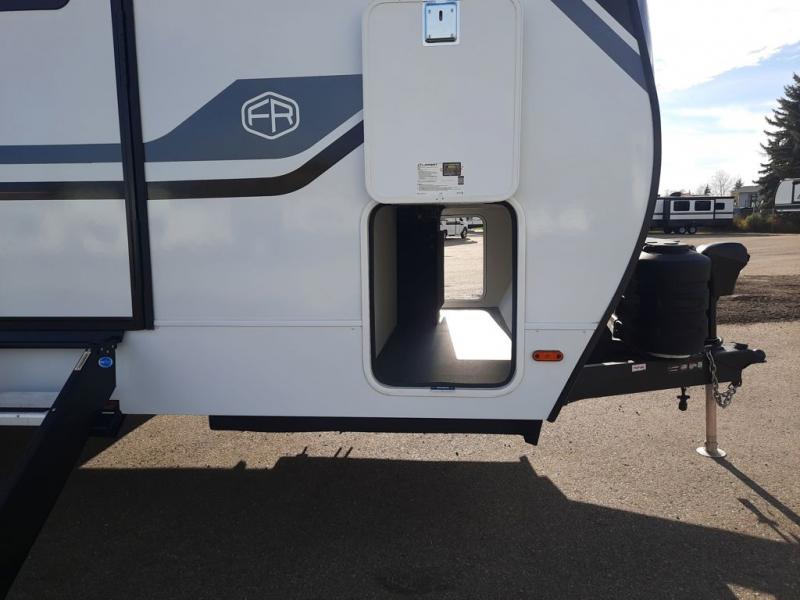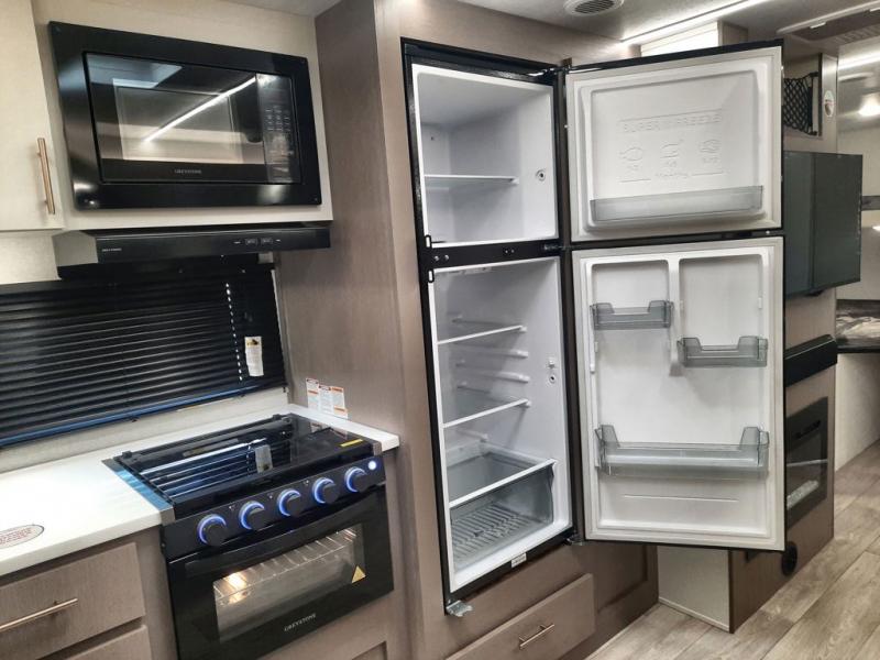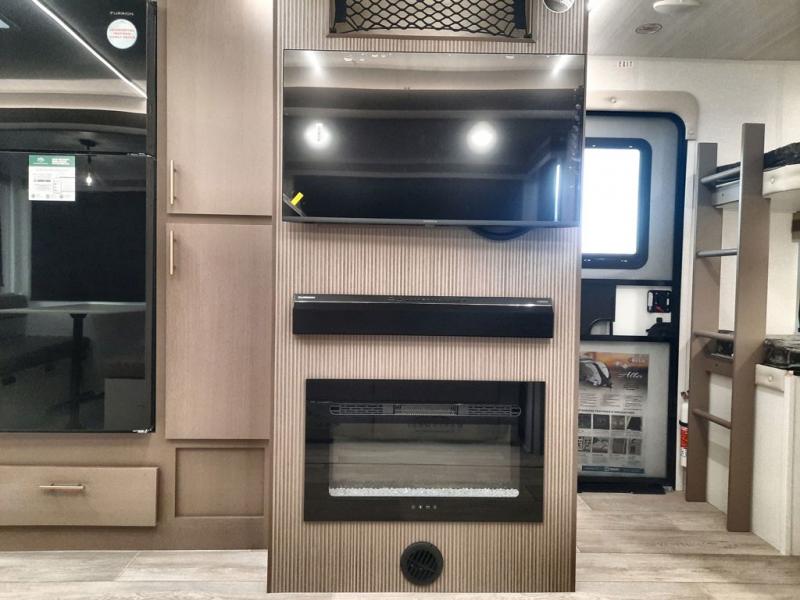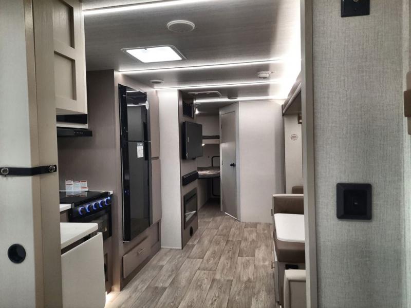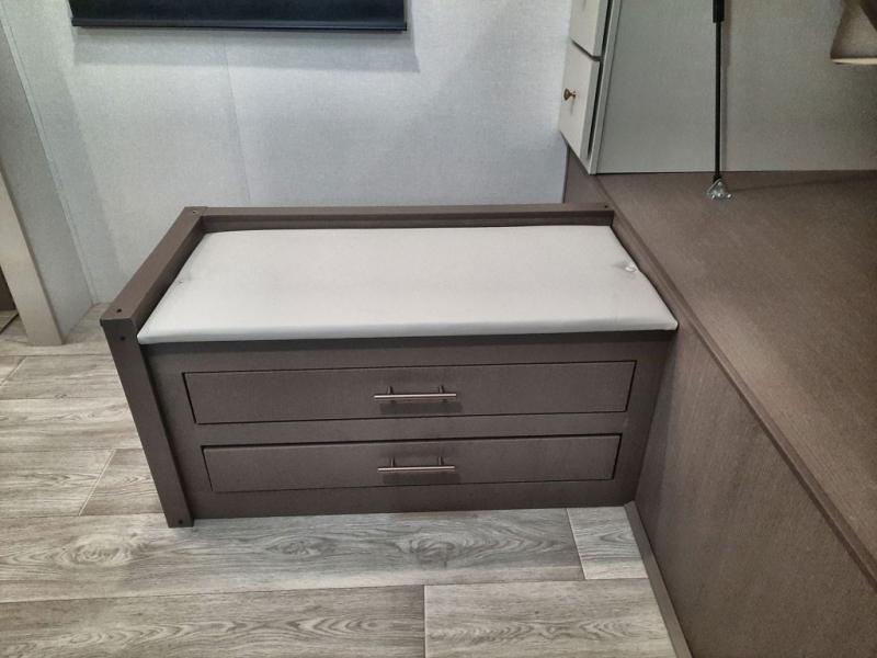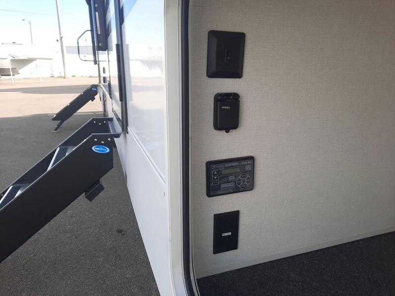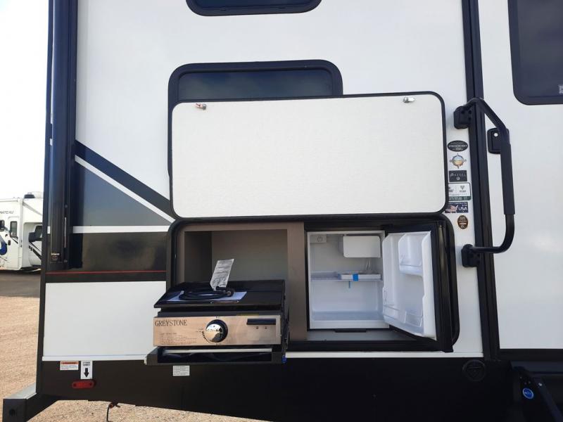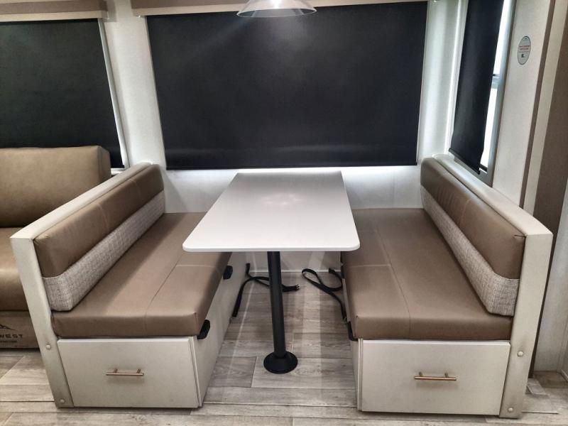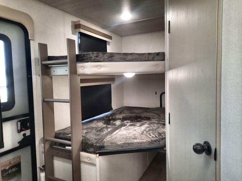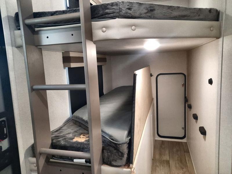This is the ultimate family-friendly travel trailer thanks to the double-size bunks with bike storage in the back. A king bed in the front bedroom will make you feel right at home, plus there are dual wardrobes and dual nightstands for your things. The large slide out in the main living area won't leave you feeling confined, and the tri-fold sofa and booth dinette will provide comfortable seating space. The chef of your group can start lunch on the outside kitchen while the kids grab their scooters from the pass-through storage. And don't forget there is a universal docking station to quickly access your utilities when needed.