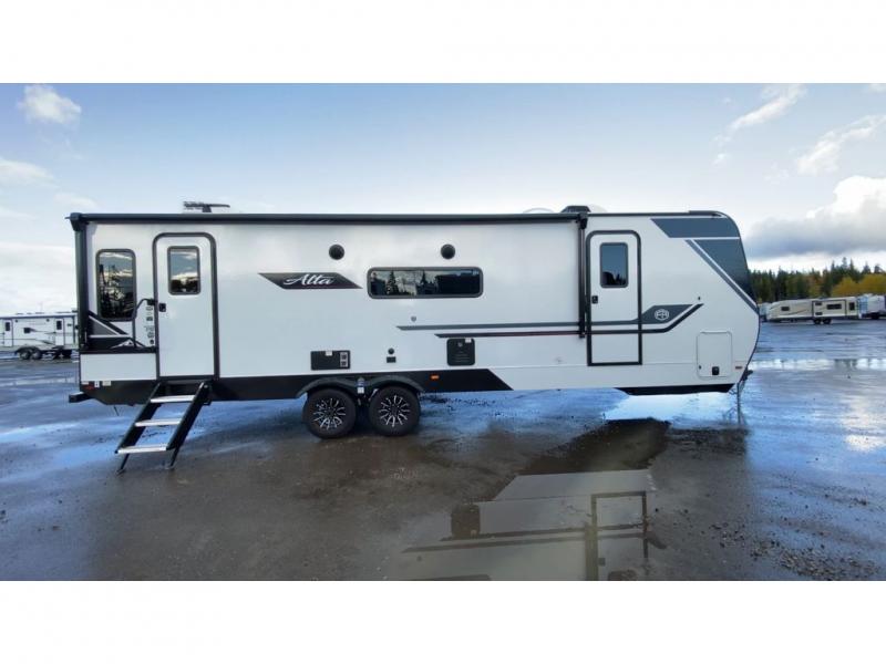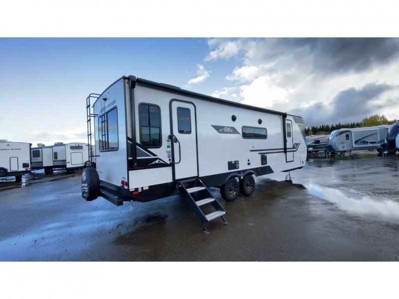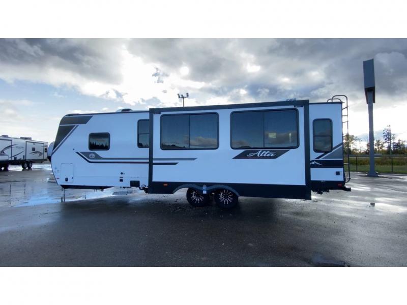Each Alta travel trailer or toy hauler by EAST TO WEST is constructed with a 5" vacuum bonded roof, an enclosed and heated underbelly, and diamond plate front rock guard for added protection. Outside, you'll find marine-grade exterior speakers, a universal docking station, and back-up camera prep that can be added to make maneuvering in and out of campgrounds easier than ever. Inside, there are 4k interior LED lights, solid pressed membrane countertops, black roller shades, and many more interior comforts you are sure to love.