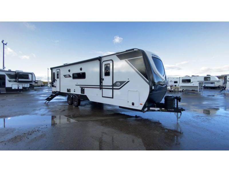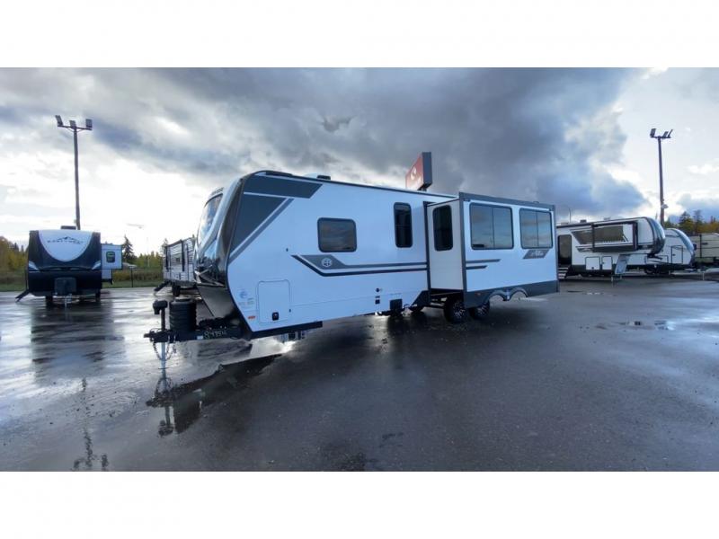 You'll feel right at home in this rear living travel trailer that includes theater seats and a front master bedroom with a king bed. The walk-through bath includes a medicine cabinet and a shower skylight to let natural light in, and the bedroom includes its own exterior entry door for convenience. When you're not relaxing outdoors under the 21' power awning with LED lights, you can play a game at the booth dinette or relax on the tri-fold sofa. This model also includes a pass-through storage for your larger camp gear and a universal docking station for easy access to your hookups.
