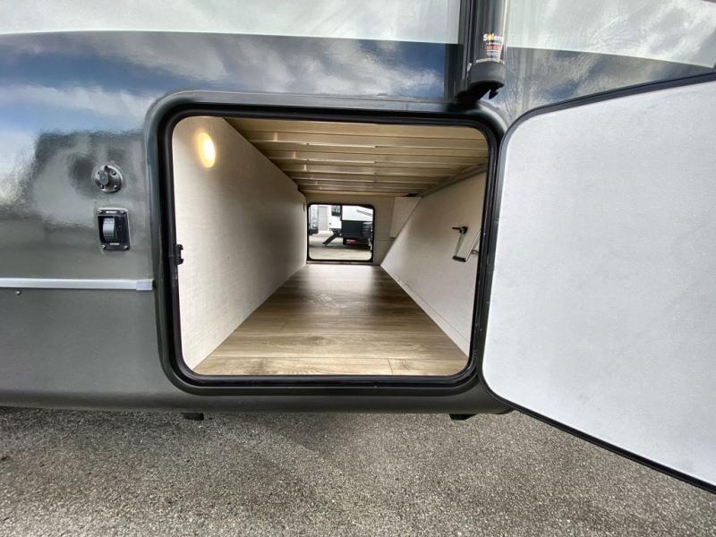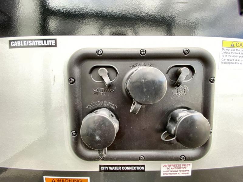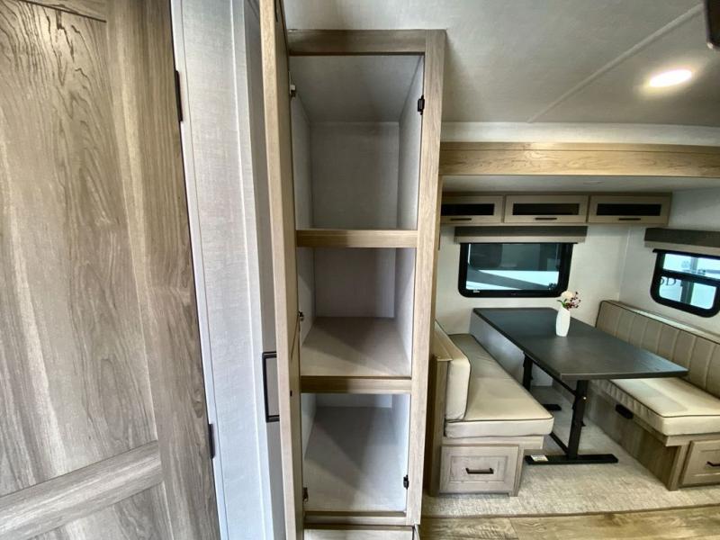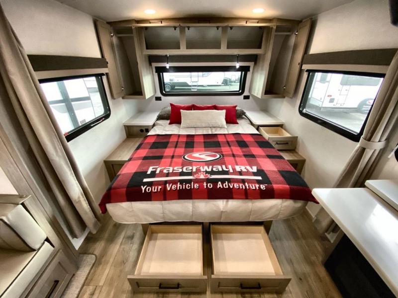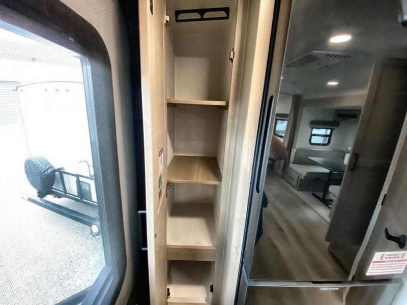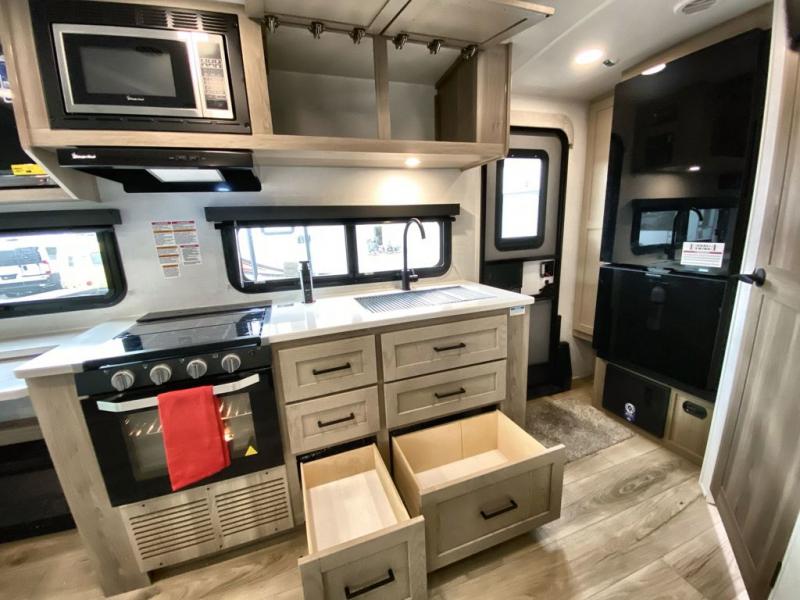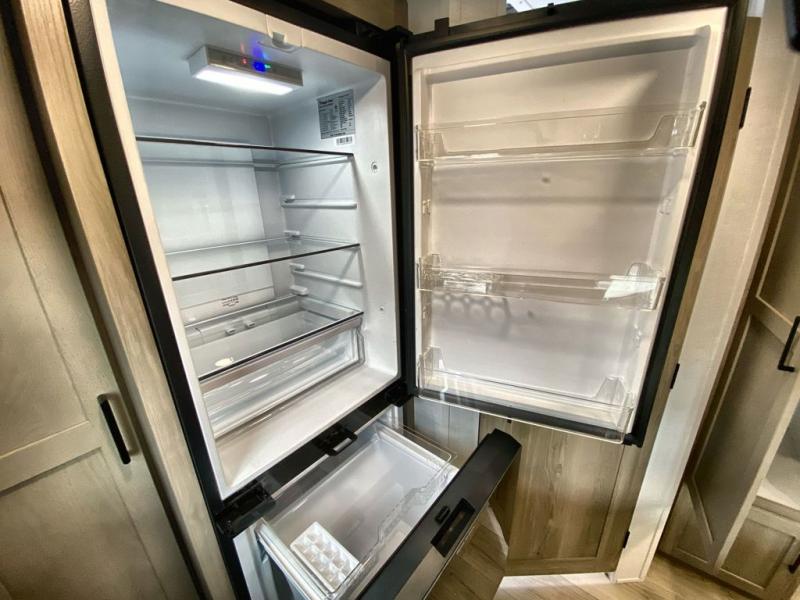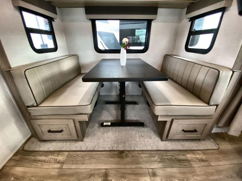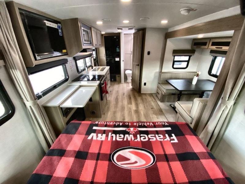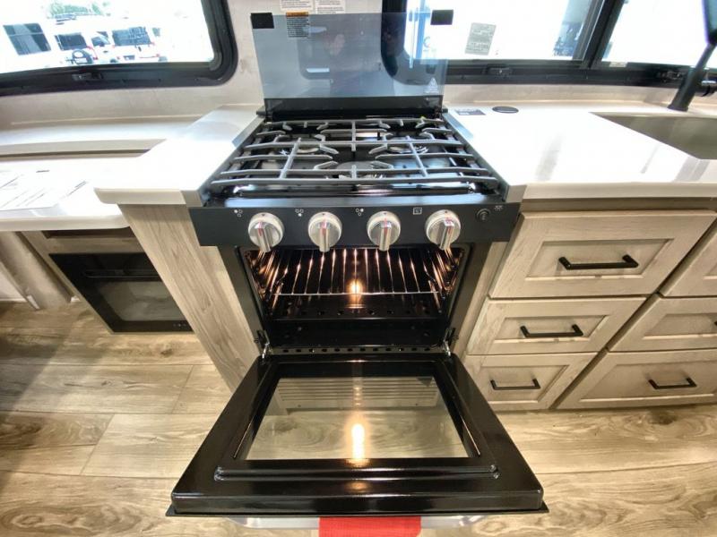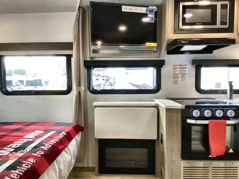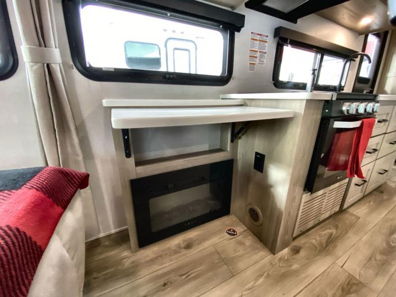 Enjoy the camping season with your spouse, friend, or significant other in this cozy travel trailer for two. Each morning, you can have your coffee on the 67" theater seats with a table within the slide out, then head outdoors to make pancakes on the outdoor griddle with an LP hookup. The interior kitchen includes a three burner cooktop, a microwave oven, plus a 12 volt refrigerator for perishables. An entertainment center with a fireplace will make your space feel more like home, and what's better than sleeping on your own queen bed with dual bedroom wardrobes for your clothes!?