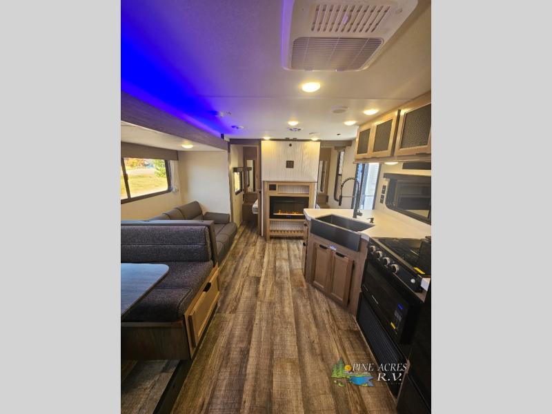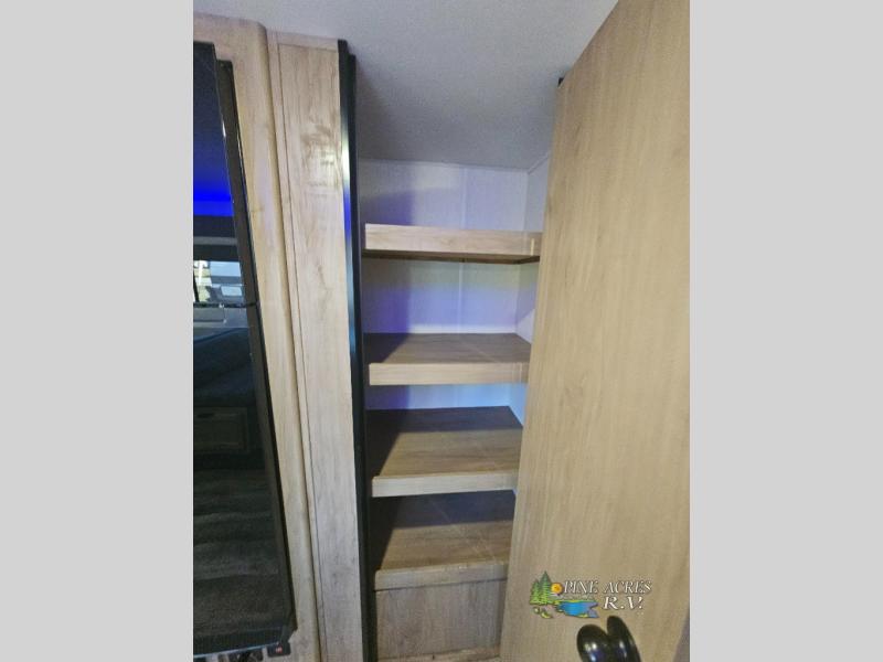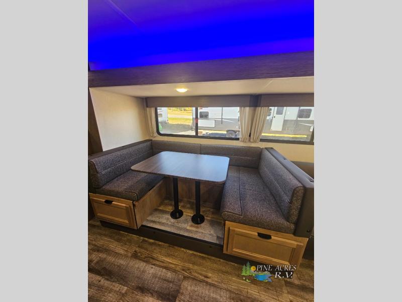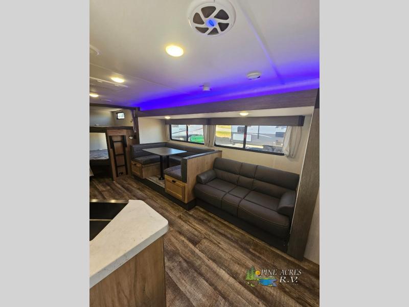 Come on inside this Cherokee Grey Wolf travel trailer and experience the convenience of a smooth flow of traffic in and out with two entry doors. The rear door leads into a full bath which is great for accessibility when outside and when you need to use the bathroom. Once inside, you will notice the large U-shaped dinette and the sofa which sit on the slide and create a spacious footprint for moving about, as well as great places to play games and socialize with your friends and family. A walk-in pantry provides plenty of storage allowing you to stock up on your favorite snacks and dry goods for your family adventure. At night, there is sleeping space for everyone between the double-size bunks and the queen-size bed, plus the furniture.