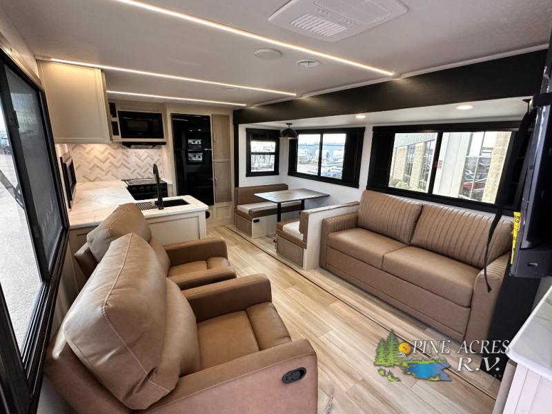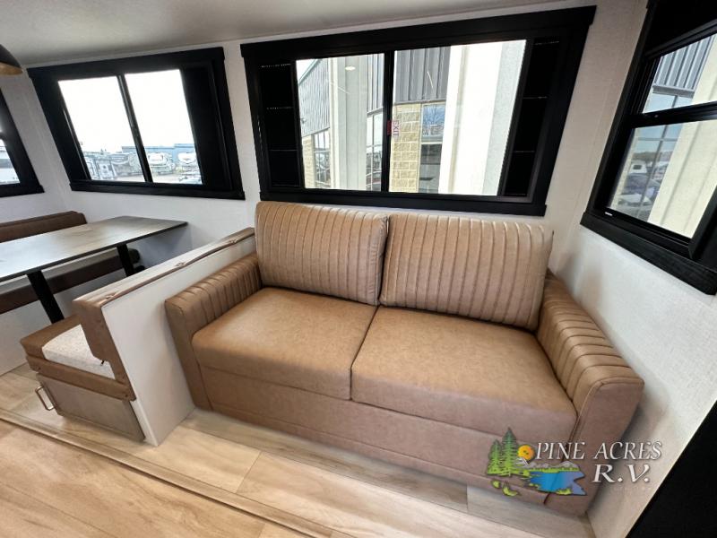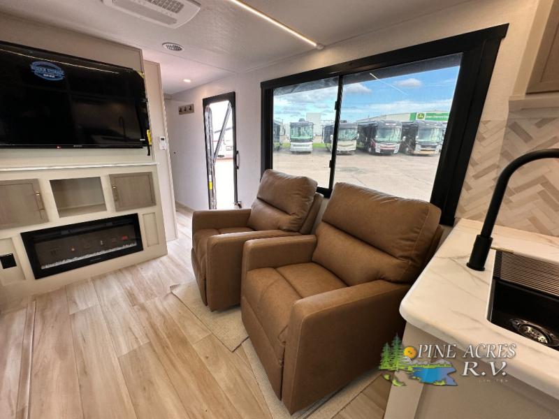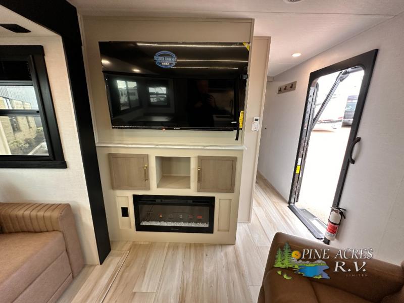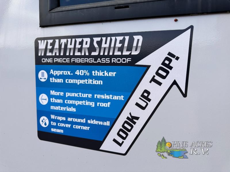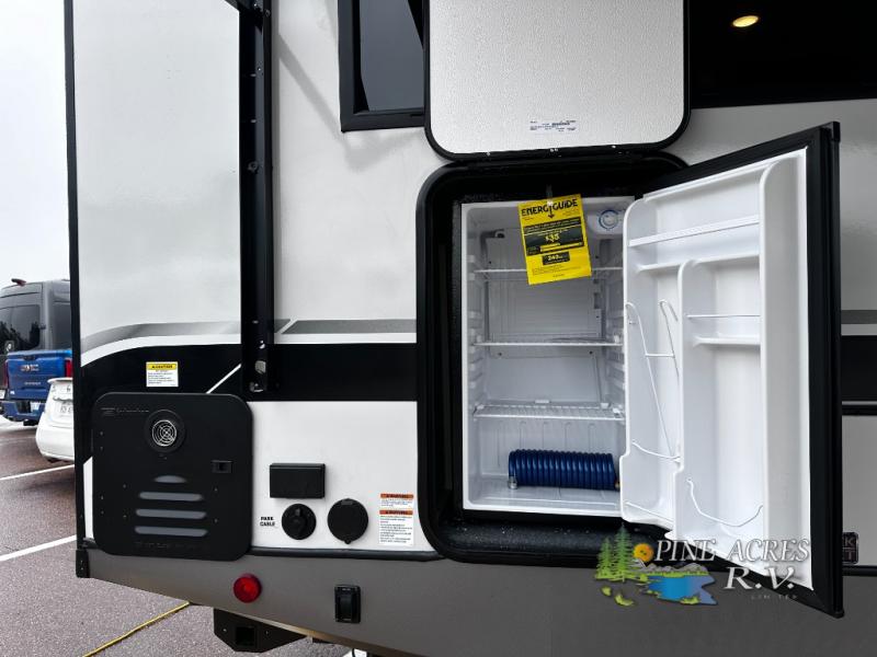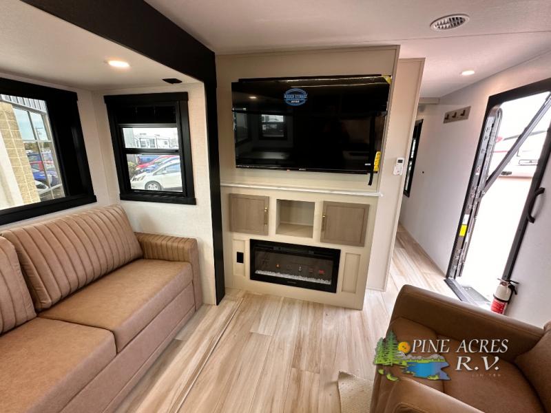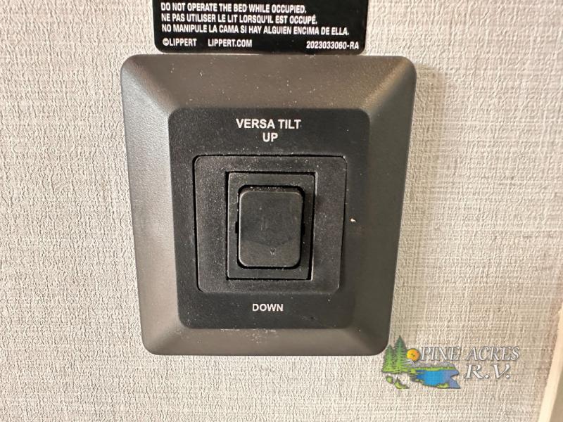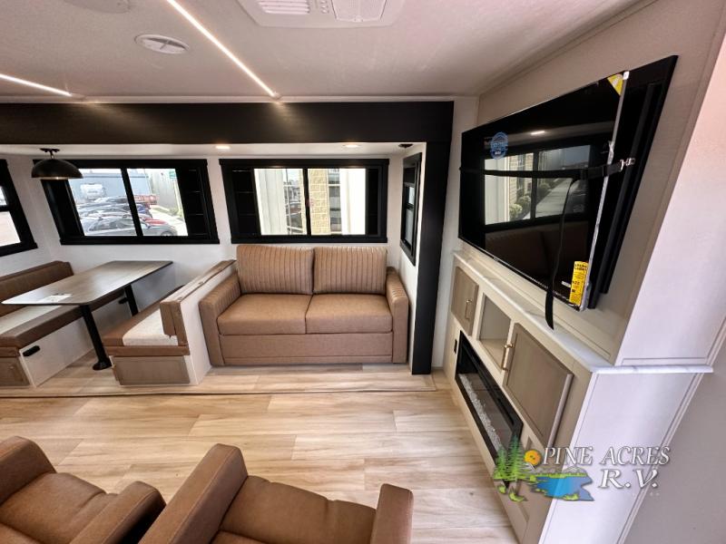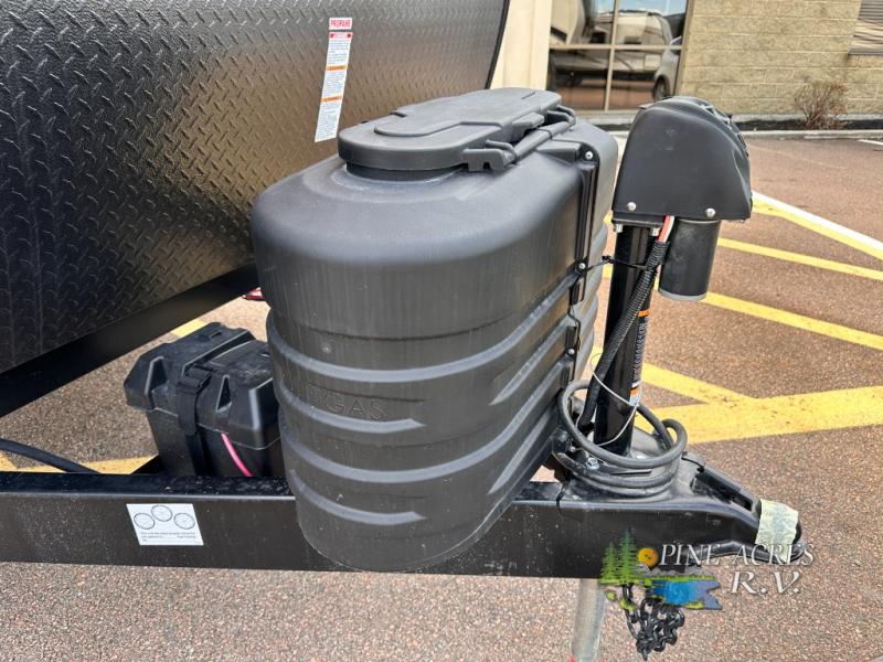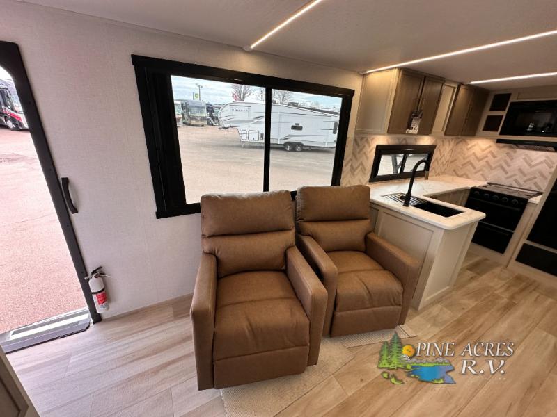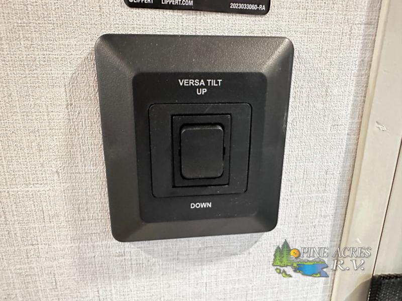 Camping trips just got better with this travel trailer in tow! You can cook in the rear kitchen with a three burner range, microwave oven, and a 10 cu. ft. 12V refrigerator. There is also a U-shaped counter to prep all your meals and a pantry to keep snacks close by. Your crew can relax on the tri-fold sofa or booth dinette within the large slide out, and there is an entertainment center with a 40" TV for movie night. Clean up each day in the spacious full bath, then head to the front private bedroom with a walk-around queen bed with Versa-Tilt. There are also dual wardrobes and a closet with washer and dryer prep. Head outdoors to find the 20' power awning, XL Texas size pass-through storage, and exterior griddle!