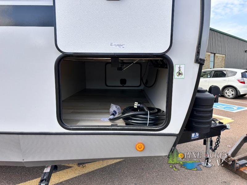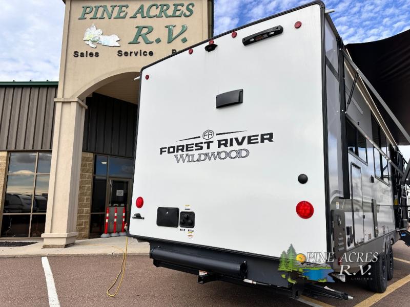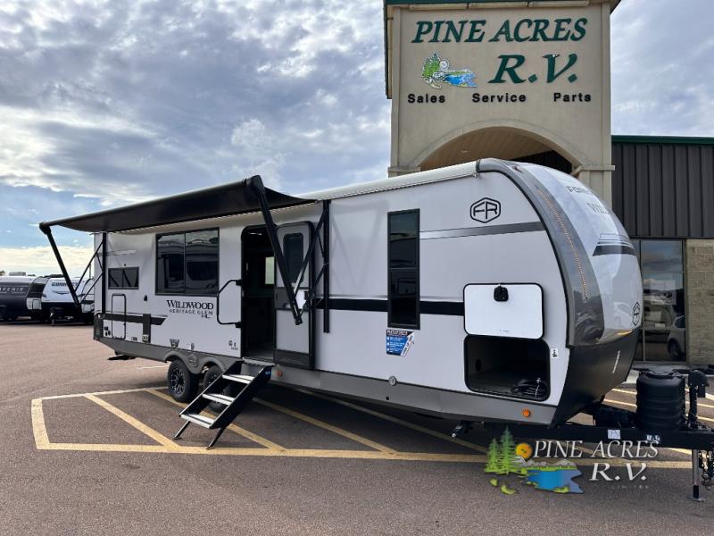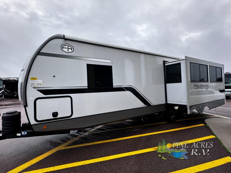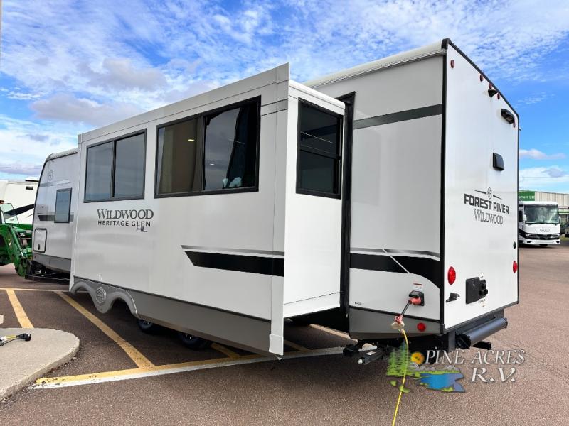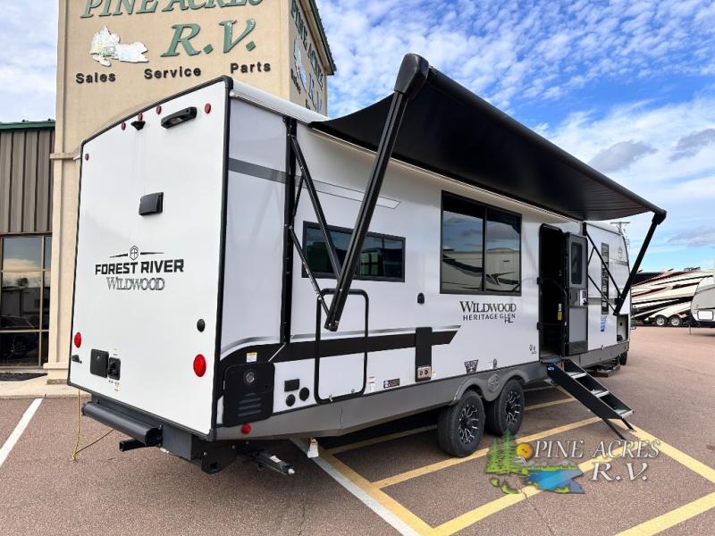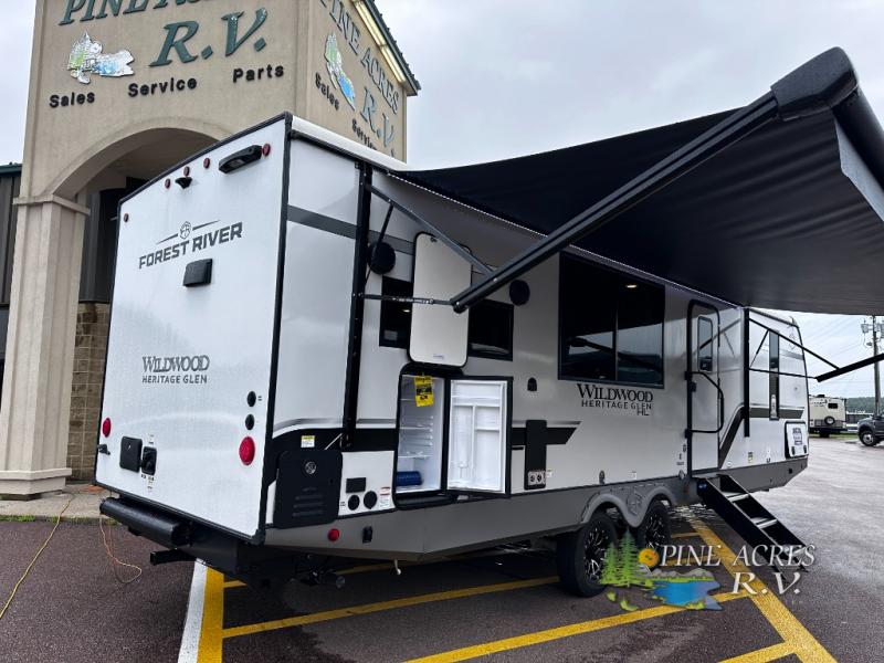 The Wildwood Heritage Glen Hyper-Lyte travel trailer by Forest River offers stability with a wide stance axle system, easy setup with a power tongue jack with an LED docking light, and safe entry with the Step Above aluminum entry steps. The interior includes Temple Cherry cabinetry with matte gold hardware, hidden hinges on the cabinet doors, and a residential single bowl undermount sink. You will also find a back-up camera prep and solar prep, an outdoor shower, Maxxis radial tires, and many more exterior conveniences.