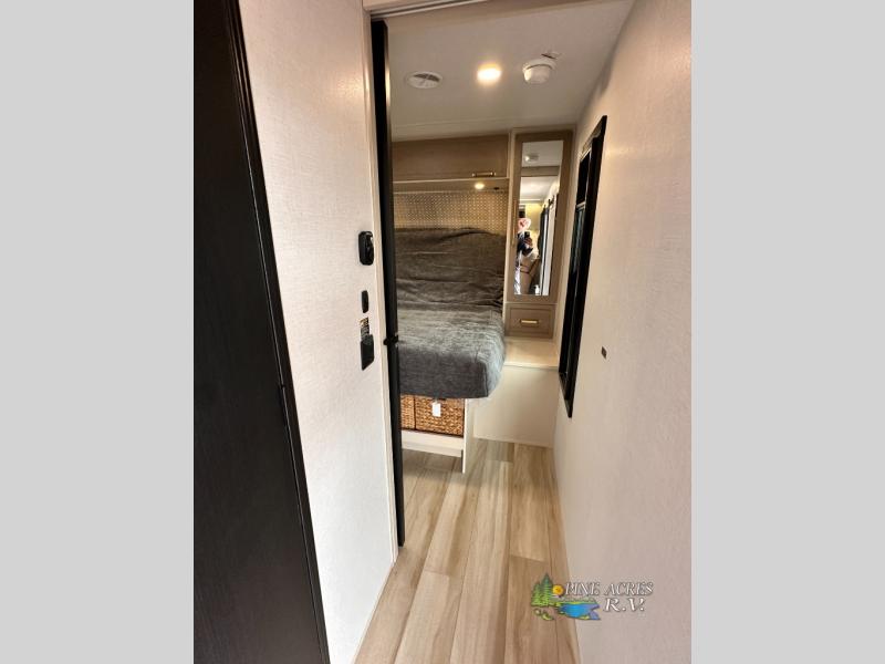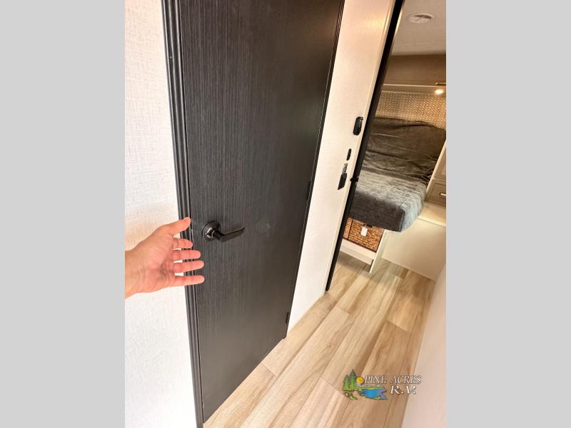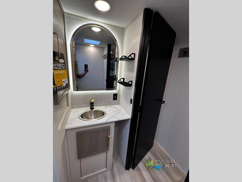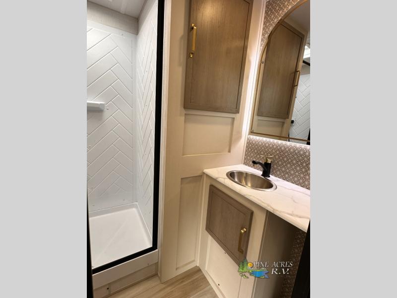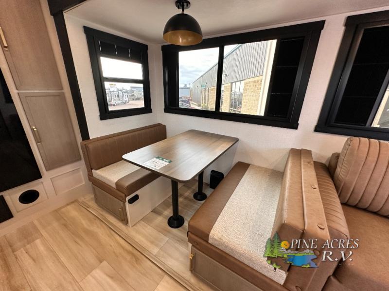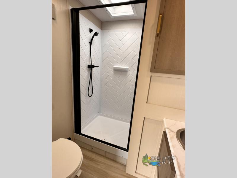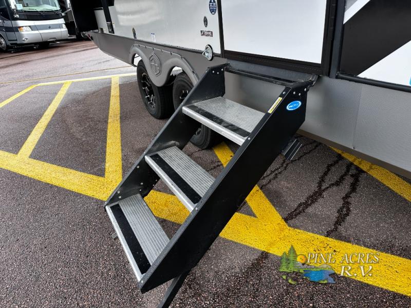 The Wildwood Heritage Glen Hyper-Lyte travel trailer by Forest River offers stability with a wide stance axle system, easy setup with a power tongue jack with an LED docking light, and safe entry with the Step Above aluminum entry steps. The interior includes Temple Cherry cabinetry with matte gold hardware, hidden hinges on the cabinet doors, and a residential single bowl undermount sink. You will also find a back-up camera prep and solar prep, an outdoor shower, Maxxis radial tires, and many more exterior conveniences.