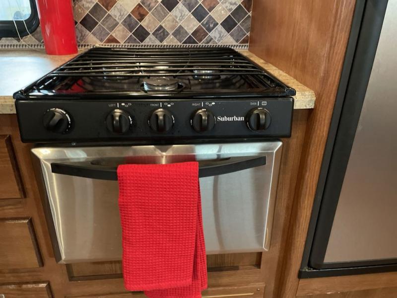 As you enter the travel trailer, along the rear wall you will find two lounge chairs and an end table plus an overhead cabinet which allows you to tuck away those extra items. The slide has a sofa and a dinette, and both convert into additional sleeping space. On the opposite side of the travel trailer there is a double kitchen sink, three burner range, microwave, refrigerator, pantry, and corner wardrobe for your camping clothes.