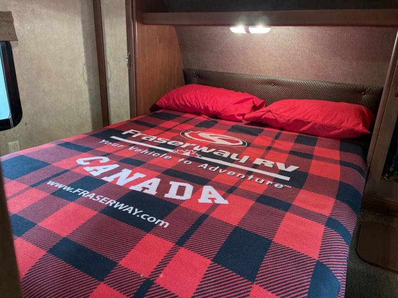 In the front, you will find the bedroom with a queen bed, two wardrobes for your hang up clothes, and an overhead cabinet.