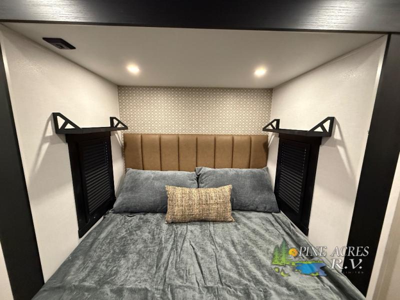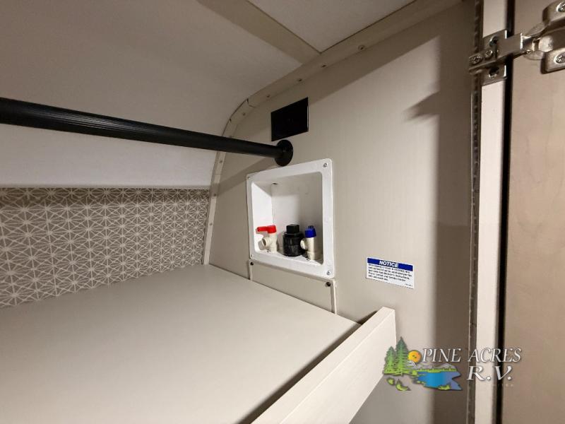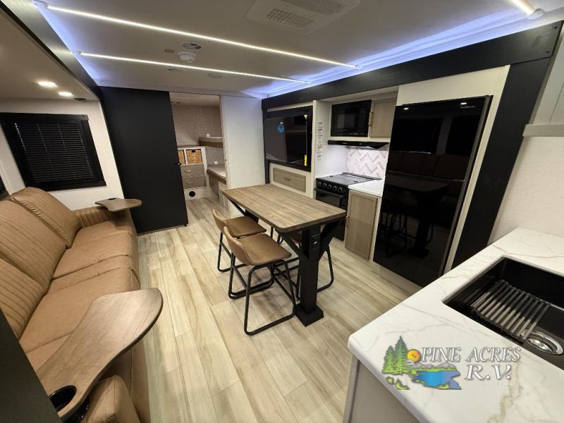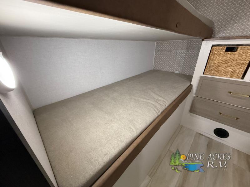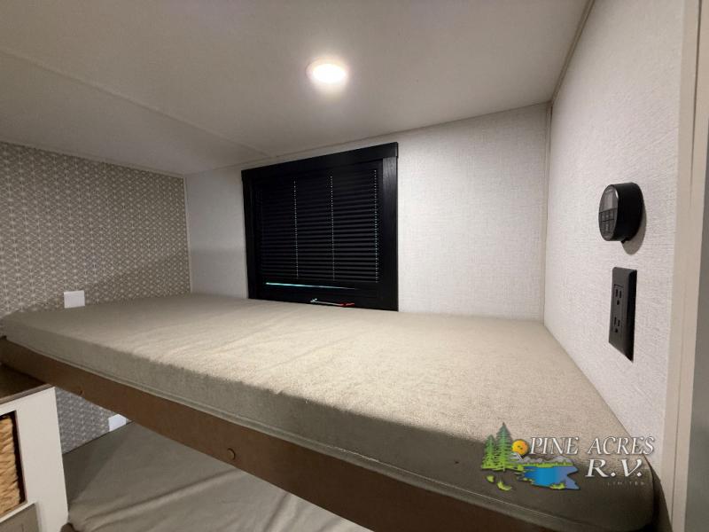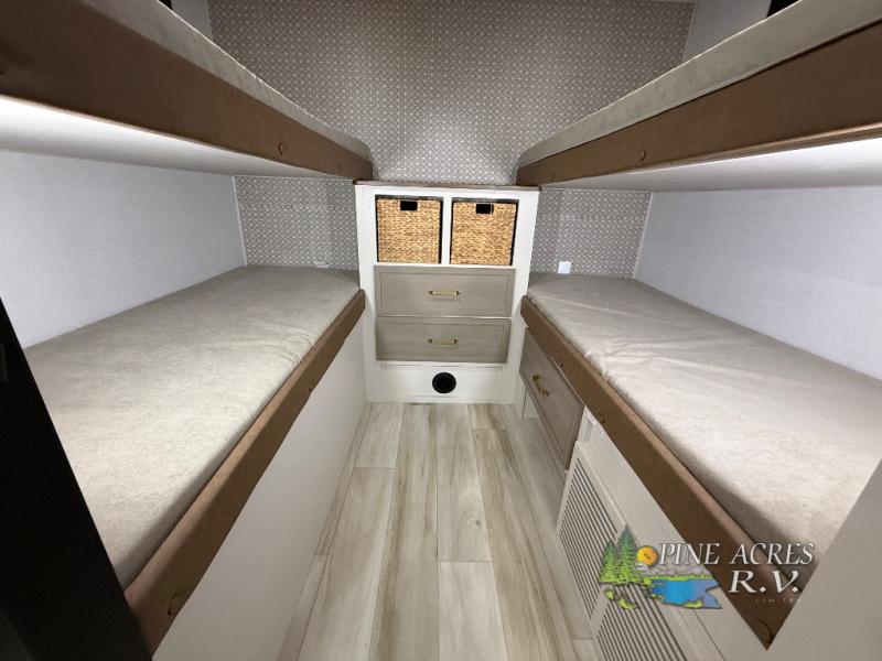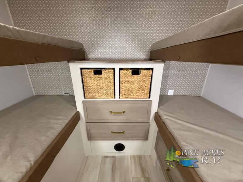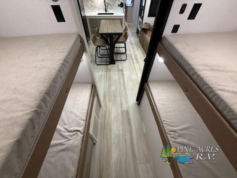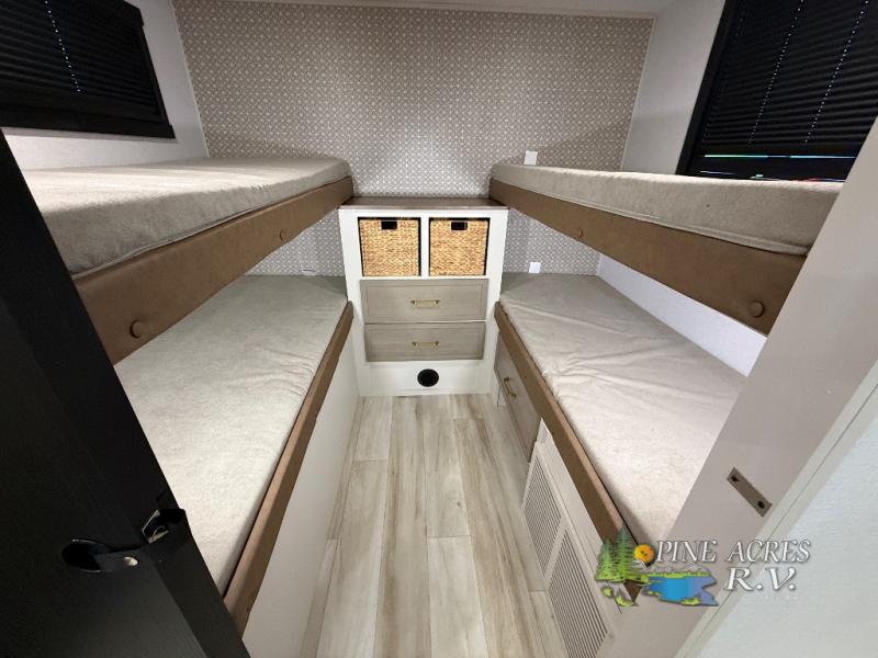 This is the perfect travel trailer if you enjoy camping with a larger group! The rear private bunkhouse includes four bunk beds plus a dresser to keep this space tidy. You'll have the queen bed slide out in the front bedroom all to yourselves, along with a dresser and an ottoman, plus a front wardrobe with washer/dryer prep. Everyone can meet in the combined kitchen and living area that includes spacious theater seating, a kitchen island with four chairs, full kitchen amenities, and dual opposing slides for more space!