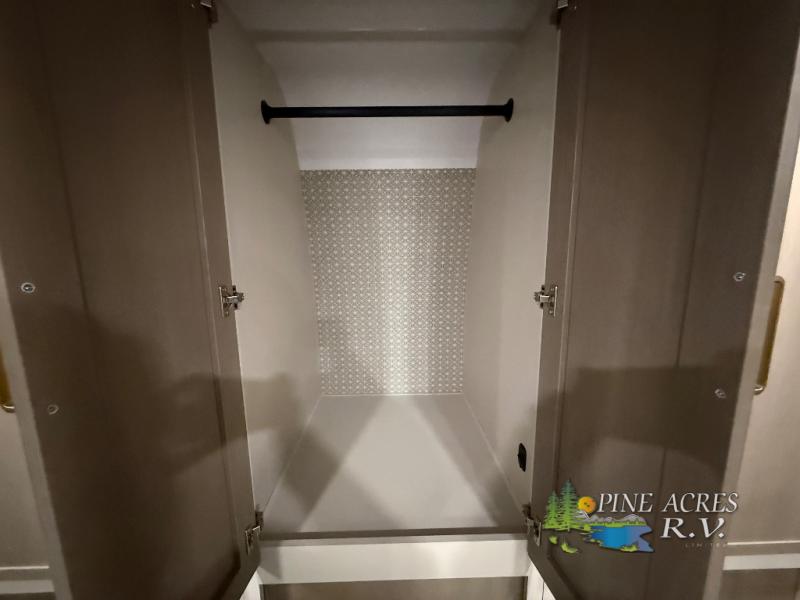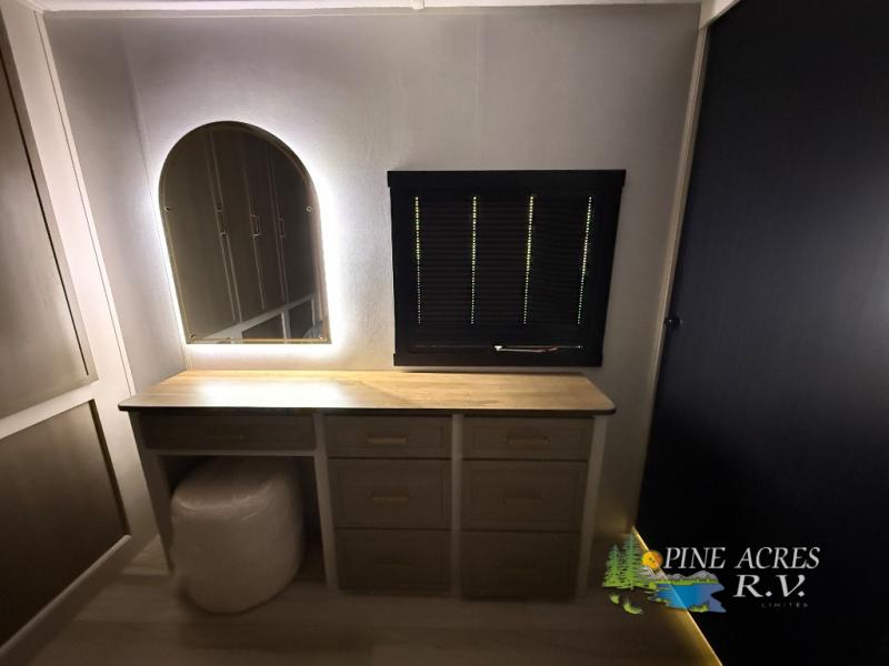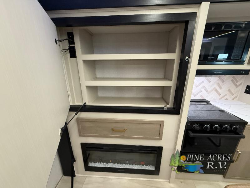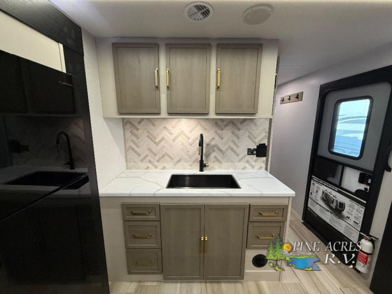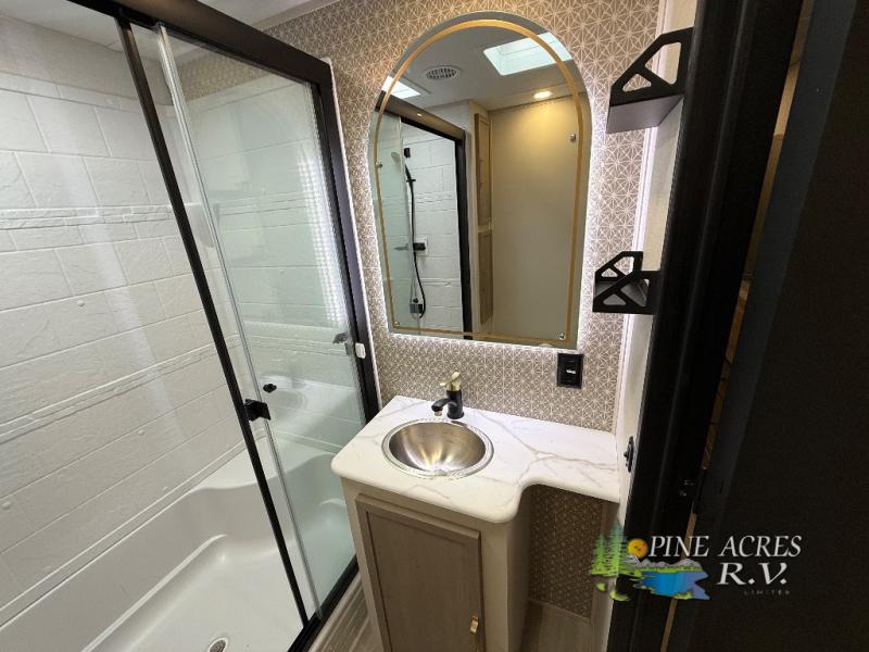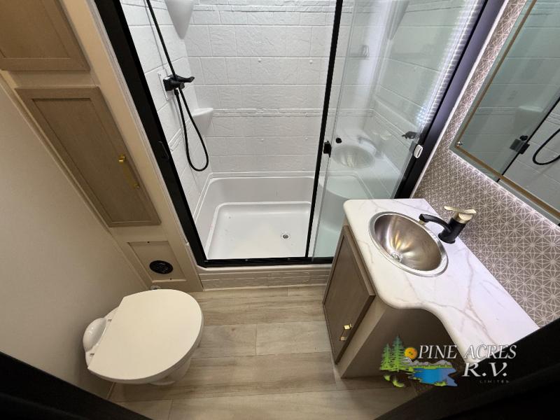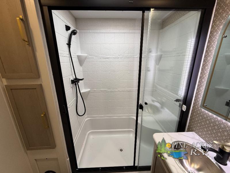 With any Wildwood Heritage Glen travel trailer by Forest River, the quality construction, attention to detail and design along with a bright and welcoming interior allows you to relax in comfort. Each model includes a WeatherShield one piece fiberglass roof, nitrogen-filled radial tires, and an enclosed underbelly with 12V tank heaters on all holding tanks for added protection. You will appreciate the on-demand tankless water heater, along with power stabilizer and tongue jacks, and an extra-large pass-thru storage with slam latch baggage doors. Head inside to enjoy matte gold hardware, wood door casings in place of plastic door casings, and an ultimate interior lighting upgrade with 4k puck/strip lights and a stylish LED back-lit bath mirror!