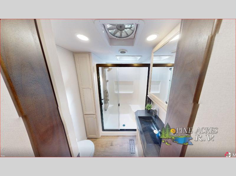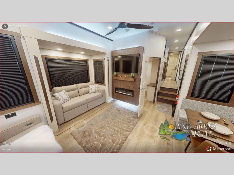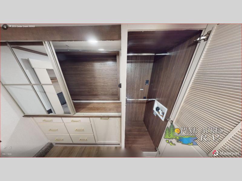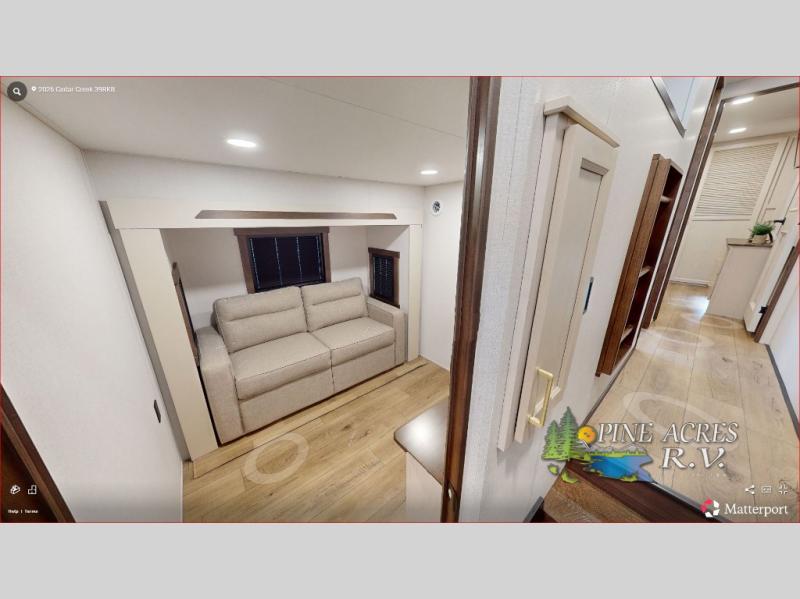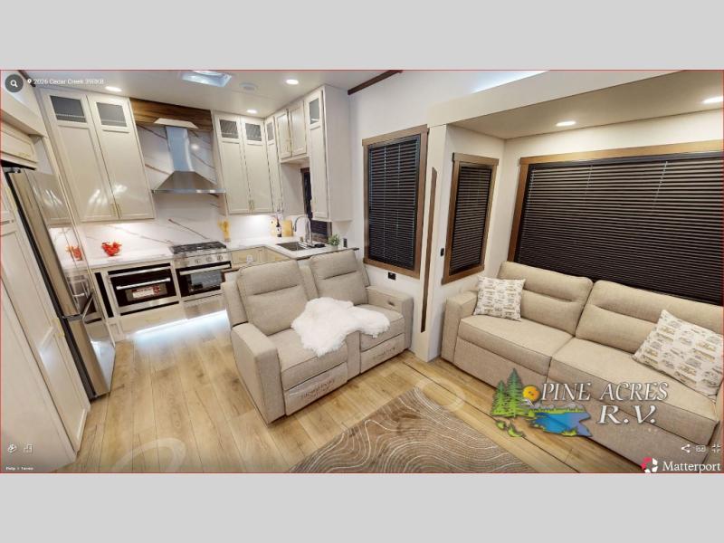 With any Cedar Creek fifth wheel by Forest River, you will bet met with luxury features both inside and out! The True Gelcoat exterior is the best of the best in exteriors and the 3M bonded sidewalls will hold up over years of use. There is also a new 101'' wide-body frame, a Road Warrior suspension, plus a TST tire pressure monitoring system to make towing that much easier. You will find a hidden front storage compartment, along with a 4' x 6' ABS, ribbed, removable underbelly panels, and 6-point hydraulic leveling system, plus many more exterior conveniences. The interior will have you feeling like you haven't left home with vinyl floor coverings, power theater seating with USB ports, a cozy fireplace, vinyl floor covering and the list of comforts goes on! Each model is also pre-wired for satellite to the roof, and you're sure to never go bored with a Smart TV in the bedroom!