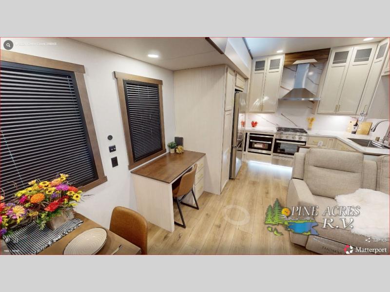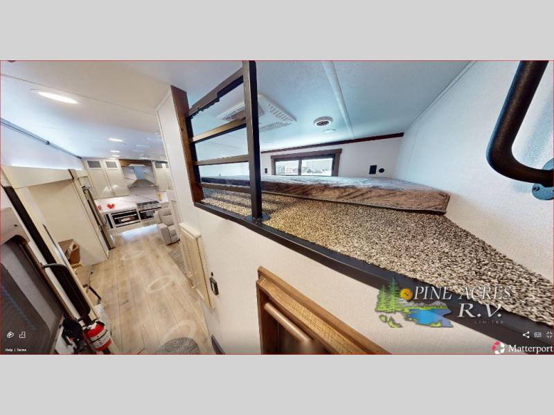 A front kitchen with ample counter space, a middle den, and a front bedroom make this fifth wheel one to remember! The living area will be a favorite spot to visit together since there is a hide-a-bed sofa and theater seating, plus an entertainment center with a fireplace. There is also a free-standing dining table and a desk with a chair if you need to telecommute. Your guests will love the middle den with a hide-a-bed sofa and a closet for their things, plus there is a loft above this room for added sleeping or storage space. A spacious full bath includes a shower with a seat, and the king bed slide out in the front private bedroom is sure to bring a great night's rest.