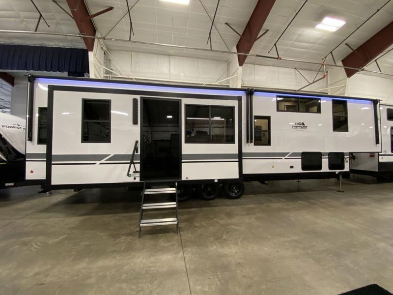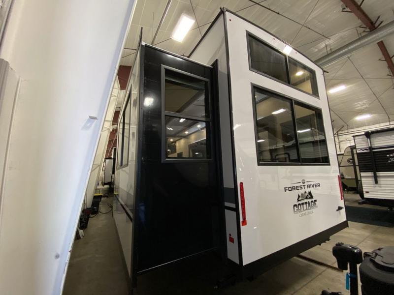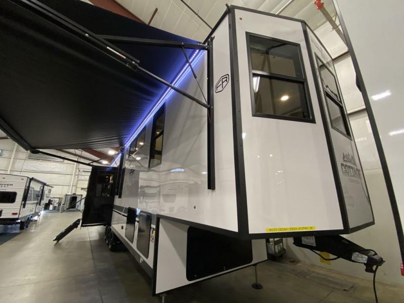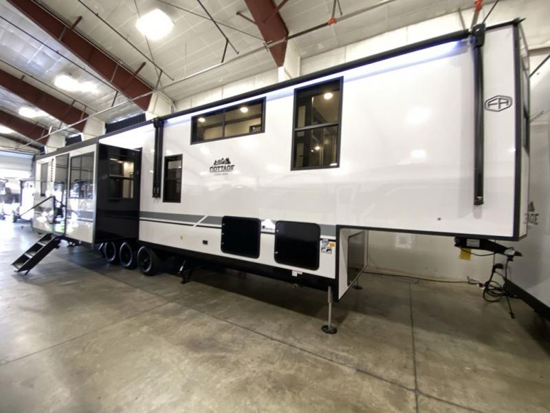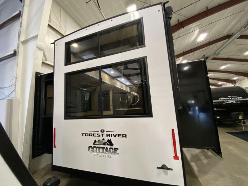 The Cedar Creek Cottage 412FWC is a luxury destination-style fifth wheel fashioned for extended stays and comfort-first living. Its thoughtful layout—featuring a mudroom, expansive living area, dedicated work and entertainment zones, and a private master suite—captures the essence of residential living on the road.