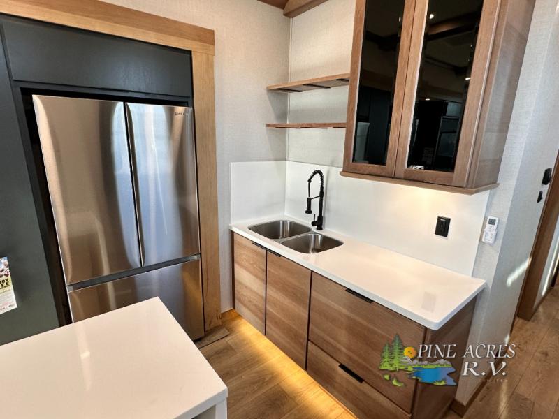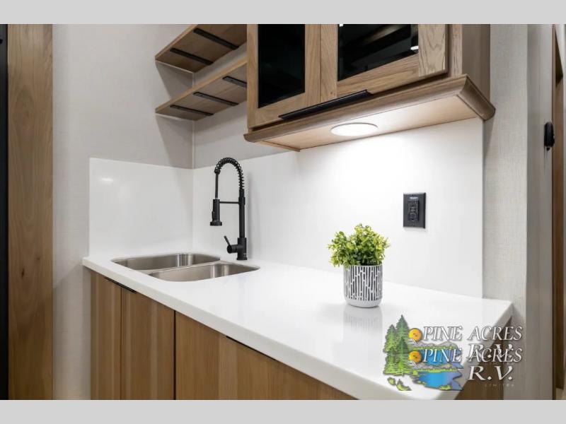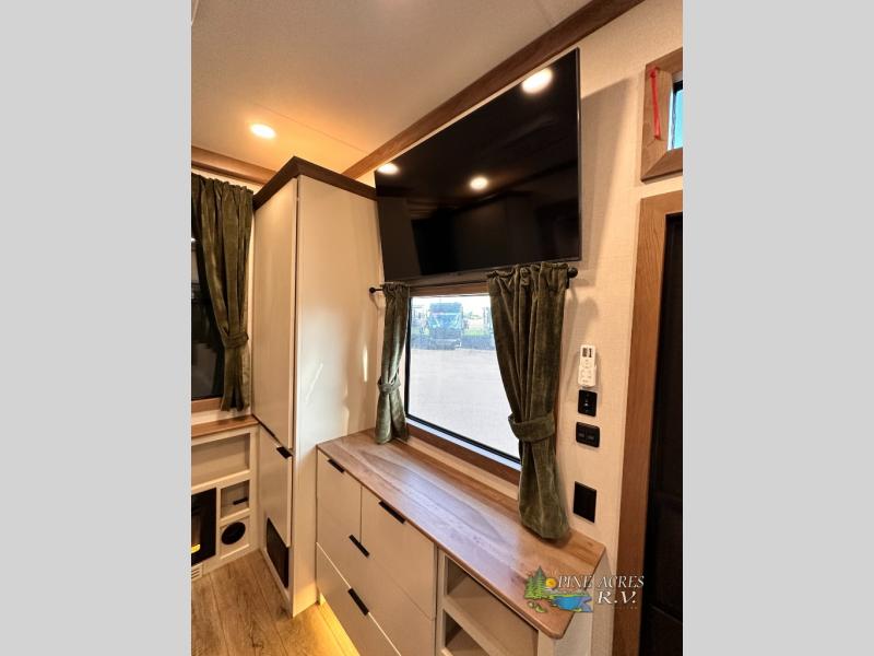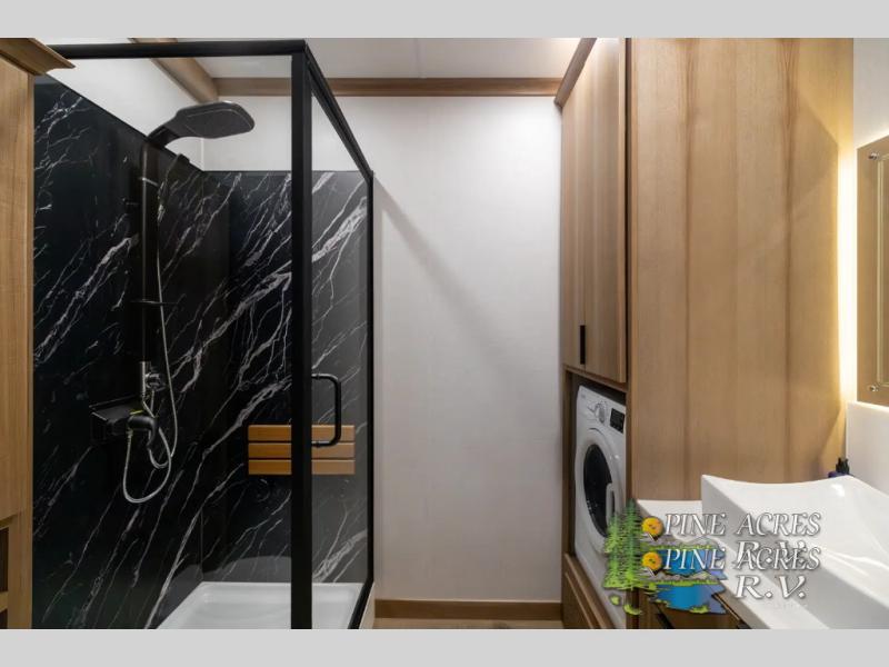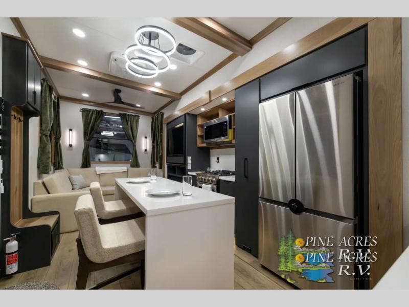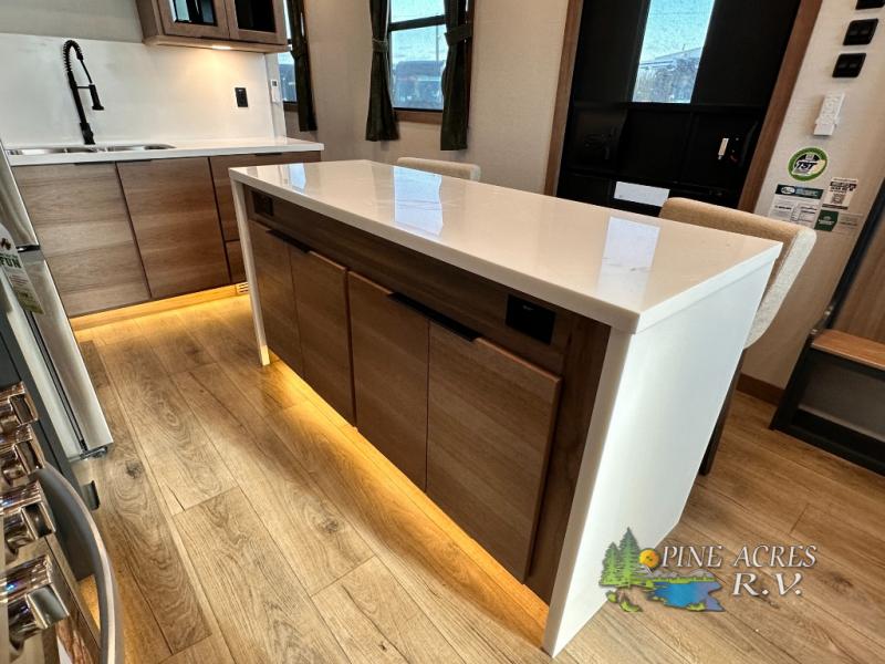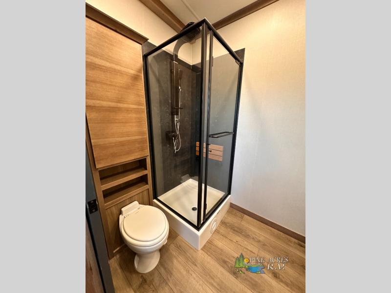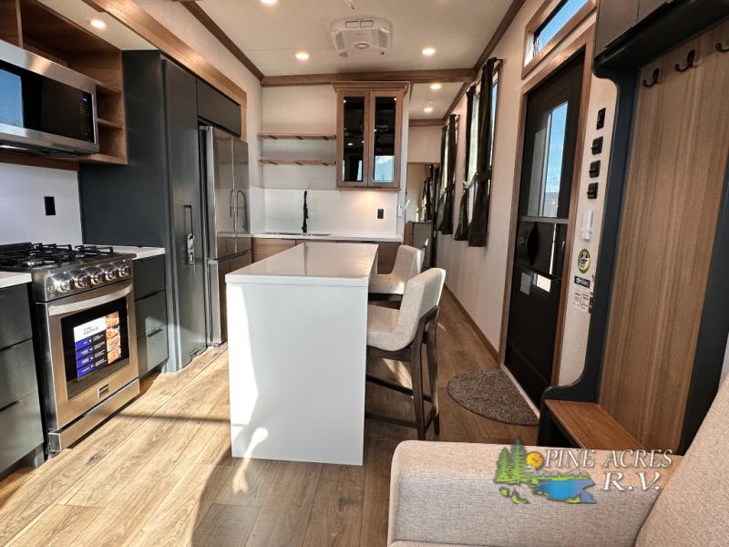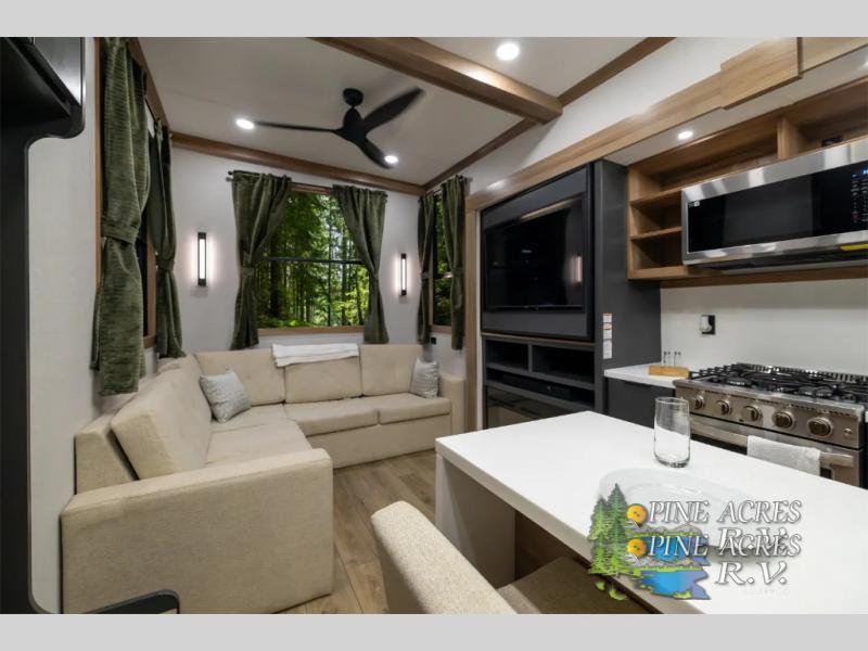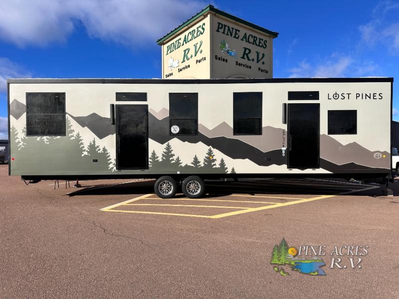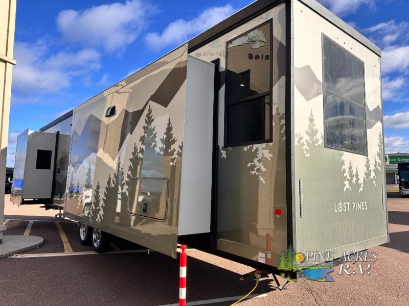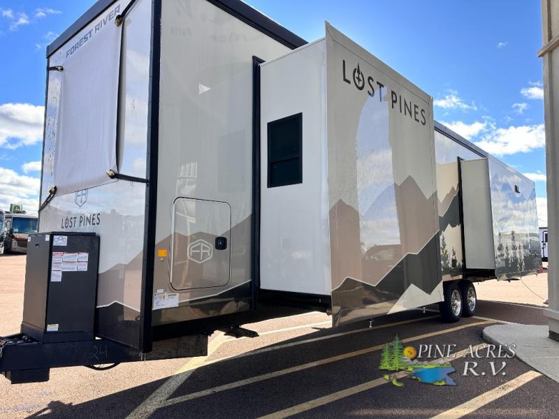 Luxury abounds in the Lost Pines destination trailer by Forest River. Each model features 3" hung wall construction, a rolled fiberglass roof, a thermofoil lined underbelly, and an Azdel gel coat fiberglass exterior wall for added durability. The full-body paint with 4x Clear Coat is sure to turn heads as you travel to your destination, and the LCI Road Armor suspension system will provide a smooth tow. You'll also find dual 40 lb. LP tanks outside, along with a heated full docking station, and MORryde entry steps and Safe-T-Rail. The interior of the Lost Pines is outfitted with luxury vinyl flooring, residential appliances, LED lighting throughout, plus upgraded solid surface countertops and backsplash!