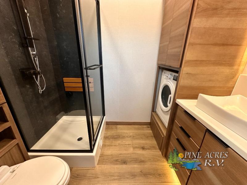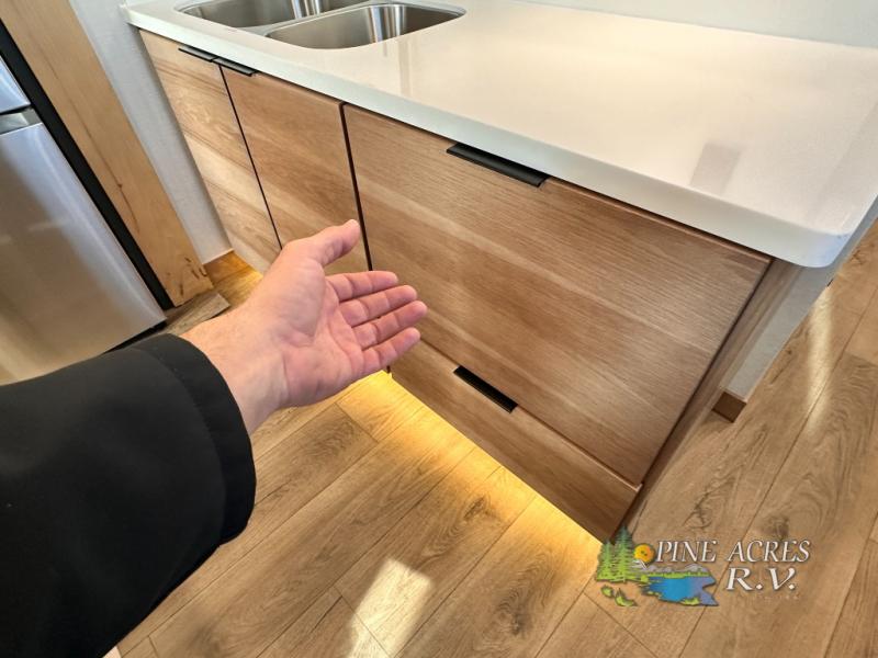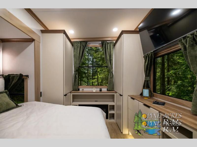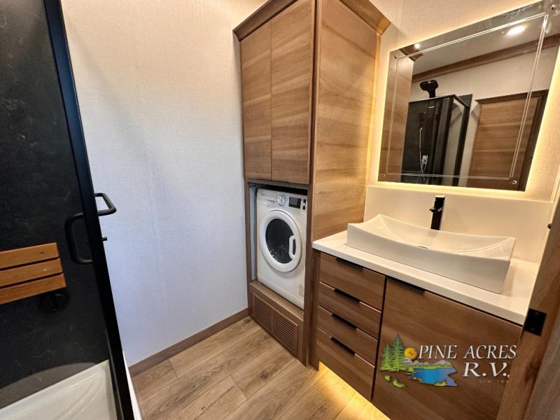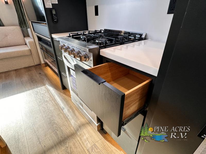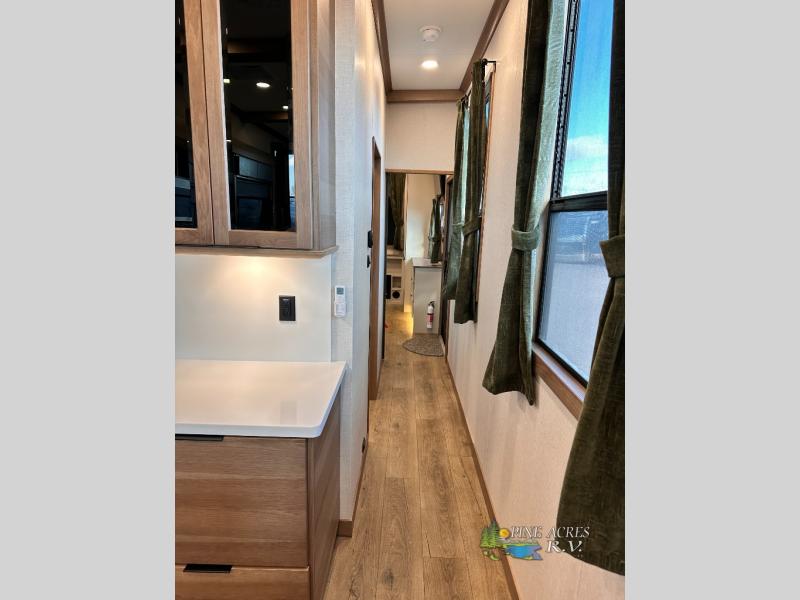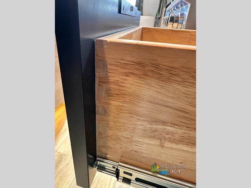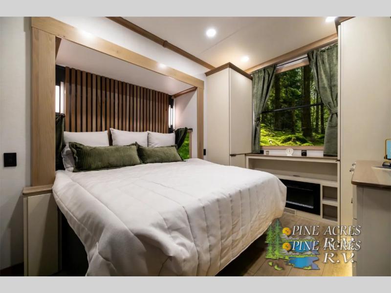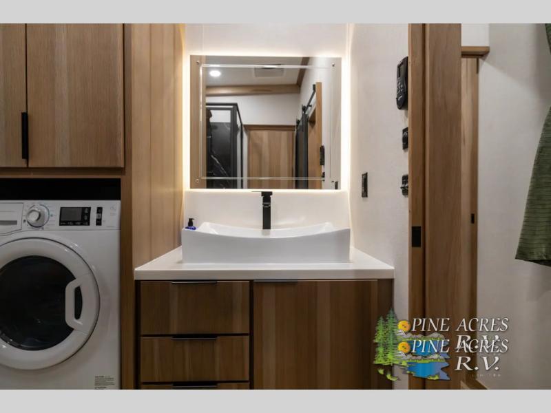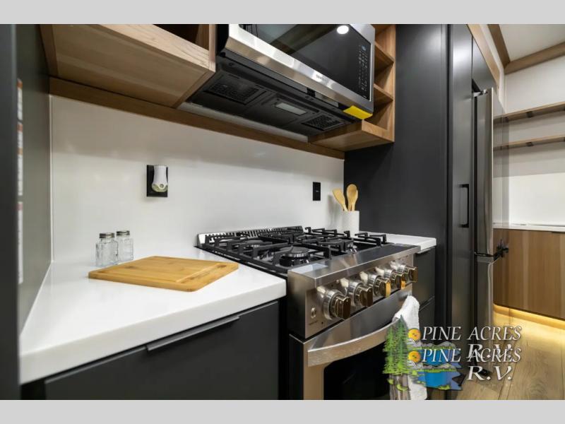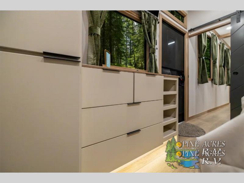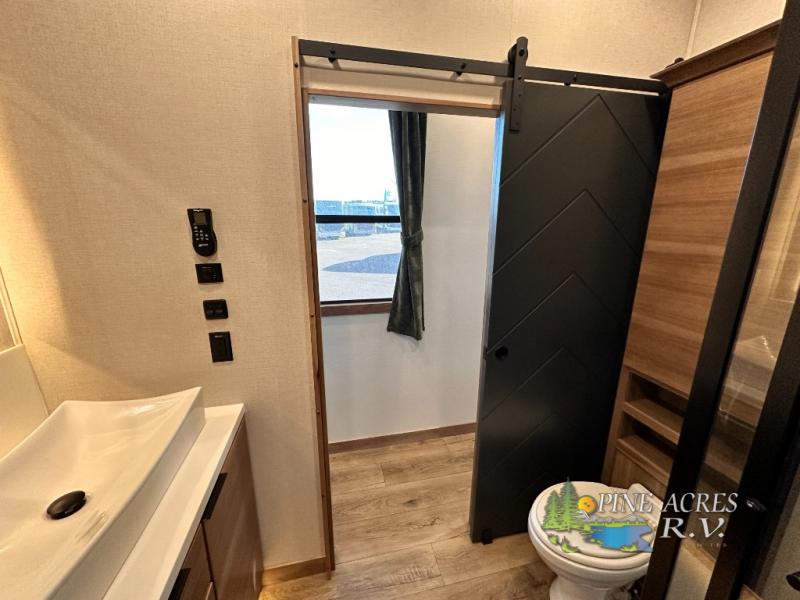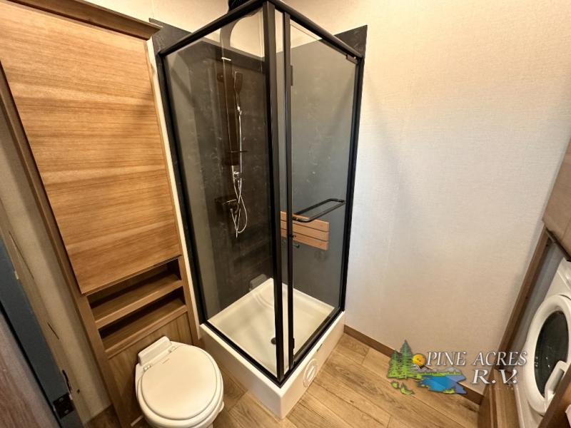 Luxury abounds in the Lost Pines destination trailer by Forest River. Each model features 3" hung wall construction, a rolled fiberglass roof, a thermofoil lined underbelly, and an Azdel gel coat fiberglass exterior wall for added durability. The full-body paint with 4x Clear Coat is sure to turn heads as you travel to your destination, and the LCI Road Armor suspension system will provide a smooth tow. You'll also find dual 40 lb. LP tanks outside, along with a heated full docking station, and MORryde entry steps and Safe-T-Rail. The interior of the Lost Pines is outfitted with luxury vinyl flooring, residential appliances, LED lighting throughout, plus upgraded solid surface countertops and backsplash!