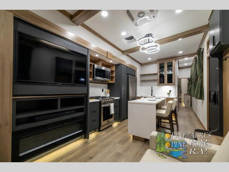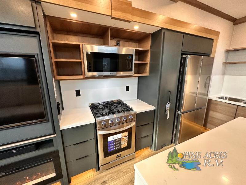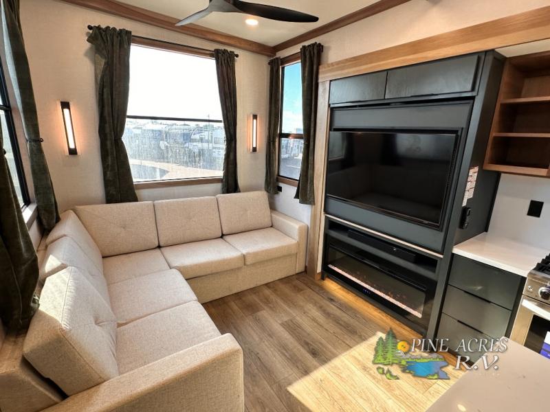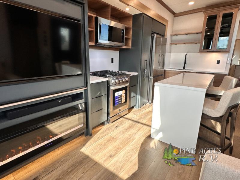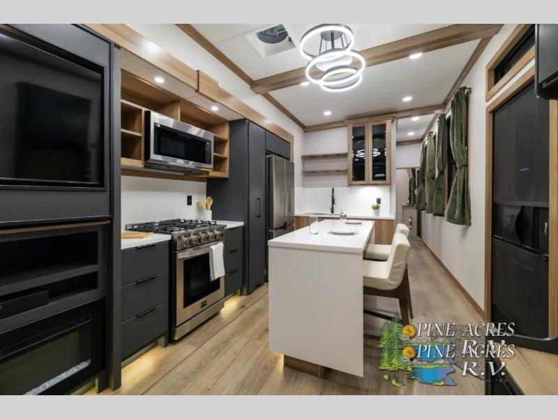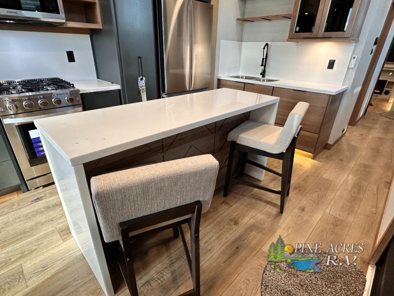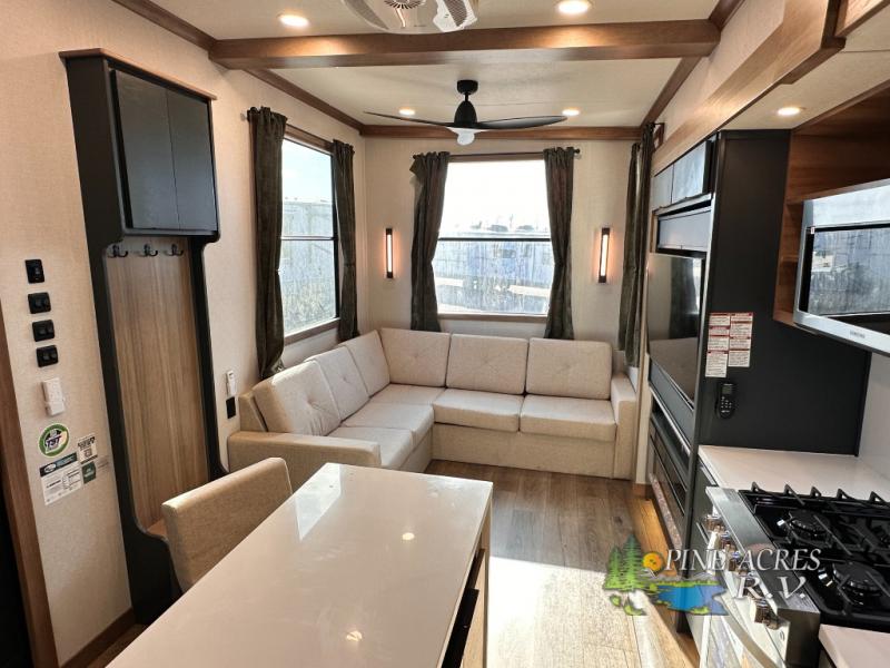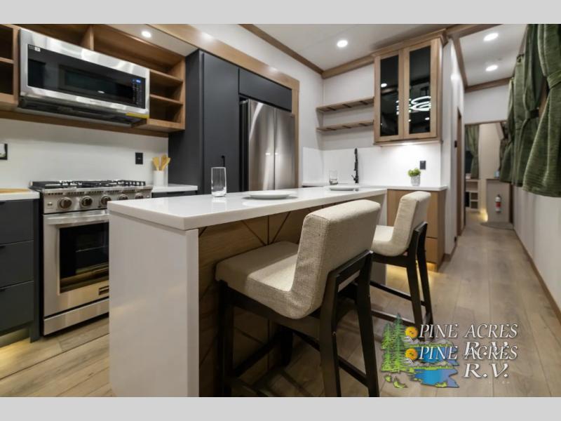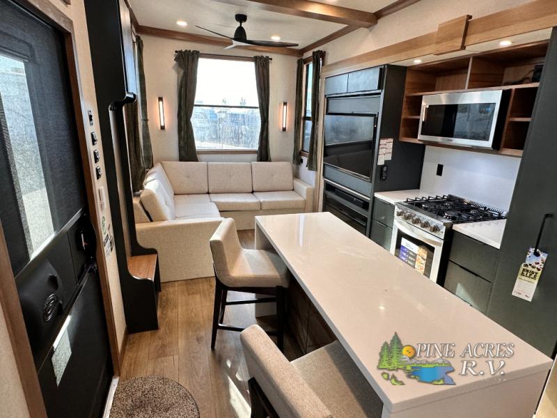 It won't be hard to find comfort in this dual slide, dual entry destination trailer! One of the entry doors conveniently opens to the front private bedroom where you'll find a queen bed slide out with a king bed option, dual closets with shelves in between, plus a dresser to keep everything tidy. If you have guests staying over, they can sleep on the L-shaped sleeper sofa in the rear living area, which is also directly across from the entertainment center for easy viewing. The chef of your group will love the spacious kitchen, complete with all the kitchen appliances to create their best meals and a large kitchen island with four chairs.