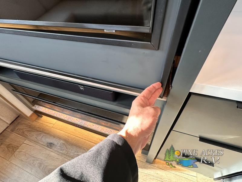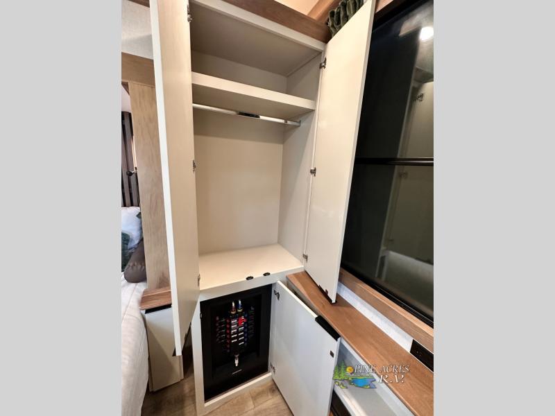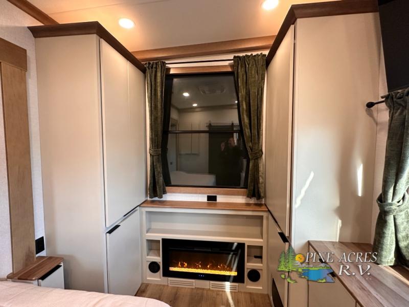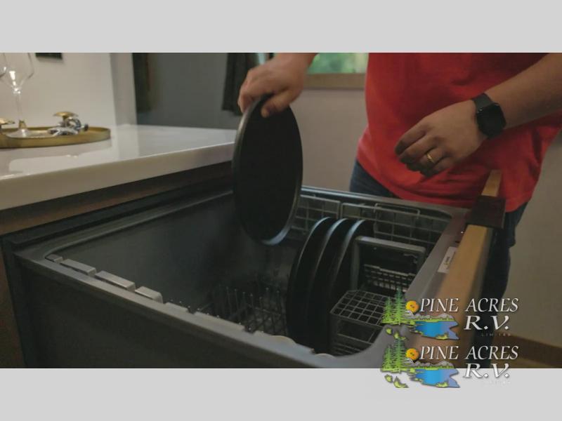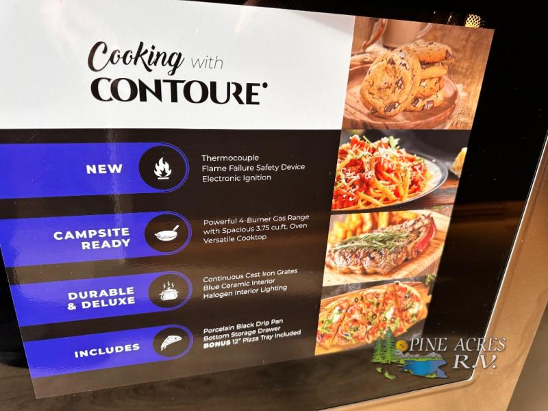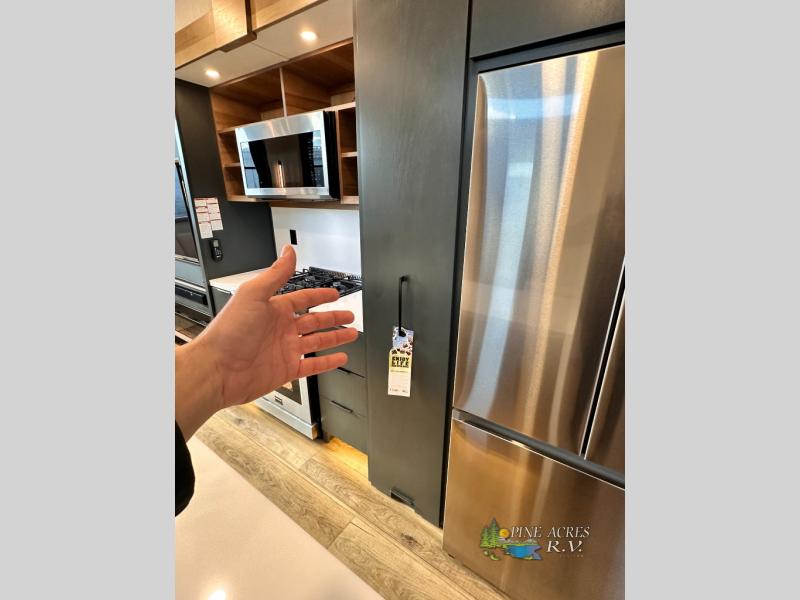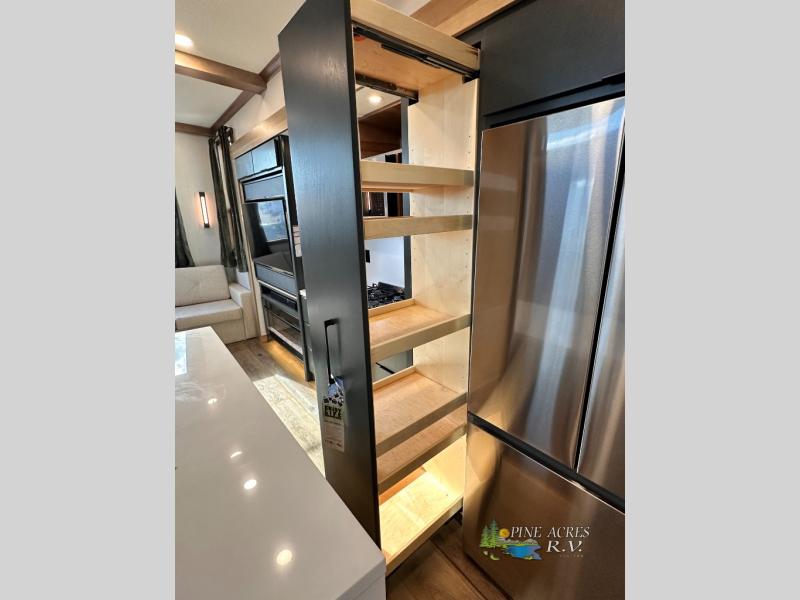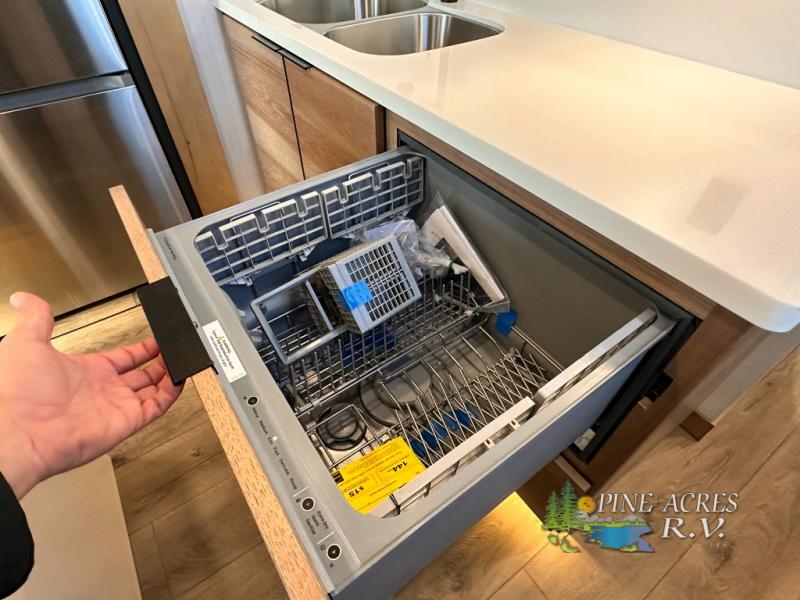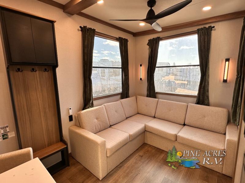 It won't be hard to find comfort in this dual slide, dual entry destination trailer! One of the entry doors conveniently opens to the front private bedroom where you'll find a queen bed slide out with a king bed option, dual closets with shelves in between, plus a dresser to keep everything tidy. If you have guests staying over, they can sleep on the L-shaped sleeper sofa in the rear living area, which is also directly across from the entertainment center for easy viewing. The chef of your group will love the spacious kitchen, complete with all the kitchen appliances to create their best meals and a large kitchen island with four chairs.