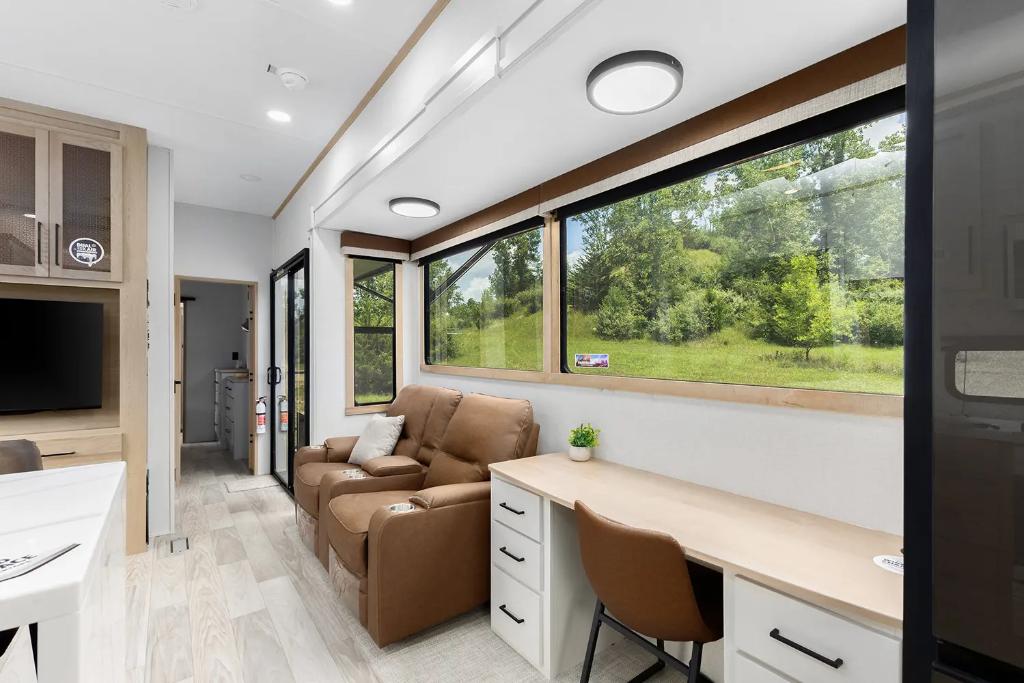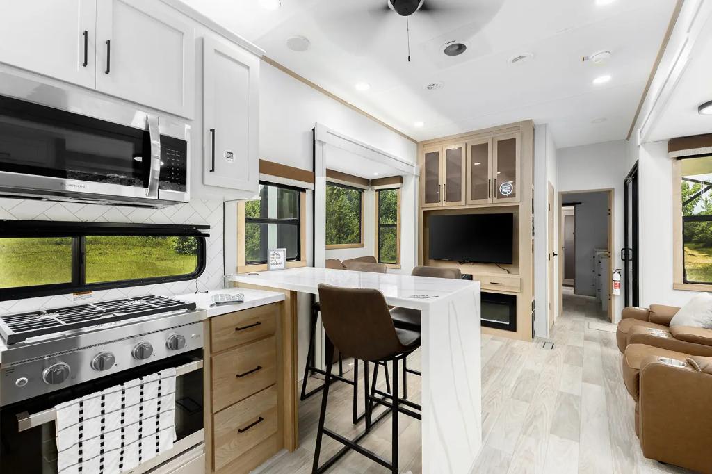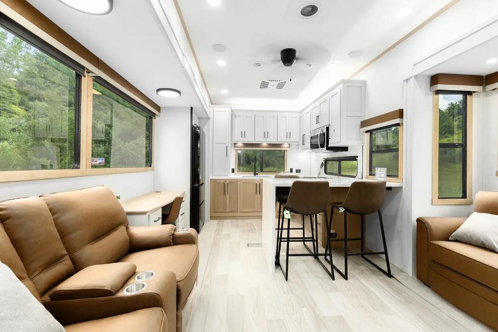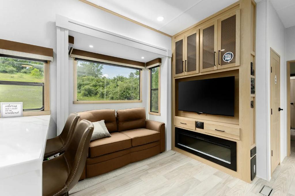 Roulotte de Parc Sandpiper 389HBFL 2026 Mesure 39'11 et pèse 11 774 lb 2 extensions face à face au niveau de la cuisine et salon ce qui permet d'avoir beaucoup d'espace dans l'aire commune. Salon disposant d'un sofa-lit et canapé-théâtre téléviseur foyer électrique avec rangement dissimulé derrière. Grande cuisine avec îlot central réfrigérateur résidentiel