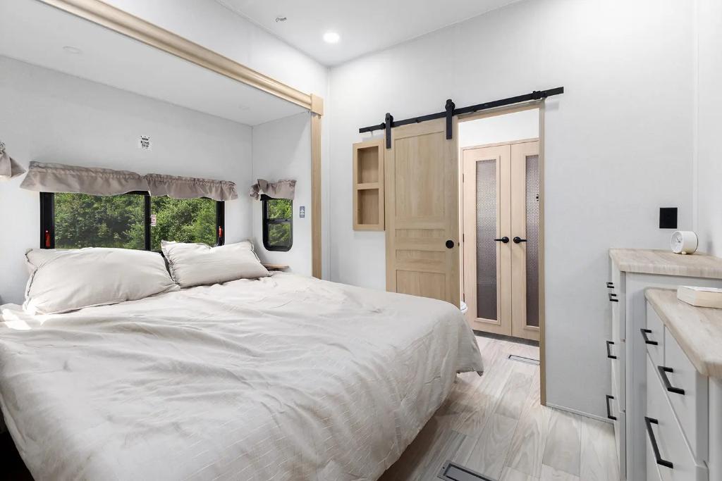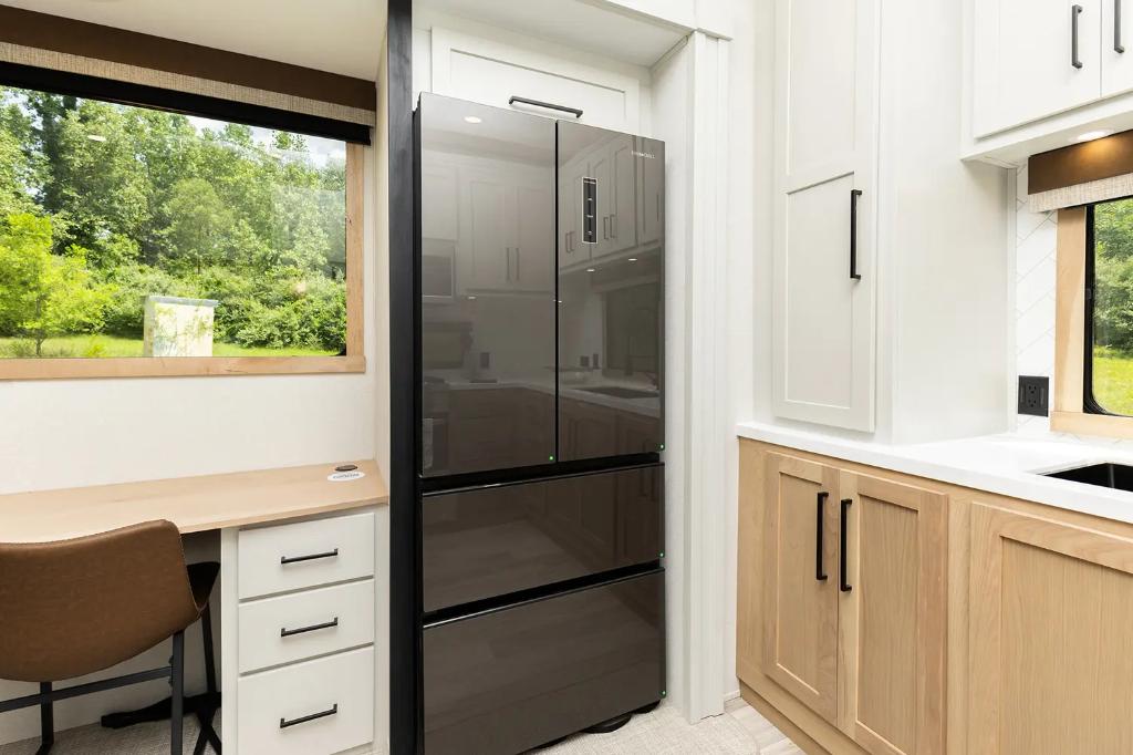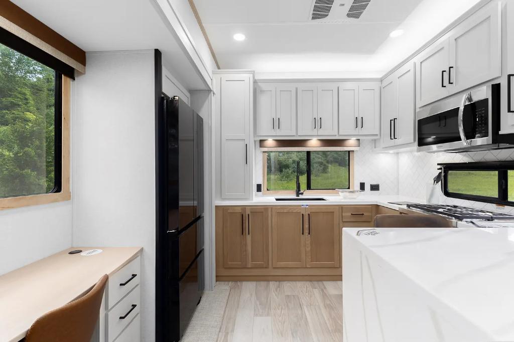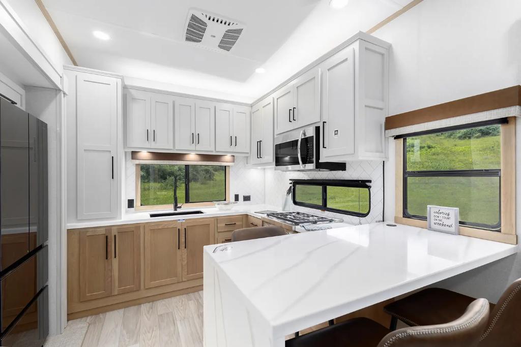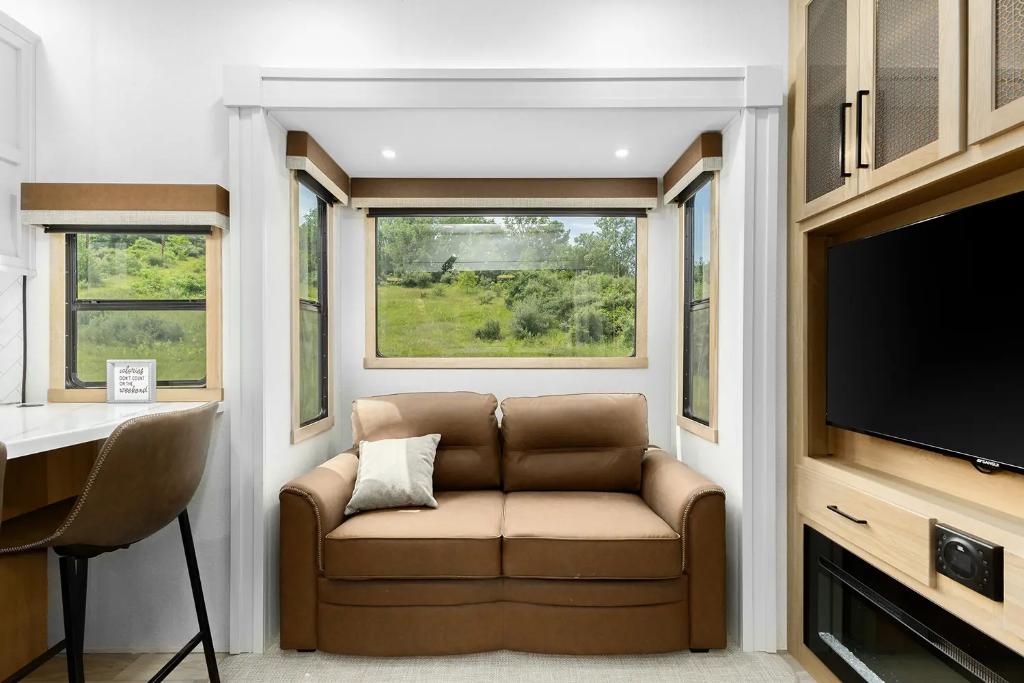 Roulotte de Parc Sandpiper 389HBFL 2026 Mesure 39'11 et pèse 11 774 lb 2 extensions face à face au niveau de la cuisine et salon ce qui permet d'avoir beaucoup d'espace dans l'aire commune. Salon disposant d'un sofa-lit et canapé-théâtre téléviseur foyer électrique avec rangement dissimulé derrière. Grande cuisine avec îlot central réfrigérateur résidentiel