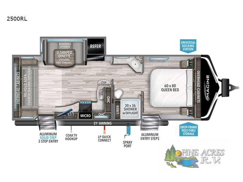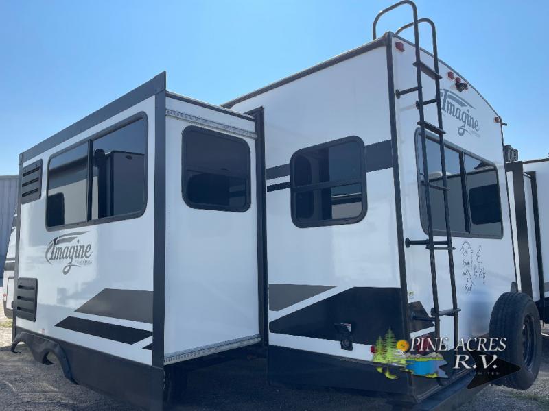 You will have an amazing amount of fun in this Imagine travel trailer! There is a tri-fold sofa and U-shaped dinette with removable ottoman that you can relax on while you watch the LED HDTV, and this trailer has two entry doors so that you can come and go as you please. The private bedroom contains the second entry door, so you can quickly head inside to grab a sweatshirt when you need one. While you're outside, you'll have a 21' power awning to protect you, and there is an exterior coax TV hookup, LP quick connect, and spray port to make your camping life easier. The interior walk-through bathroom connects the bedroom to the rest of the trailer, and the kitchen has a countertop extension so that you can chop veggies on extra counter space.