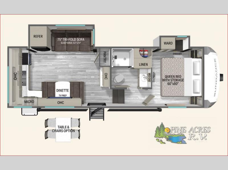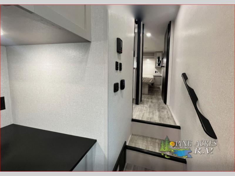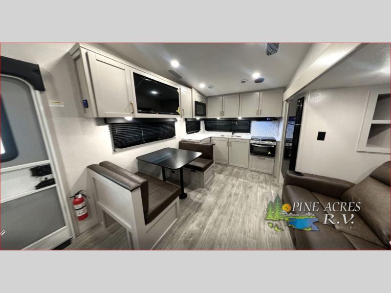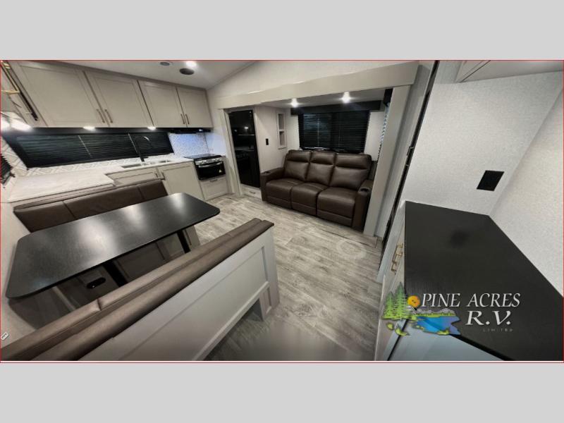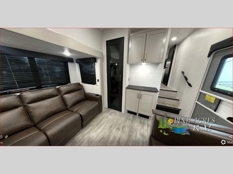 The fifth wheel you were waiting for! The spacious rear kitchen is equipped with a three-burner cooktop, microwave, booth dinette, 12V refrigerator, and sink, providing ample space for meal preparation. Overhead cabinets and a pantry provide ample storage for cookware, dishes, and other essential kitchen items. The living area features a trifold sofa, perfect for relaxation and entertainment. The full bathroom’s thoughtful design ensures that everyone has their own space, and the front bedroom is a retreat from the world, featuring a plush queen bed, a spacious wardrobe, and a closet.
