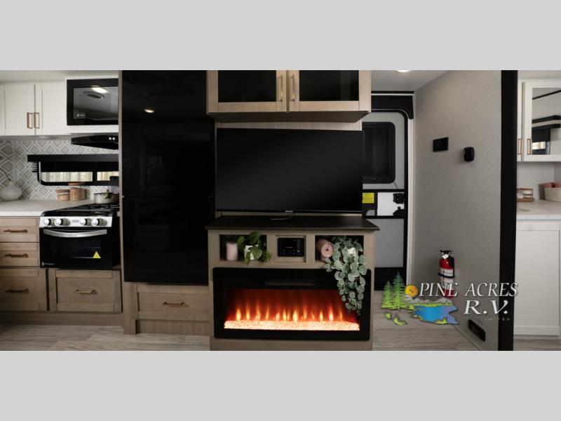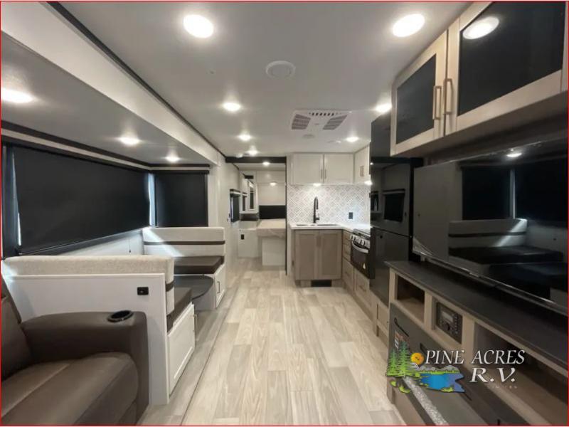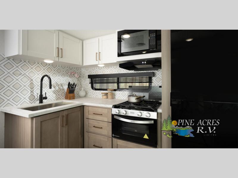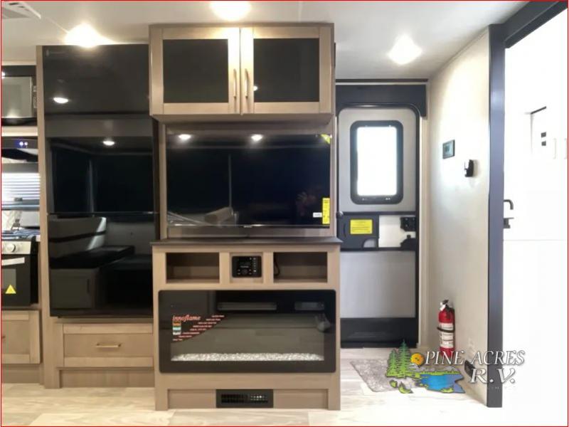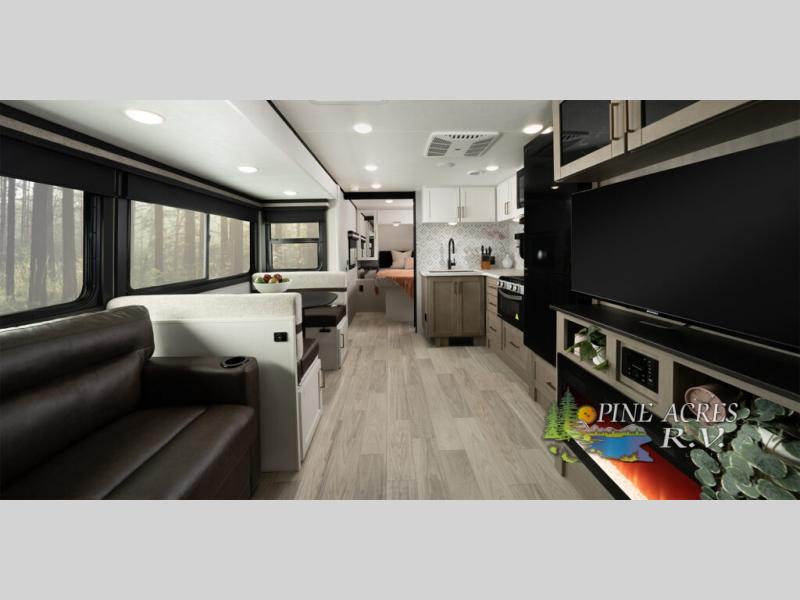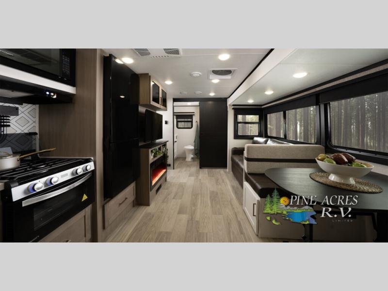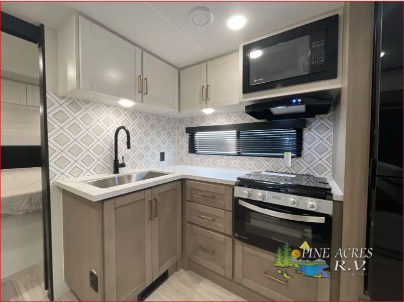 At the front of this travel trailer, you'll find a private bedroom featuring a 60" x 80" queen bed for a restful night’s sleep, in between nightstands on each side for added convenience. Moving into the center of the trailer, the main living area offers a spacious slide-out with a 60" tri-fold sofa perfect for lounging, and a 40" x 70" dinette ideal for meals, game nights, or gathering with friends and family—both of which convert into extra-sleeping space if needed. Across from the slide, the L-shaped kitchen is thoughtfully designed for ease and efficiency, featuring a stainless steel sink on one end, seamless countertop space for prepping meals, a three-burner range, and an 11 cu. ft. refrigerator for all your cooking essentials. Just beside the refrigerator is the entertainment center, with a walk-in pantry tucked behind it to store all your dry goods and snacks. At the rear, the full bathroom provides generous counter space, making it easy and comfortable to get ready each day.