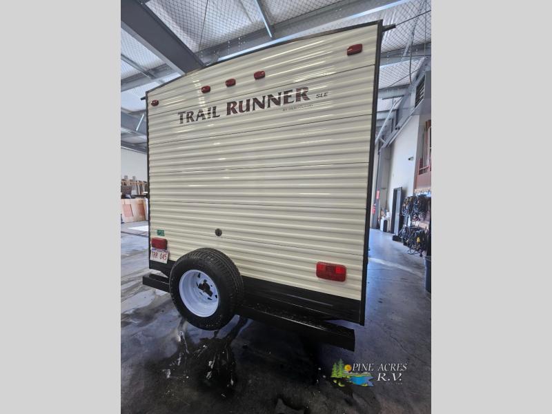 Ready, set, let's camp! Come select this Trail Runner SLE 25 travel trailer for your next camping trip. This model features sleeping space for eight people. In the rear there is a set of double bunk beds, plus both the dinette and the sofa convert into sleeping space, and in the front bedroom there is a queen bed. You will enjoy the convenience of the rear bathroom. Outside you will find a 14' awning which provides plenty of shade from the sun and helps to maximize your outdoor living space!