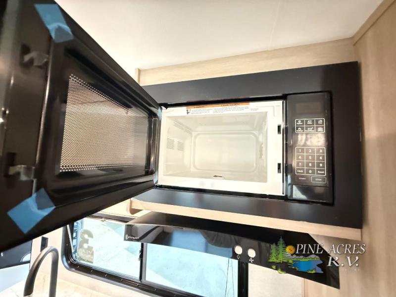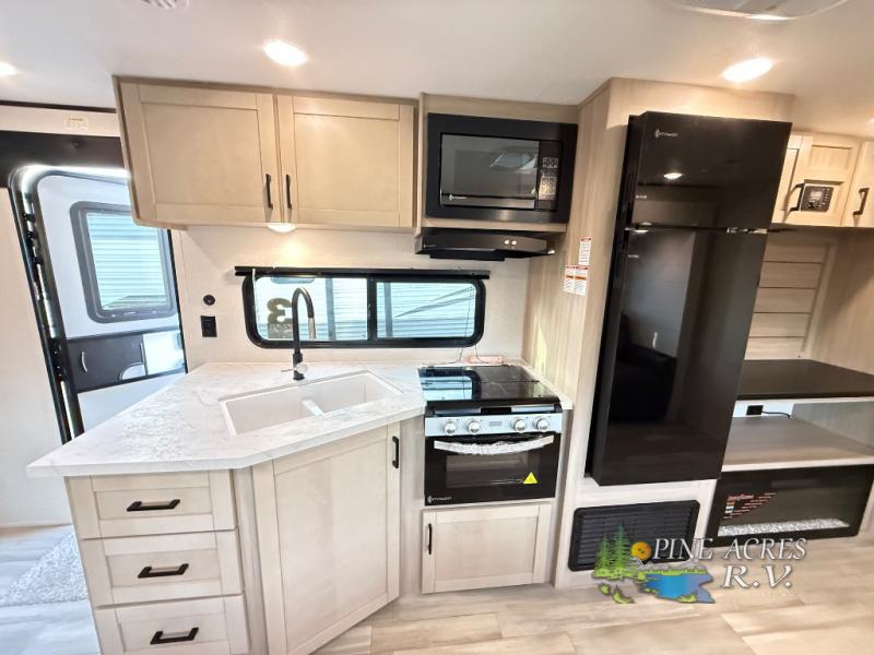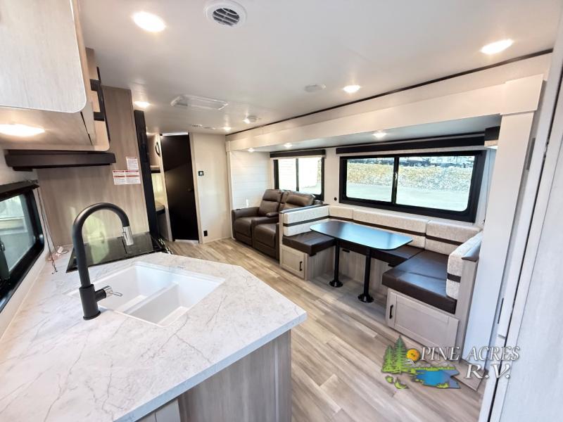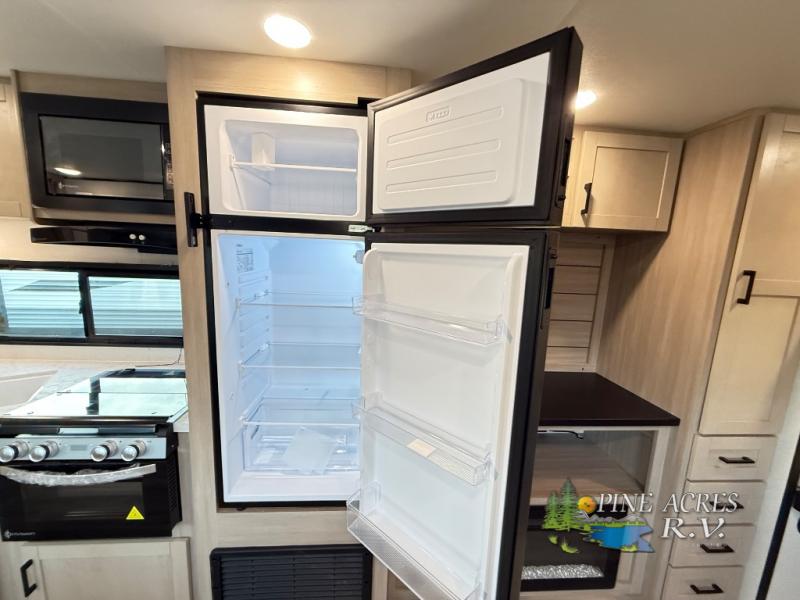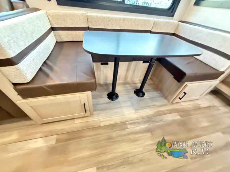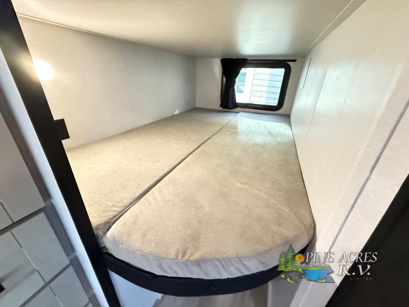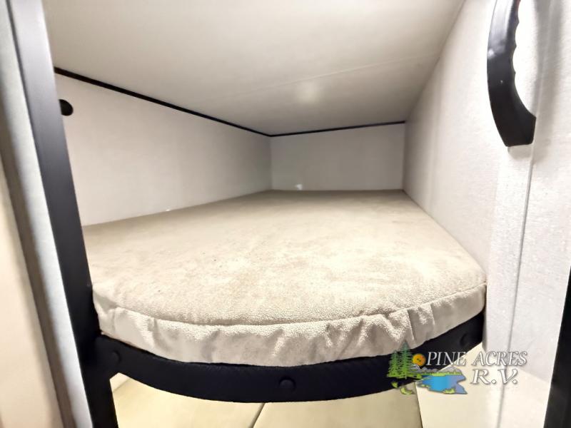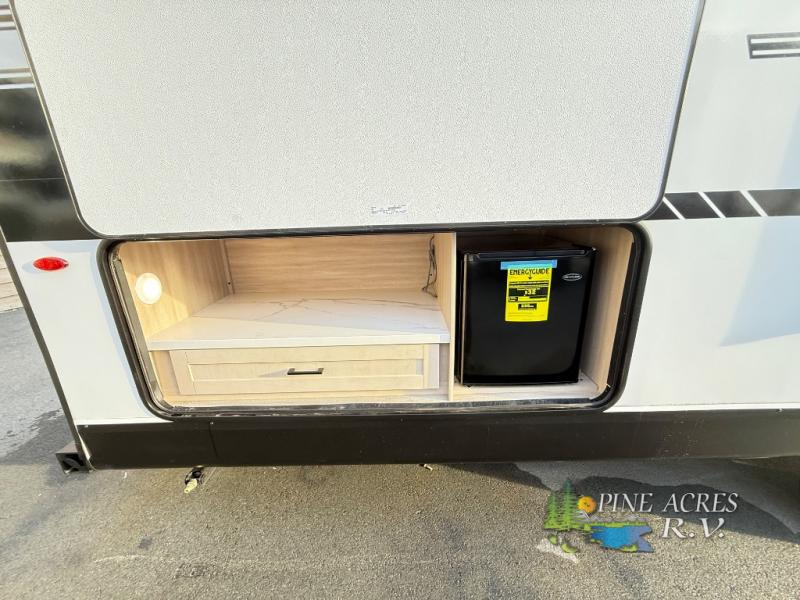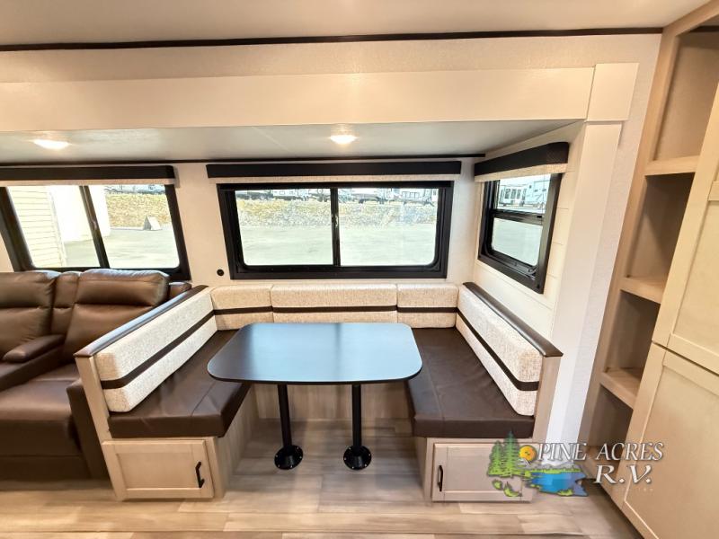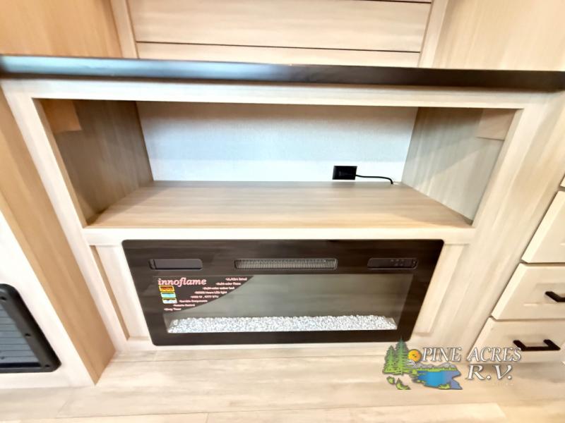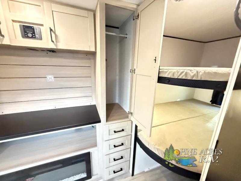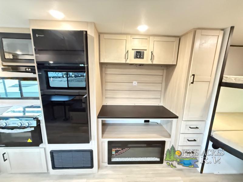 The whole gang will love weekends in the woods with this travel trailer in tow! There is a large slide out for added space, and here you'll find the jack-knife sofa and U-shaped dinette. There is also an entertainment center with a fireplace for cozy evenings indoors, and you'll appreciate the storage cabinet and shelves for board games, movies and more! You can claim the front private bedroom to yourselves, while your guests or little ones take the double-size bunks. A full kitchen is complete with a three-burner cooktop and microwave oven to make meals each day, plus a 12V refrigerator for food storage. This unit also includes an outdoor kitchen with a refrigerator to keep cold drinks ready to enjoy!