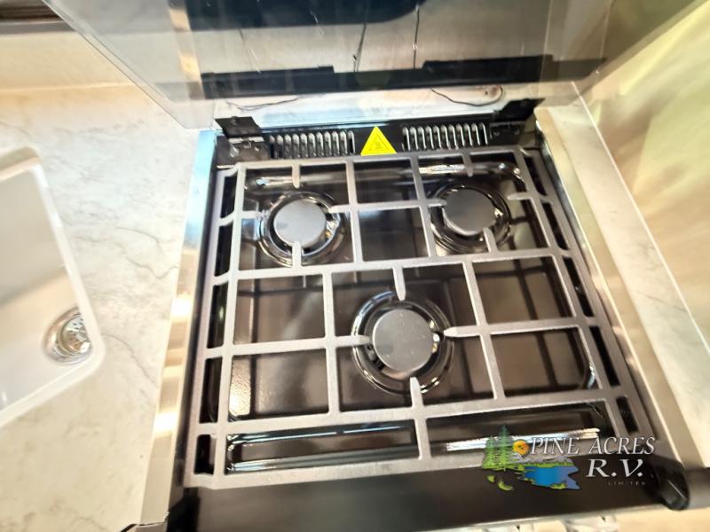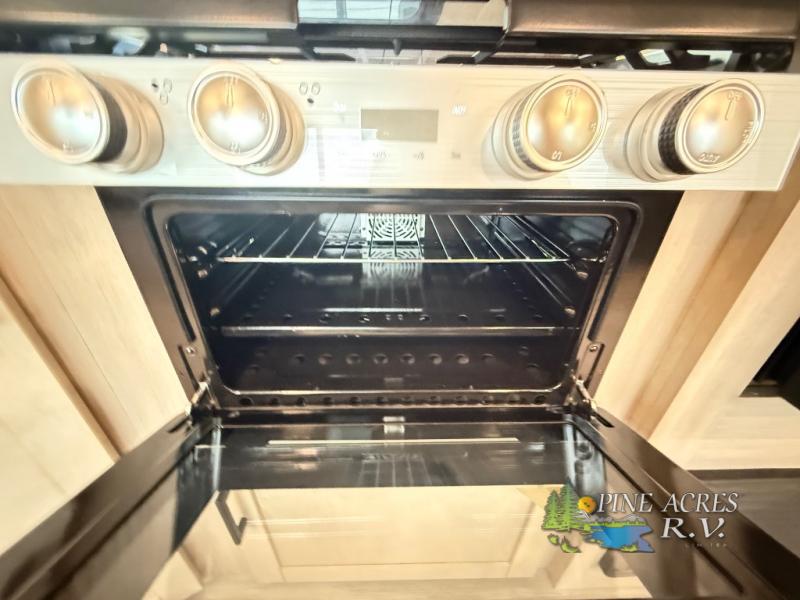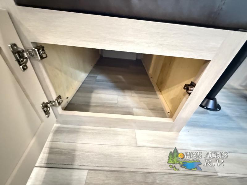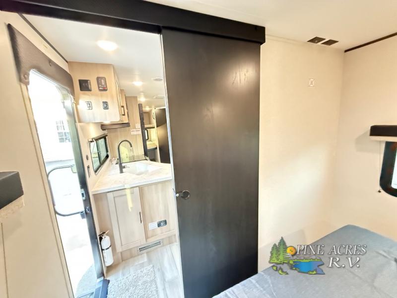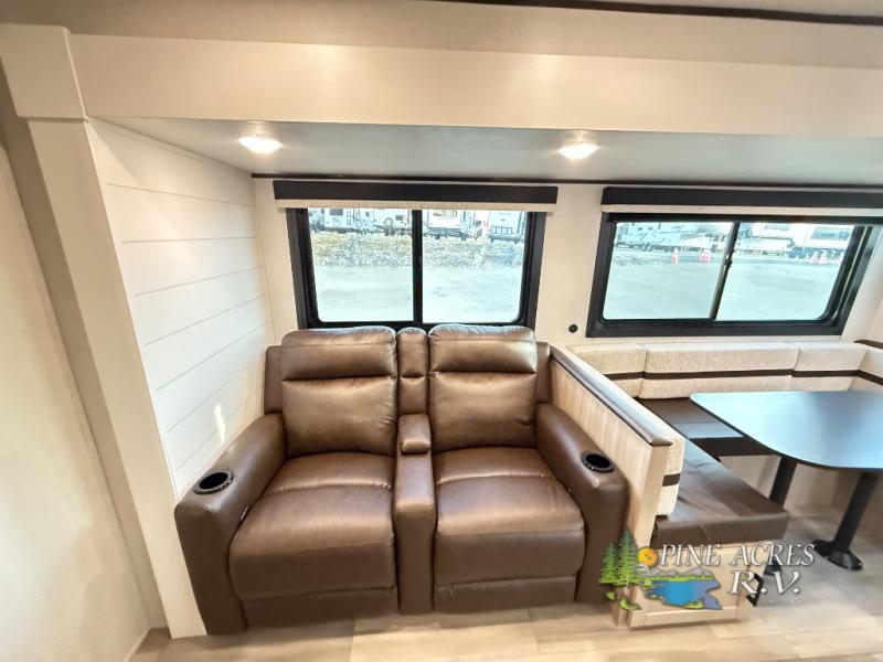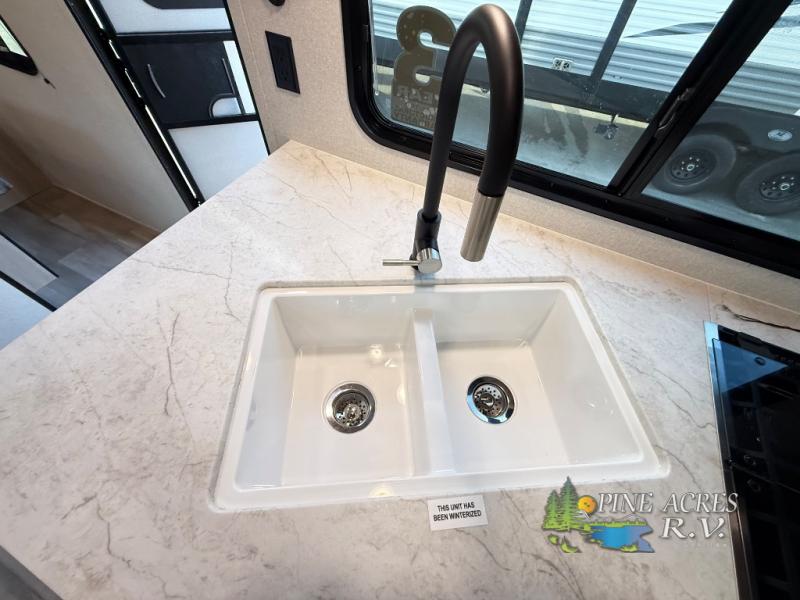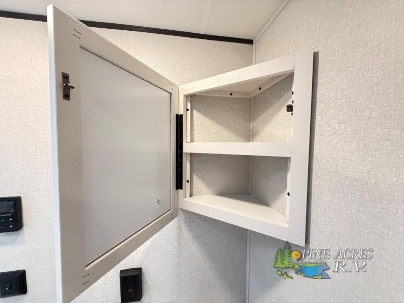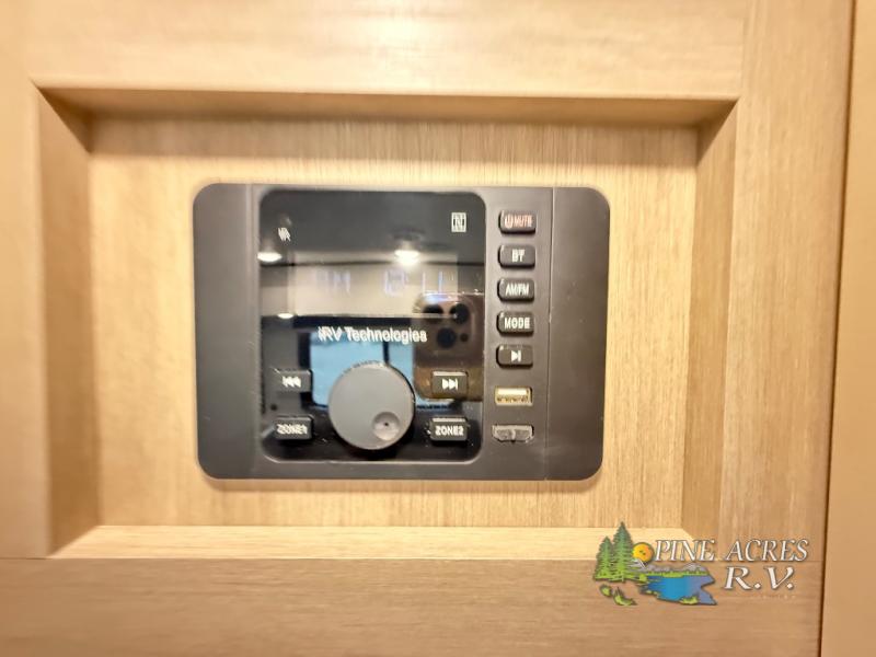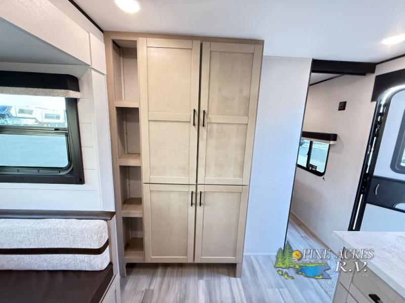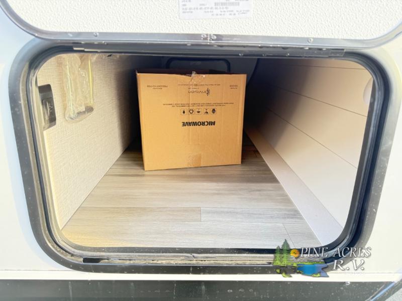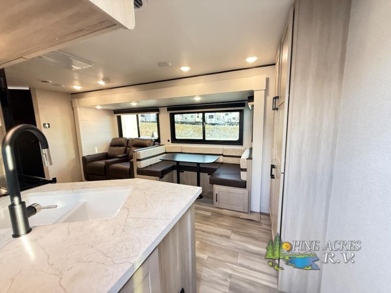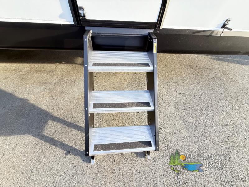 The whole gang will love weekends in the woods with this travel trailer in tow! There is a large slide out for added space, and here you'll find the jack-knife sofa and U-shaped dinette. There is also an entertainment center with a fireplace for cozy evenings indoors, and you'll appreciate the storage cabinet and shelves for board games, movies and more! You can claim the front private bedroom to yourselves, while your guests or little ones take the double-size bunks. A full kitchen is complete with a three-burner cooktop and microwave oven to make meals each day, plus a 12V refrigerator for food storage. This unit also includes an outdoor kitchen with a refrigerator to keep cold drinks ready to enjoy!