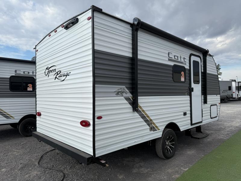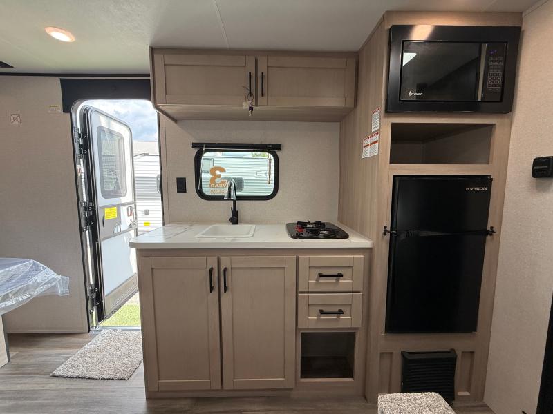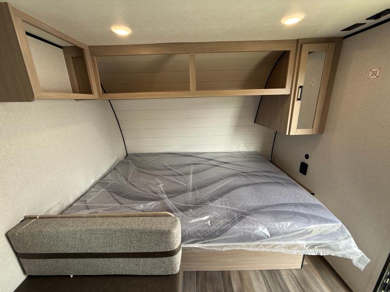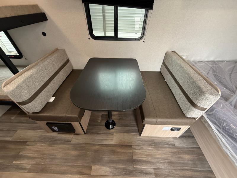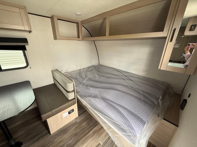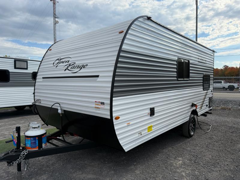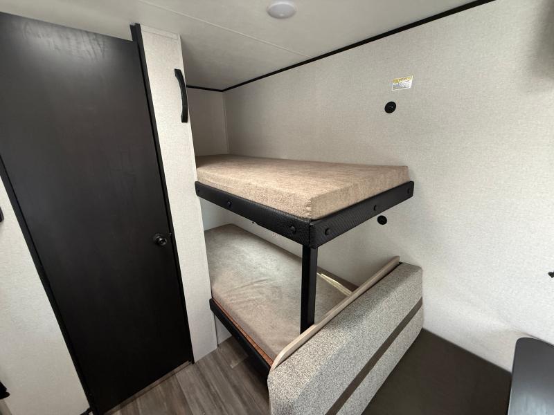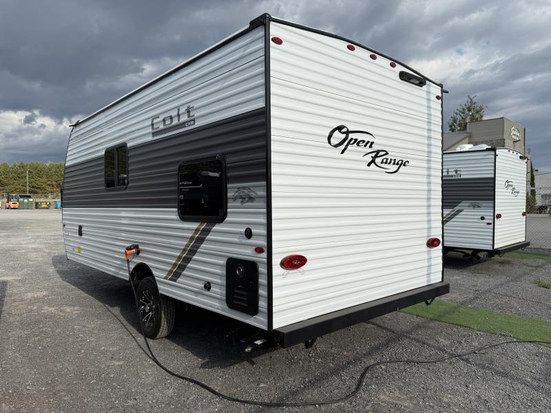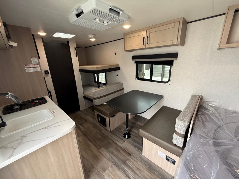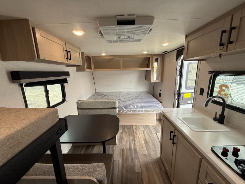 Open Range 17BH 2026 une roulotte compacte et familiale idéale pour vos escapades. Elle dispose d’un lit queen de lits superposés et d’une banquette offrant confort et praticité pour tous vos voyages.
