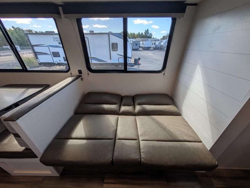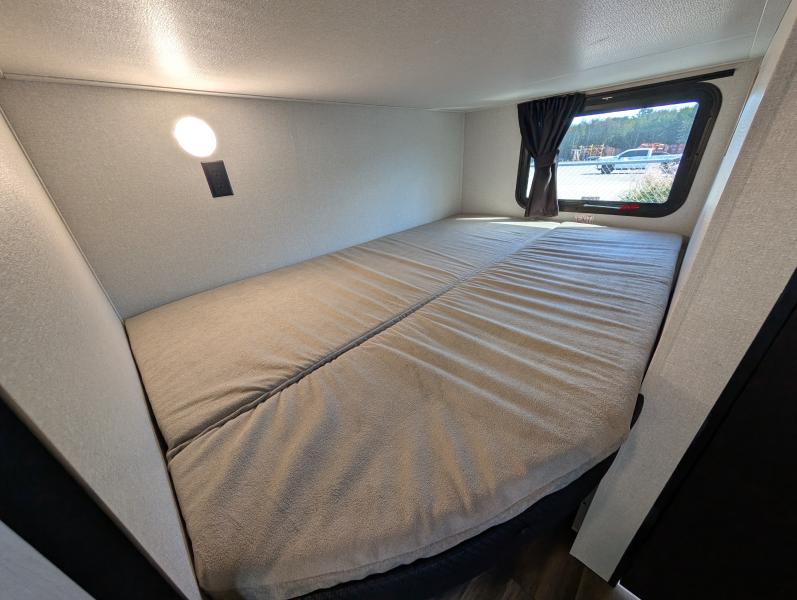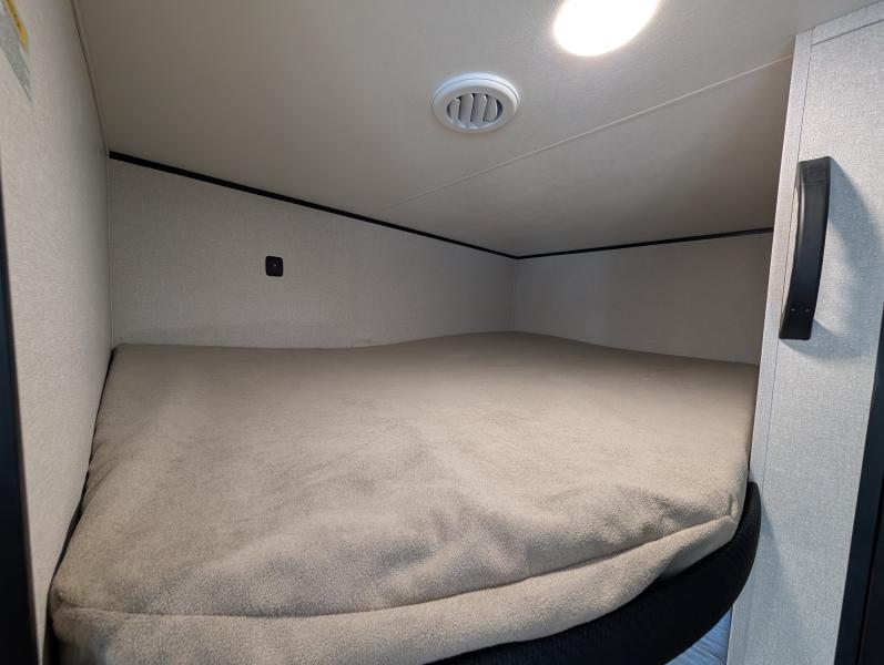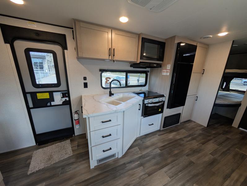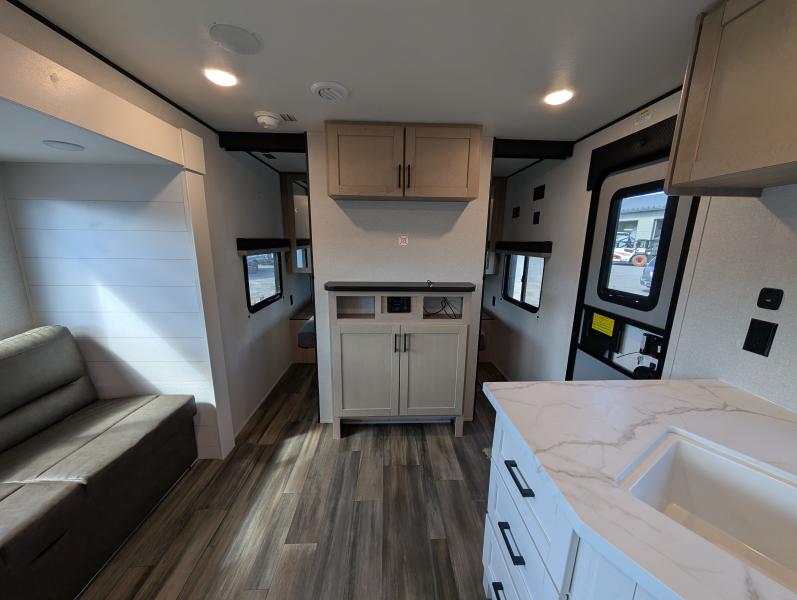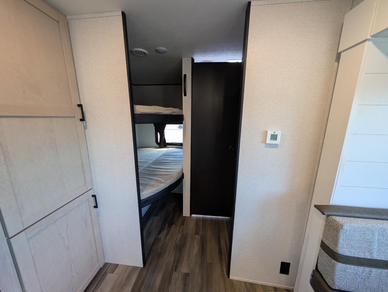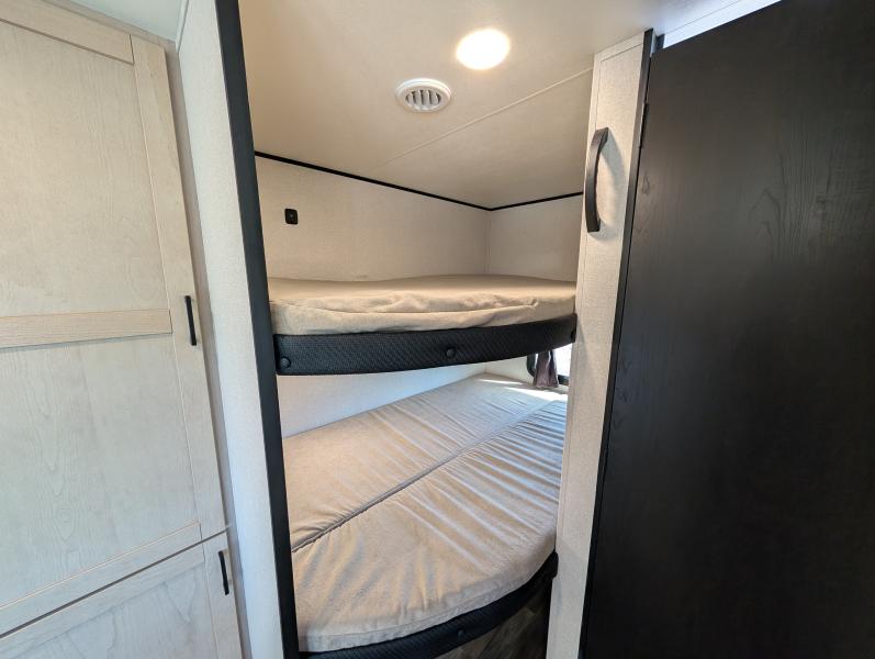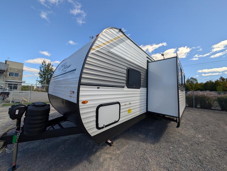 Open Range 26RBS 2026 une roulotte spacieuse et polyvalente parfaite pour les escapades en famille. Elle offre un lit queen des lits superposés et une banquette alliant confort et fonctionnalité pour toutes vos aventures.