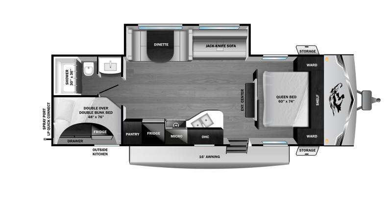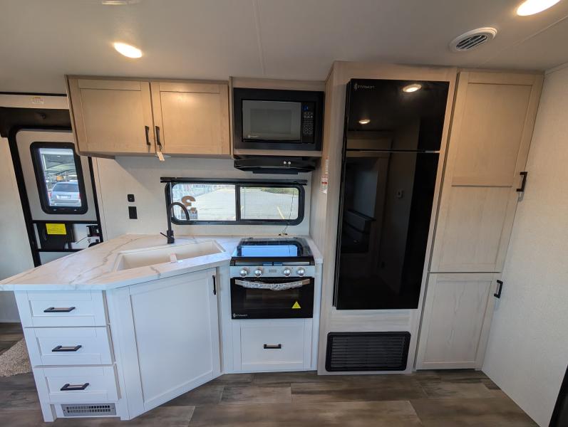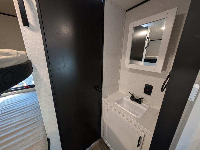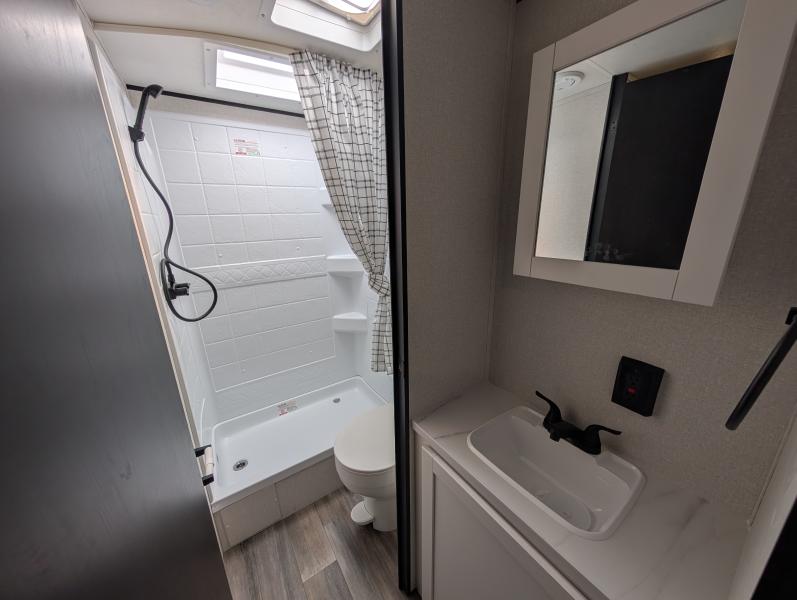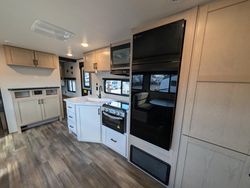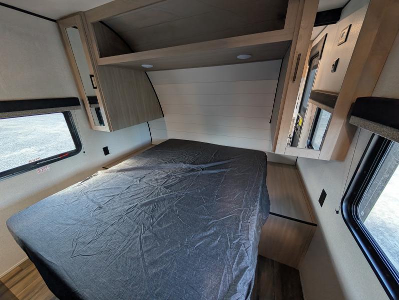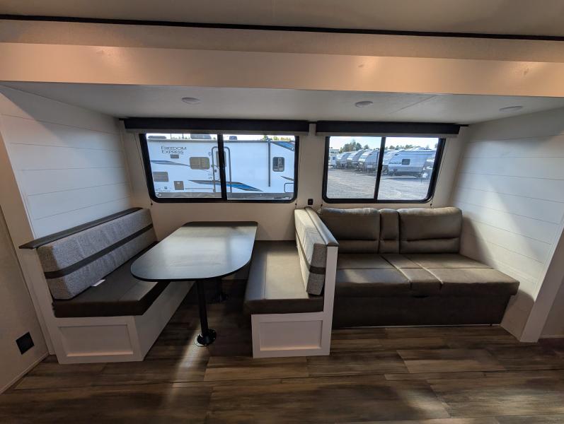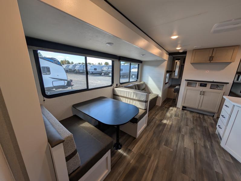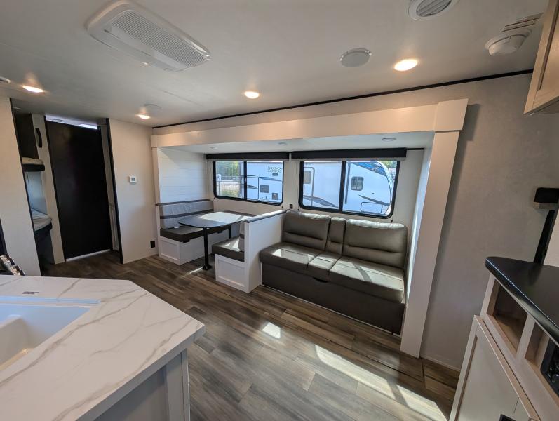 Open Range 26RBS 2026 une roulotte spacieuse et polyvalente parfaite pour les escapades en famille. Elle offre un lit queen des lits superposés et une banquette alliant confort et fonctionnalité pour toutes vos aventures.