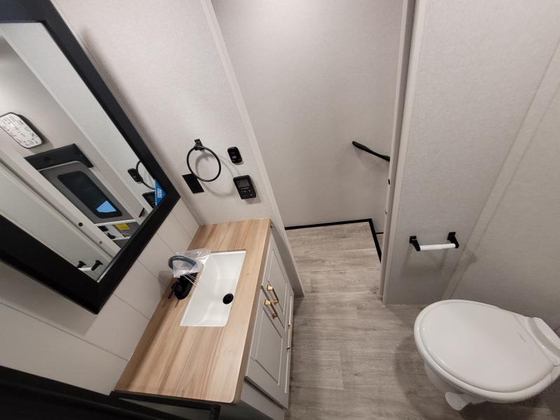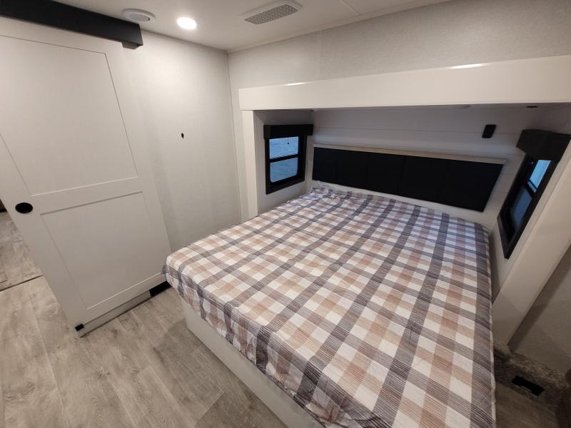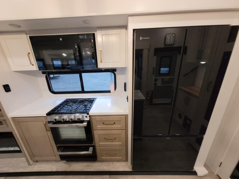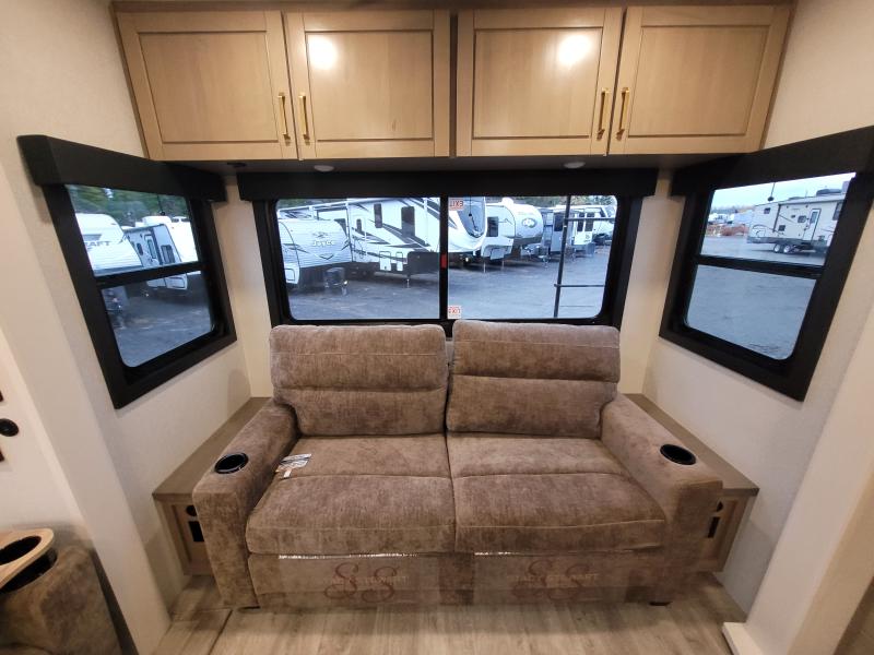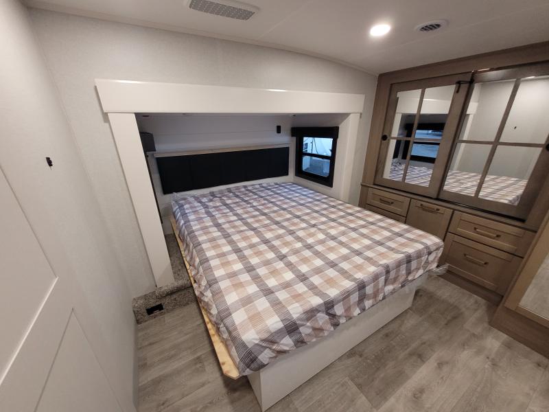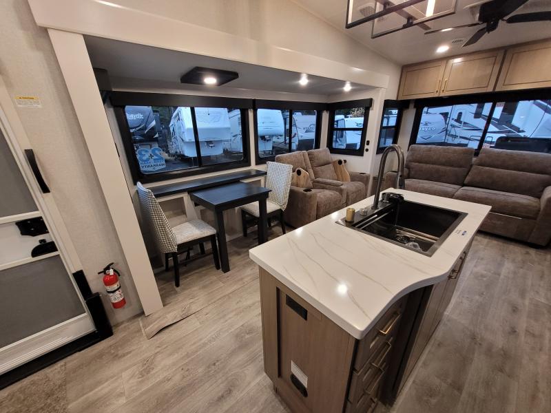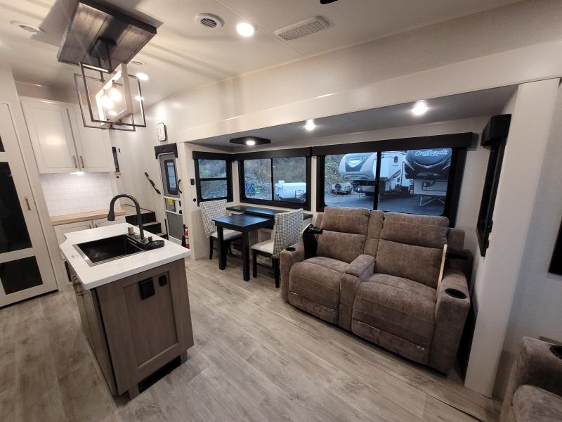 Eagle 321RSTS 2026 une roulotte luxueuse et spacieuse offrant un confort haut de gamme. Elle est équipée d’un foyer chaleureux d’un îlot central idéal pour cuisiner de fauteuils style théâtre pour relaxer d’une télévision grand format et d’un lit king offrant un espace de repos supérieur.