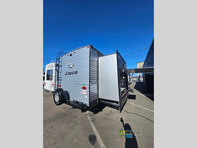 As the best-selling travel trailer in America, the Jayco Jay Flight travel trailer features all that you need for reliable, comfortable, and accommodating adventures! The American-made Goodyear tires, Dexter axles with Nev-R-Adjust brakes, and E-Z Lube hubs are what make it a dream to tow the Jay Flight, and the fully integrated A-frame and Magnum Truss roof system create a foundation that will last for years to come. Make your time spent at the campground an enjoyable one by using the power awning with LED lights and speakers as you sit around in some lawn chairs and share ghost stories by the campfire. Plus, if your hands get sticky from the roasted marshmallows, you can use the outside shower to rinse them off.