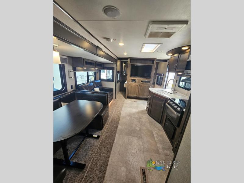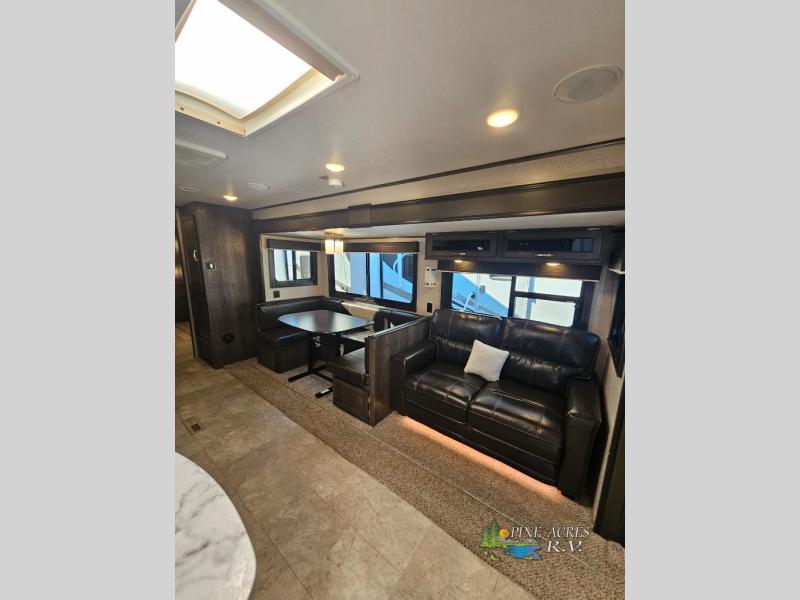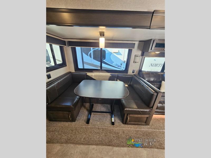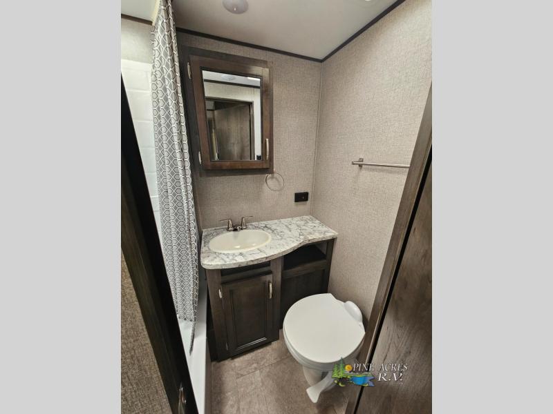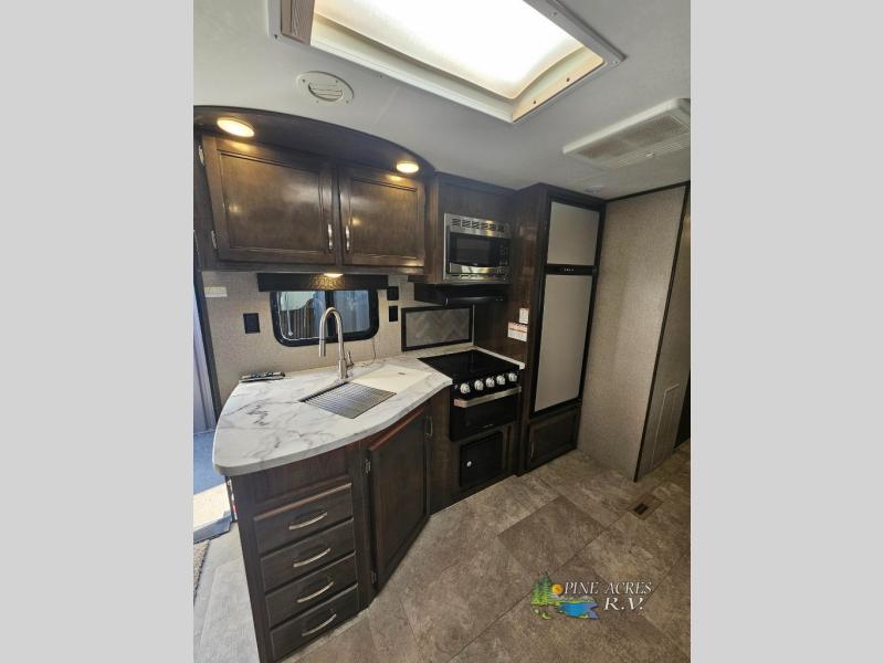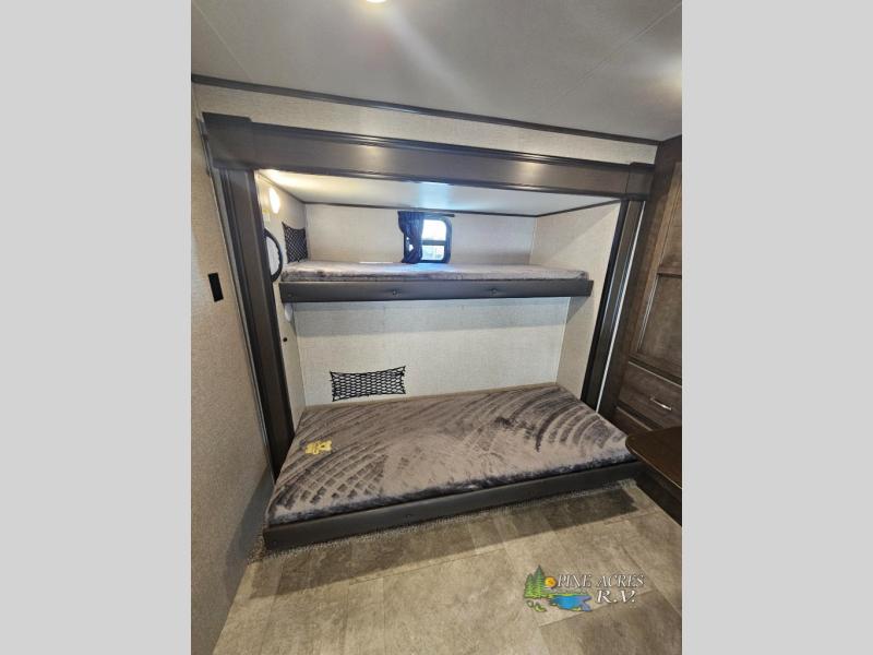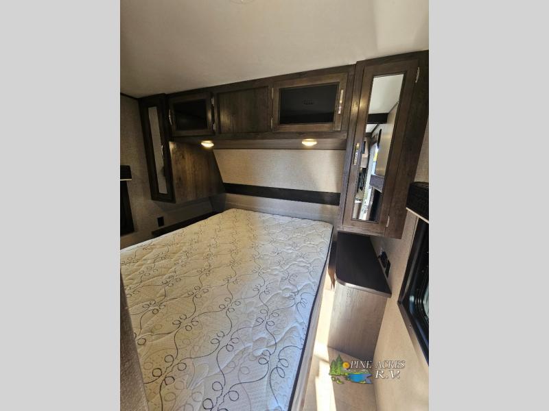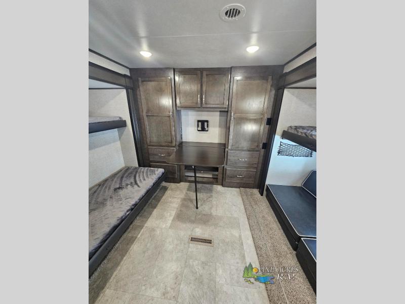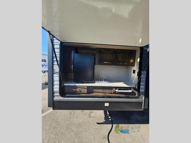 Your kids will beg you to get this Jay Flight travel trailer because of the awesome private bunkhouse in the back! This space has its own entertainment center with wardrobes on either side, a flip-up table, and opposing slides so that there is tons of space to sit down and play on the floor. Plus, since there is a private bedroom up front, you and your spouse can escape the chaos each night. You will also love spending your mornings sipping on your coffee outside while you cook up some bacon and eggs at the outdoor kitchen.