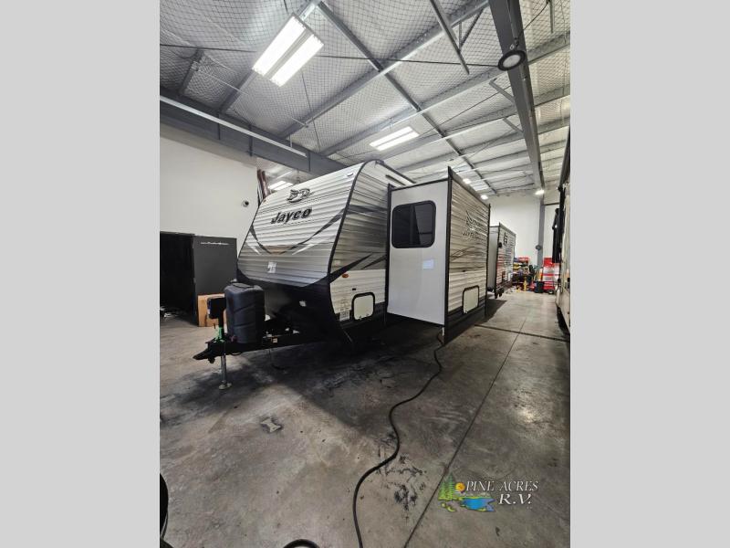 With any Jayco Jay Flight travel trailer you will get solid construction from the fully integrated A-frame, the l-class cambered structural steel l-beams, and the Magnum Truss roof system with seamless DiFlex II material. The 30" x 72" main entrance door, the entrance and baggage doors are all keyed alike, and the radial tires offer safety and security you will want every where you travel and setup. It's time to find out what else the Jay Flight has to offer that you can't travel without. Choose your favorite model today!