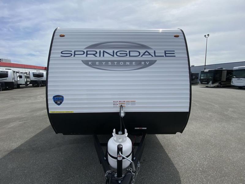 With any Springdale Classic Mini travel trailer by Keystone, you will enjoy lightweight towing thanks to their single-axle! You'll find the XL entry assist handle will make entering and exiting your unit easier than ever, and the power awning will provide protection from the sun as you relax in your camp chairs outside. Each model includes blackout night shades, solid wood cabinet doors and drawers, a shower skylight for more standing room, plus many more interior comforts. There is also a 5,000 BTU sidewall A/C and 20K BTU furnace to keep you comfortable, plus a Girard tankless water heater for endless hot showers!