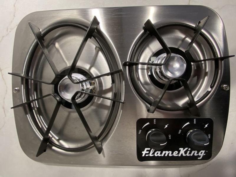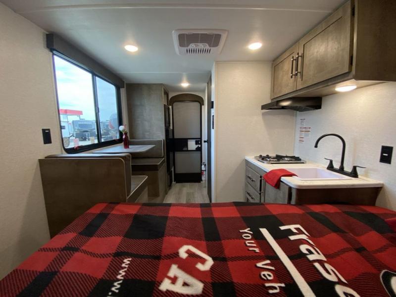 This is the perfect easy-to-tow travel trailer for three campers! The front queen bed includes a shelf above for books plus a closet and nightstand at the foot of the bed for even more storage. You can make meals each day on the two burner gas cooktop and store food in the 3.3 cu. ft. 12V refrigerator. A full bath onboard means you won't have to use the camp's facilities, and the exterior pass-thru storage will be perfect for hiking gear, camp chairs, and more!