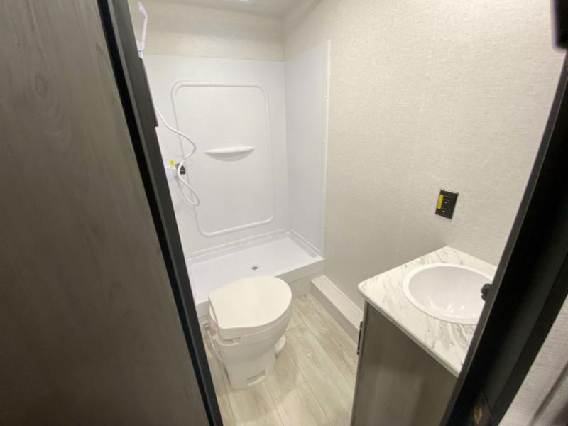 If you're looking for a travel trailer with a little more sleeping space, look no further than this Hideout Sport! There are double-size bunks with inside and outside storage, a walk-around queen bed in the front bedroom, plus a sofa and booth dinette for even more sleeping space. The kitchen comes with a cooktop to cook meals on, a sink for clean up, and a 10 cu. ft. 12V refrigerator to store the milk and eggs. You will also find TV prep in this model if you enjoy movie nights while at the campground.