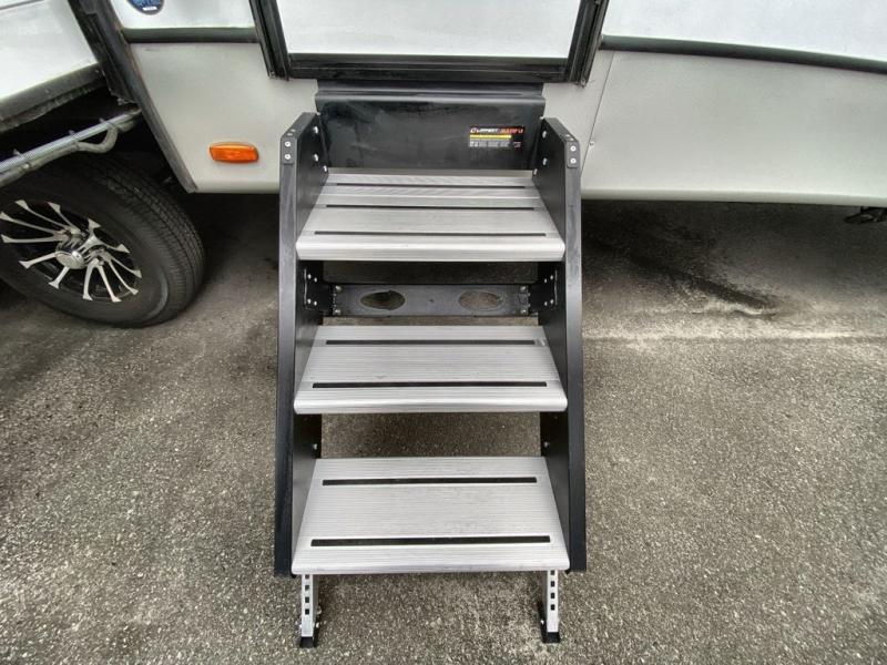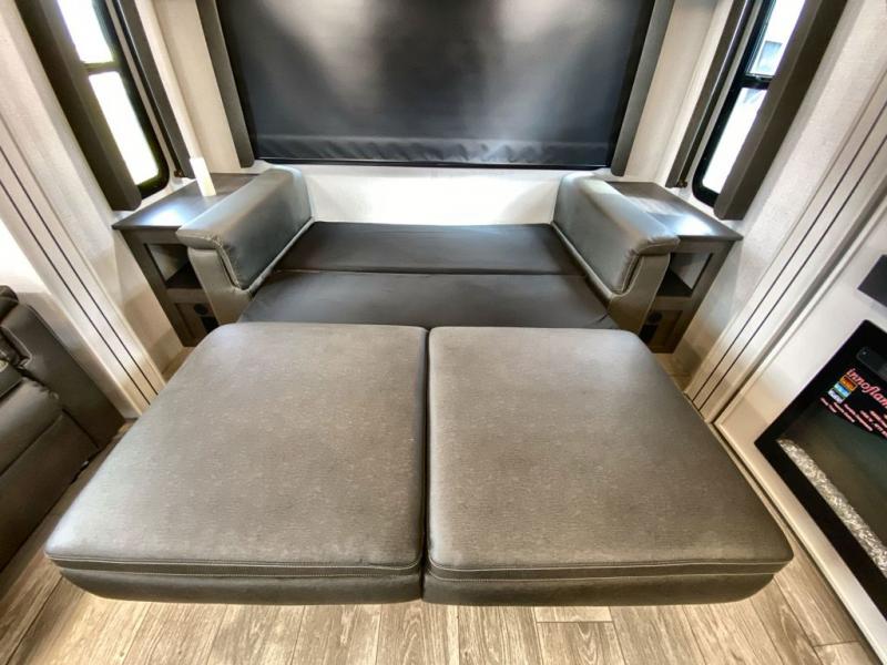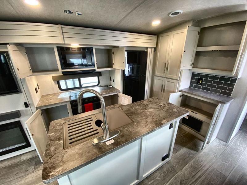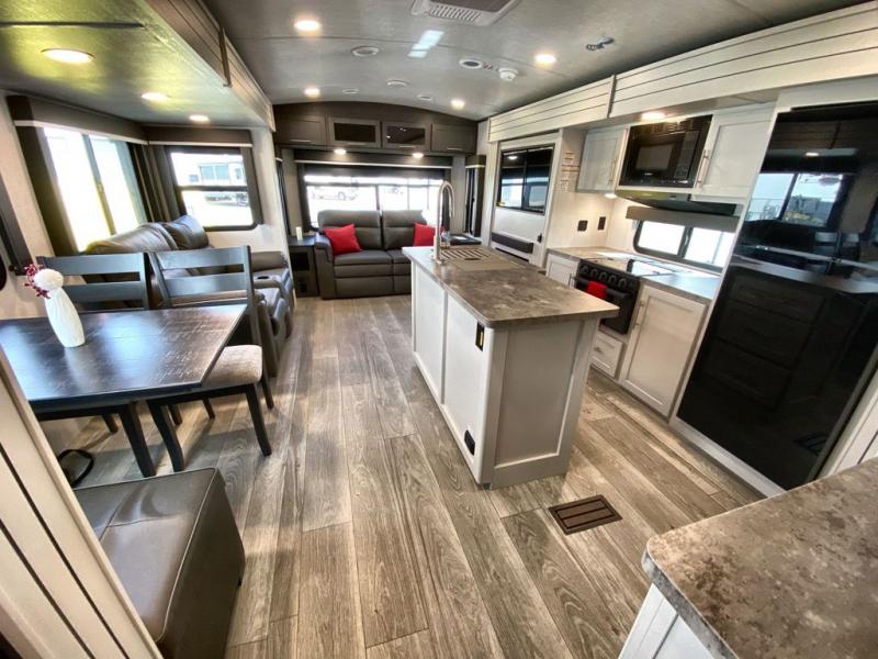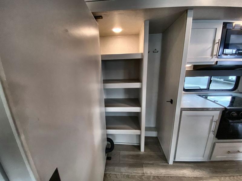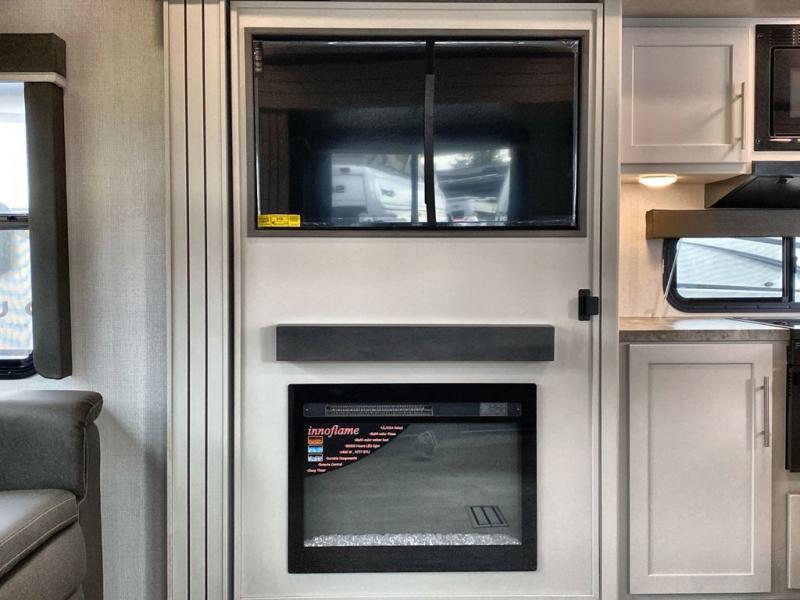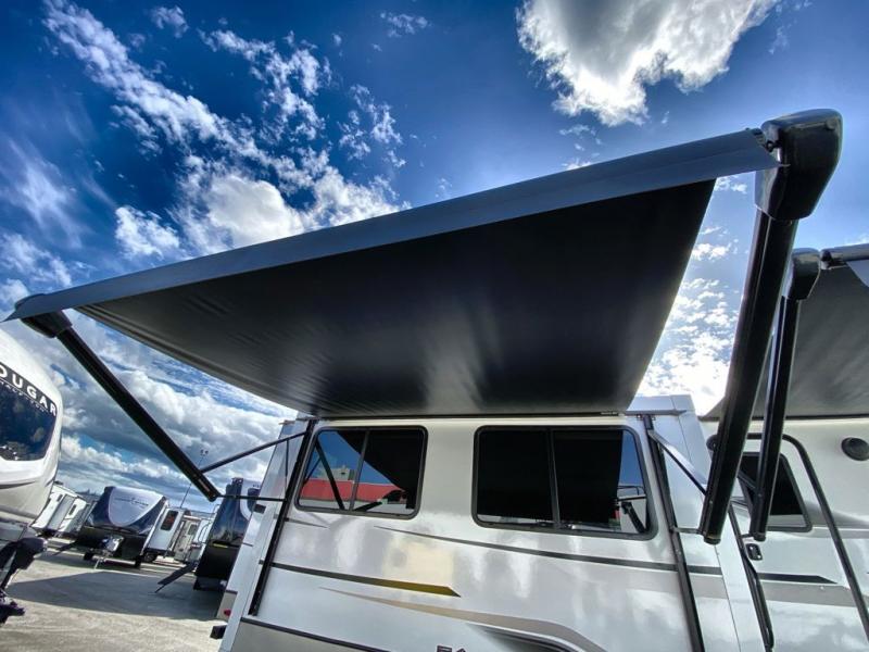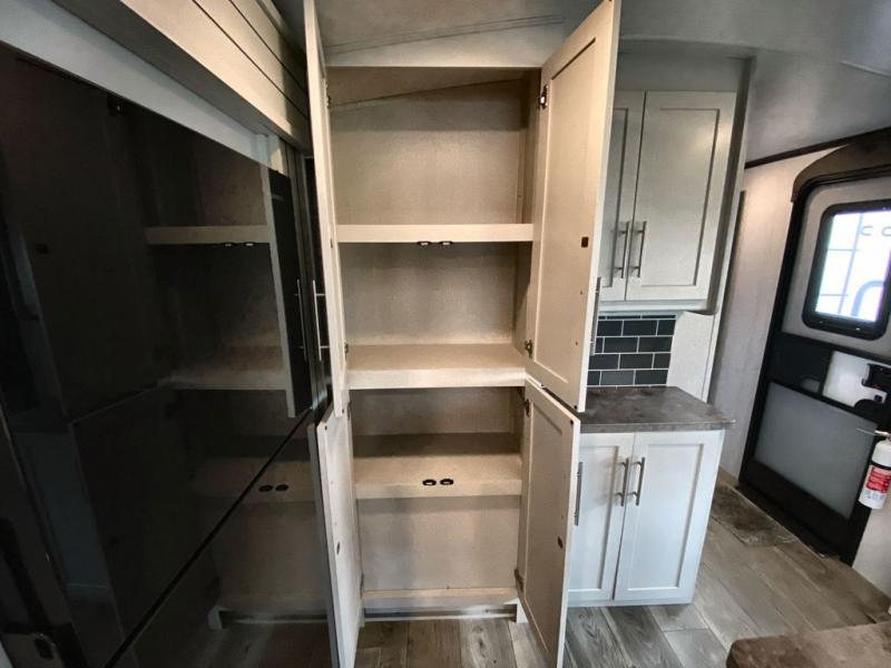 Trips spent in this travel trailer are sure to bring memories! The dual opposing slides in the combined kitchen and living area provide your crew with plenty of space to relax on the theater seating, dine at the dinette table, and prep meals with the kitchen island. There is also a tri-fold sleeper sofa here for guests and a pivoting entertainment center with a hidden pantry to keep snacks stocked. And a second pantry and hutch provides even more storage! You'll love having your own private bedroom up front, complete with a king bed, dual bedside drawers and nightstands and additional storage drawers to keep your space tidy. Outside, you'll find two power awnings, a 2" accessory hitch, and a drop frame pass-thru storage for fishing poles, hiking gear, and more!