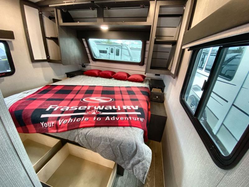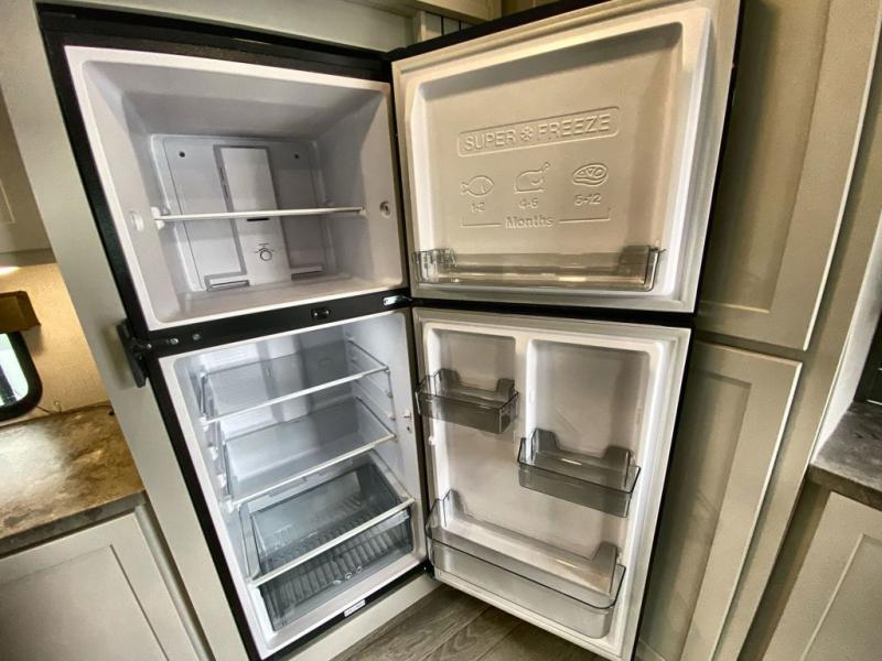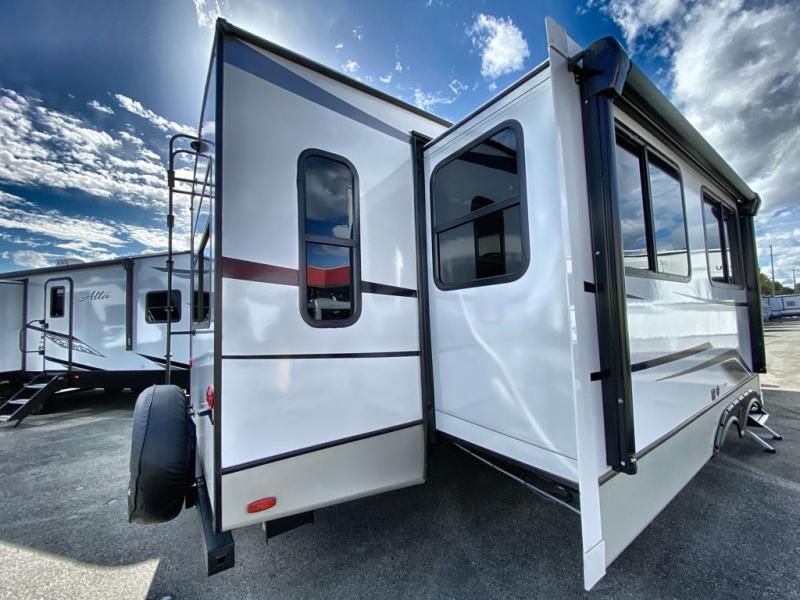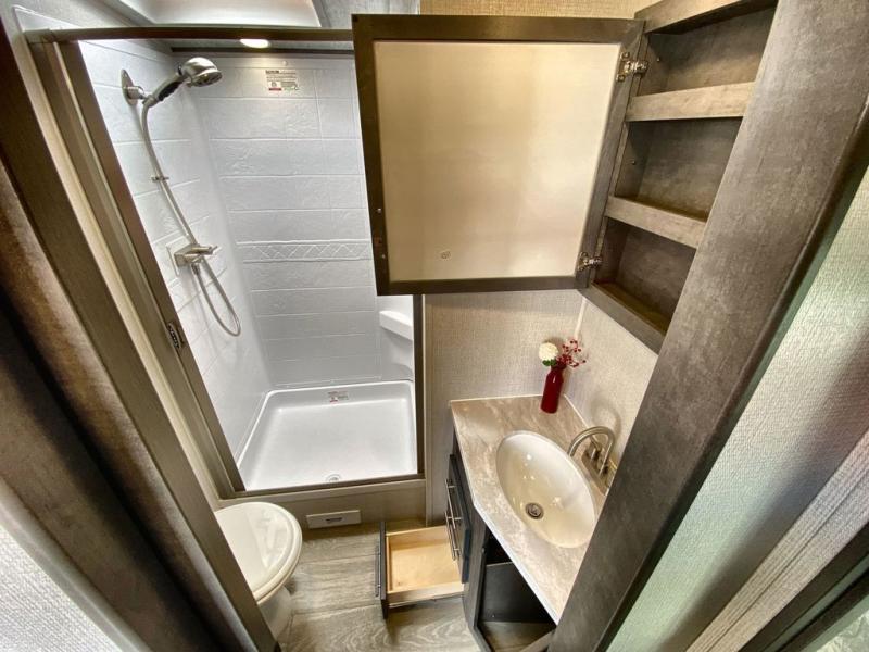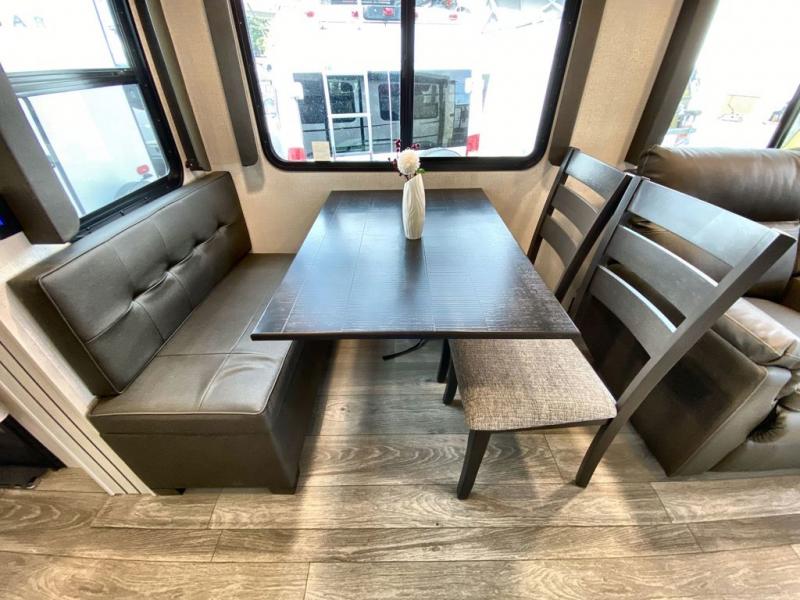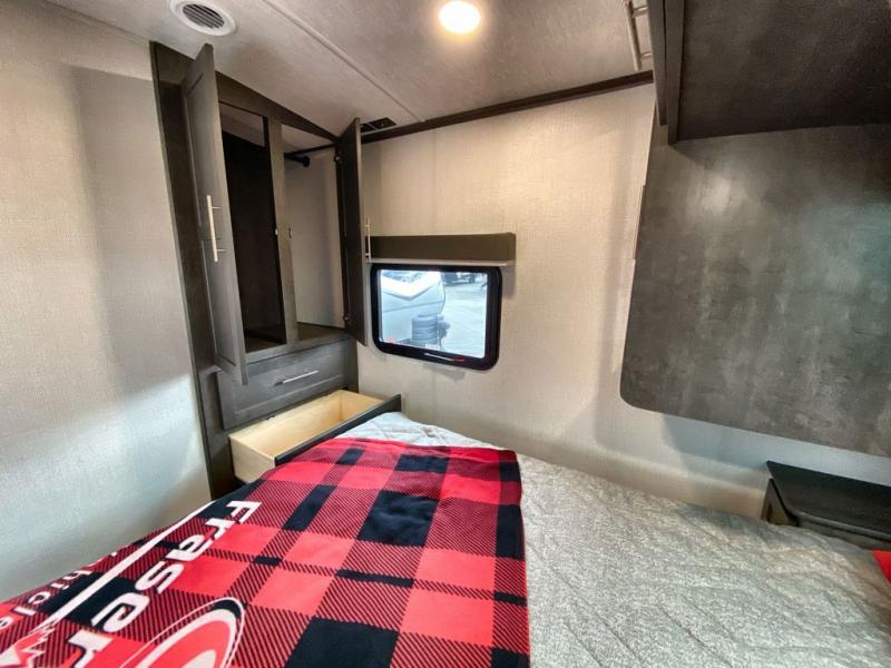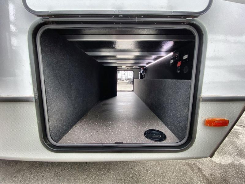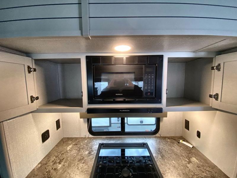Trips spent in this travel trailer are sure to bring memories! The dual opposing slides in the combined kitchen and living area provide your crew with plenty of space to relax on the theater seating, dine at the dinette table, and prep meals with the kitchen island. There is also a tri-fold sleeper sofa here for guests and a pivoting entertainment center with a hidden pantry to keep snacks stocked. And a second pantry and hutch provides even more storage! You'll love having your own private bedroom up front, complete with a king bed, dual bedside drawers and nightstands and additional storage drawers to keep your space tidy. Outside, you'll find two power awnings, a 2" accessory hitch, and a drop frame pass-thru storage for fishing poles, hiking gear, and more!