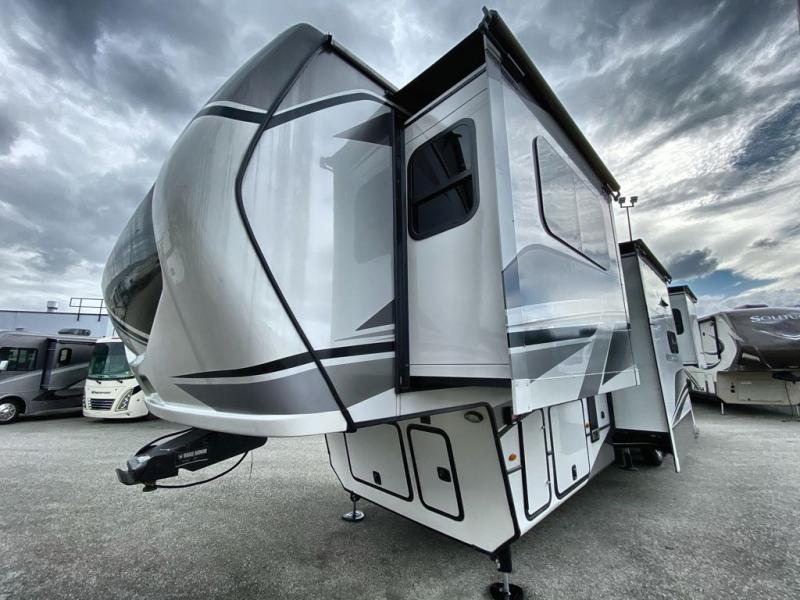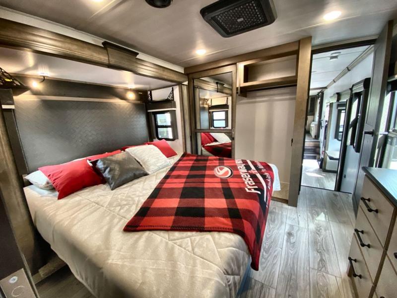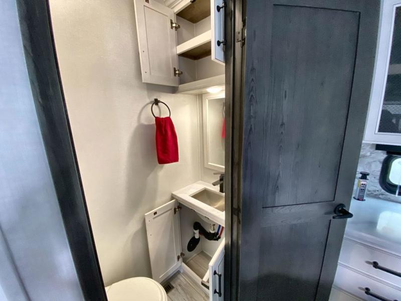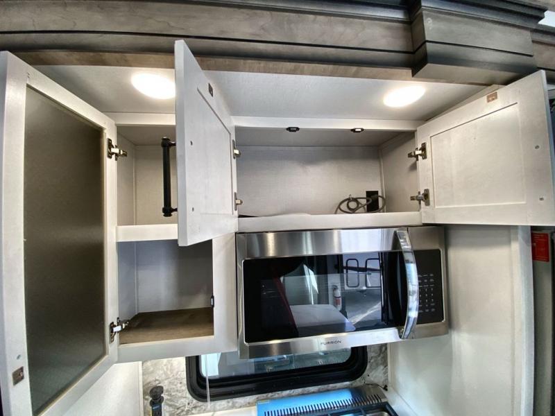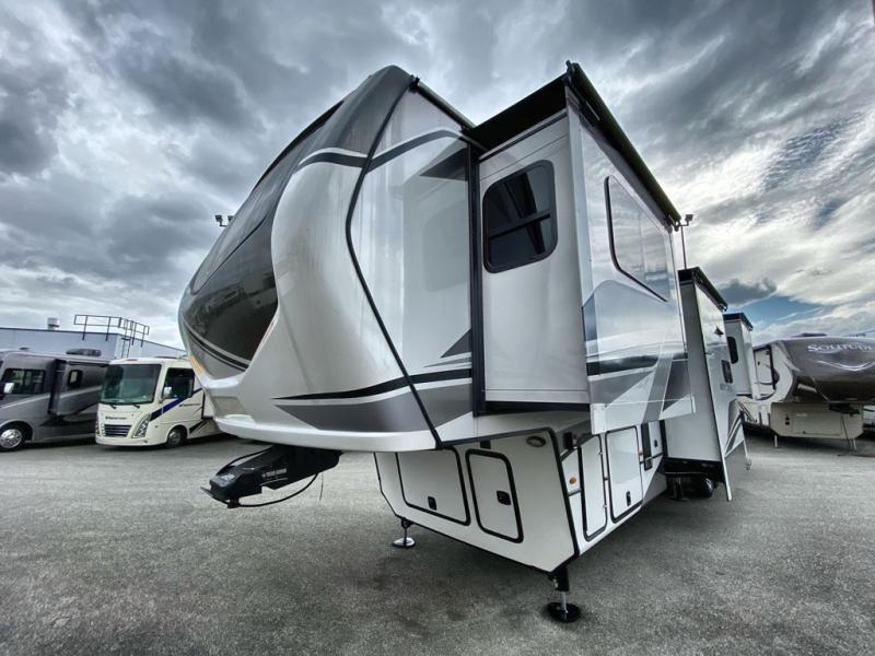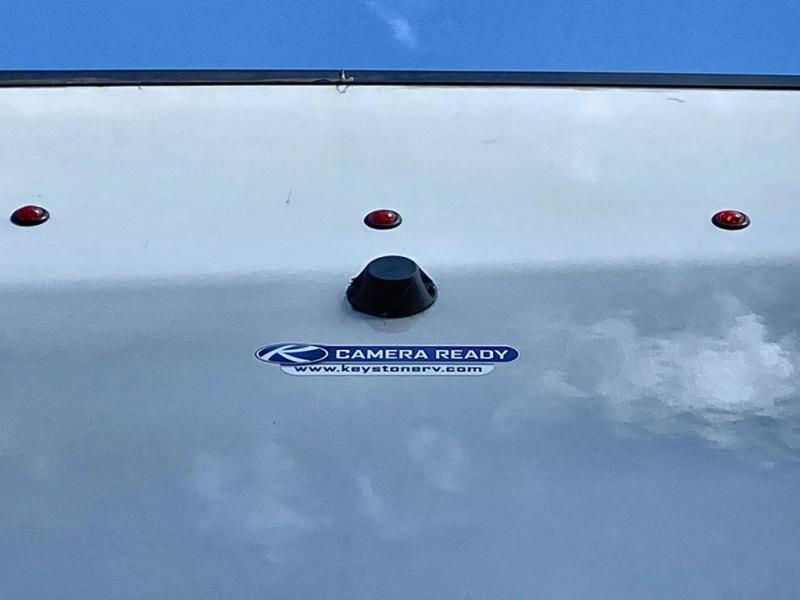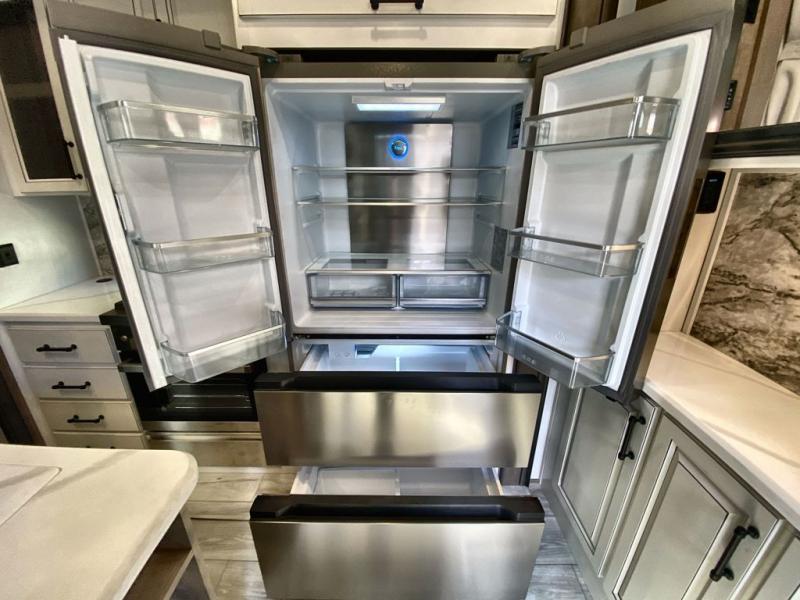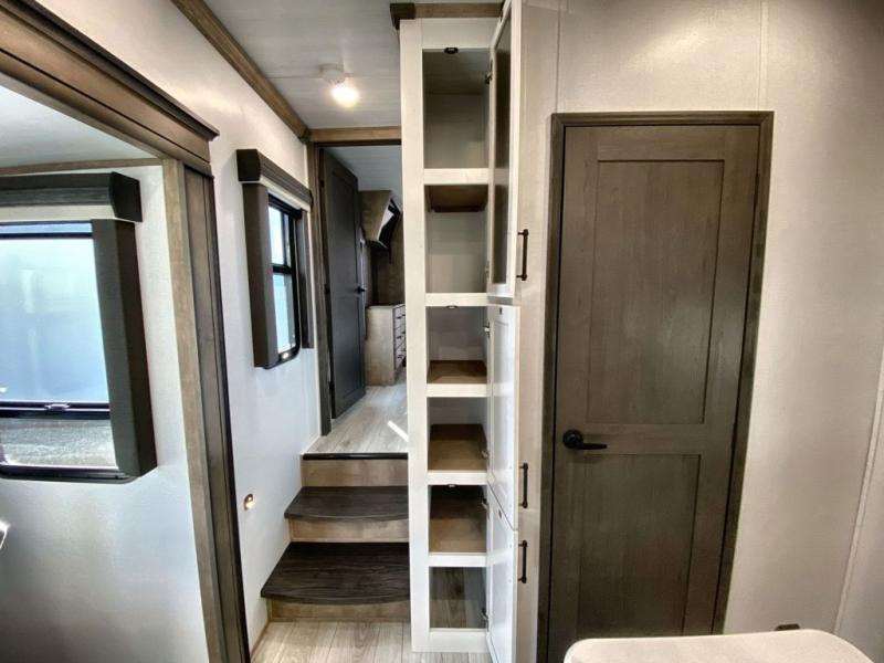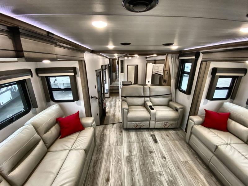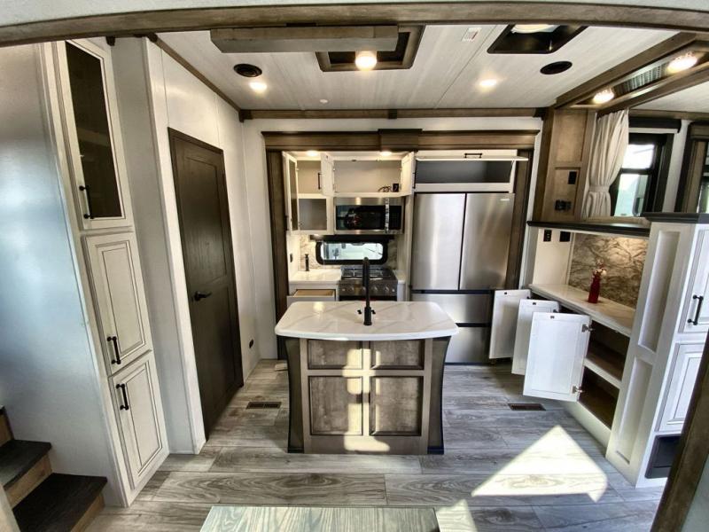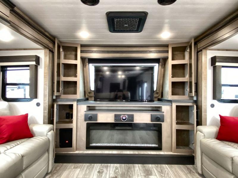 Life will be easier at the campground in this fifth wheel with a bath and a half! The full rear bathroom has a 48" x 30" fiberglass shower with a seat and skylight above, a linen closet to keep your towels close, a dual sink vanity for two to get ready at once, and a barn door to close off the master suite. The bedroom also has a king bed slide with storage underneath across from a dresser with a 32" Smart TV and wardrobe, as well as a large closet with stackable washer and dryer prep. The chef can prepare their best meals with the kitchen island, convection microwave and 24" range, plus there is a pantry/buffet and a free standing legless dinette to enjoy your meals at. The front living area will have you feeling right at home with the front entertainment center that has a telescoping 50" Smart TV, a 5,000 BTU decorative fireplace heater, and storage on either side. There is also opposing hide-a-bed sofa slides for extra sleeping spaces and power theater seating for even more comfort!