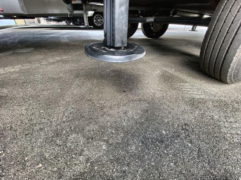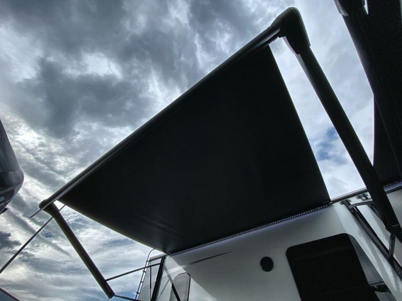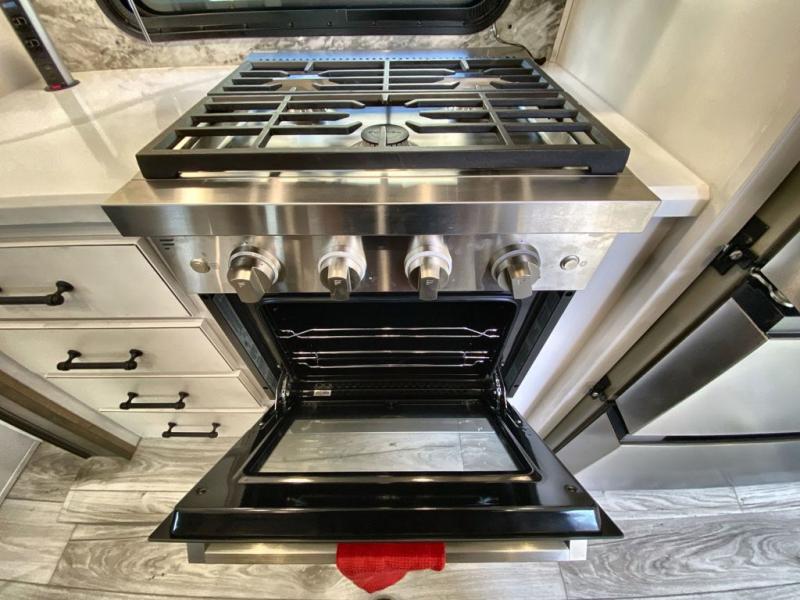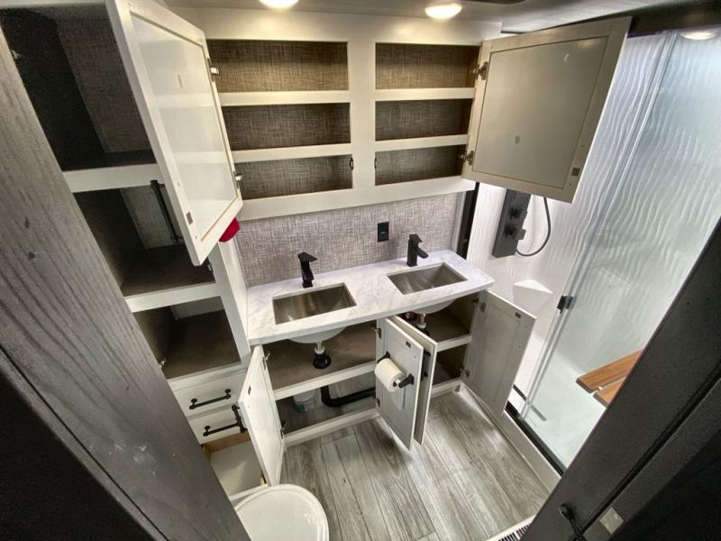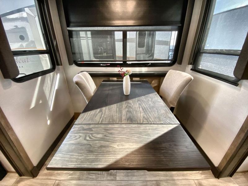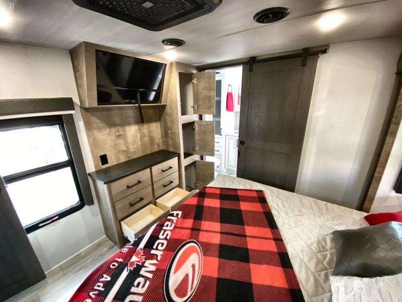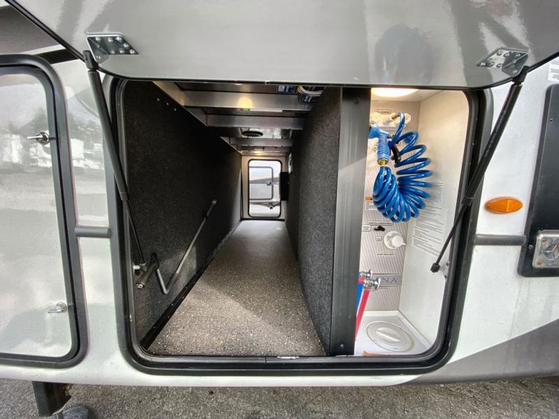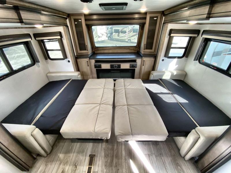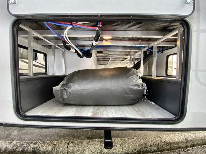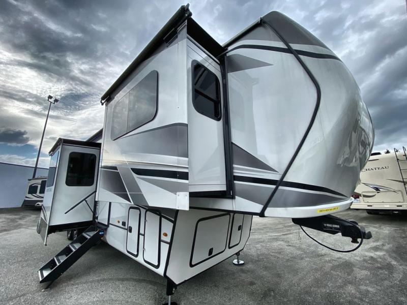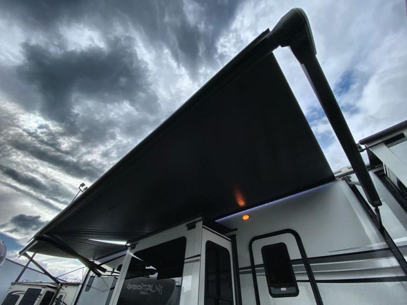 Life will be easier at the campground in this fifth wheel with a bath and a half! The full rear bathroom has a 48" x 30" fiberglass shower with a seat and skylight above, a linen closet to keep your towels close, a dual sink vanity for two to get ready at once, and a barn door to close off the master suite. The bedroom also has a king bed slide with storage underneath across from a dresser with a 32" Smart TV and wardrobe, as well as a large closet with stackable washer and dryer prep. The chef can prepare their best meals with the kitchen island, convection microwave and 24" range, plus there is a pantry/buffet and a free standing legless dinette to enjoy your meals at. The front living area will have you feeling right at home with the front entertainment center that has a telescoping 50" Smart TV, a 5,000 BTU decorative fireplace heater, and storage on either side. There is also opposing hide-a-bed sofa slides for extra sleeping spaces and power theater seating for even more comfort!