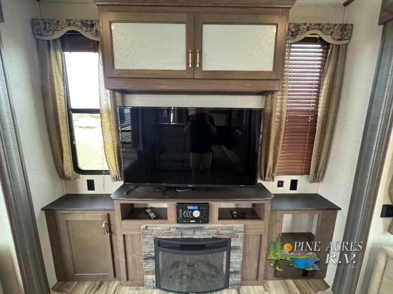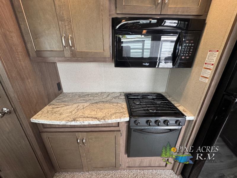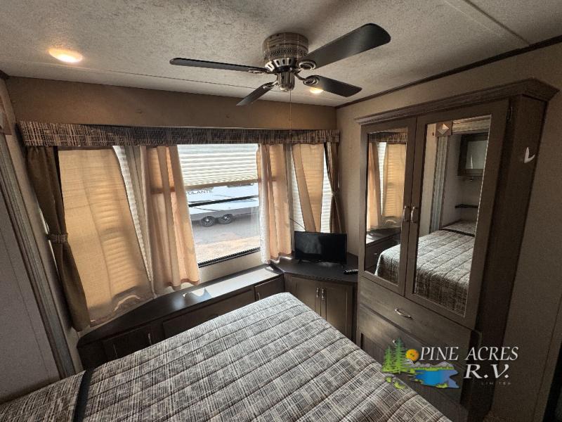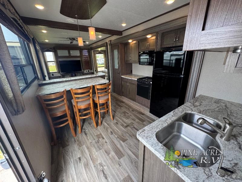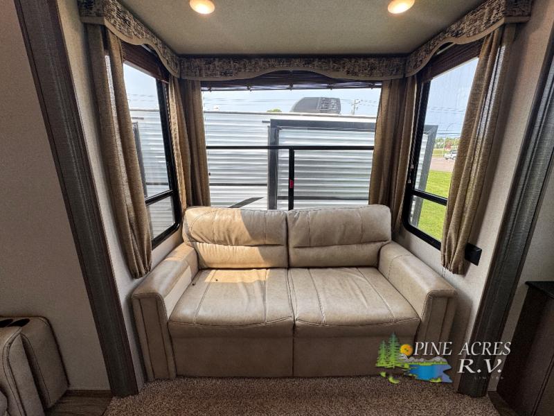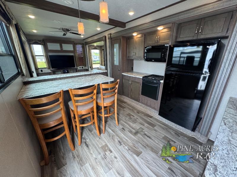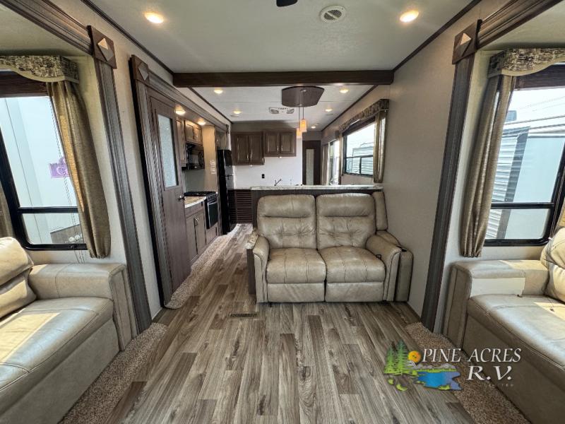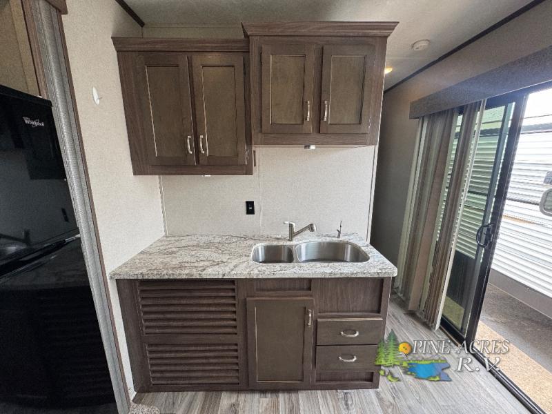 This 391RDEN is the unit you want to take a look at if you are planning on vacationing for a long period of time. This rear living unit gives your guests space of their own if they want to use the sleeper sofas for their sleeping space at night. The private front bedroom has a king bed and plenty of storage options for your things. There is a private entry door into the bathroom for convenience especially at night. The kitchen is nice and big, giving you plenty of space for prepping for meals, cooking them and cleaning up afterward. The residentially sized fridge will give you plenty of room for storing your perishables while you are away from home.