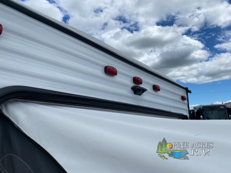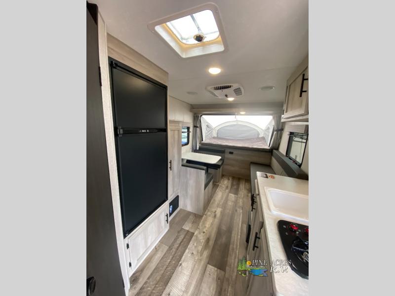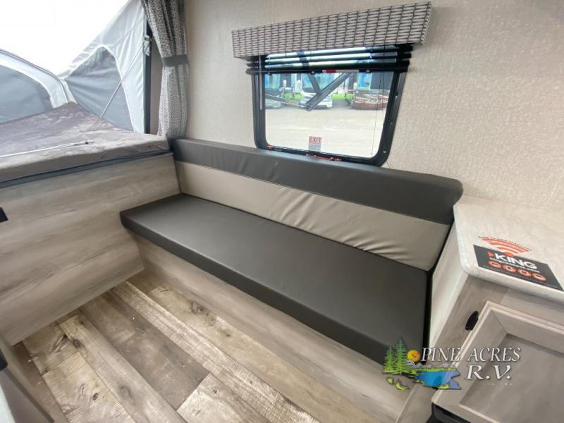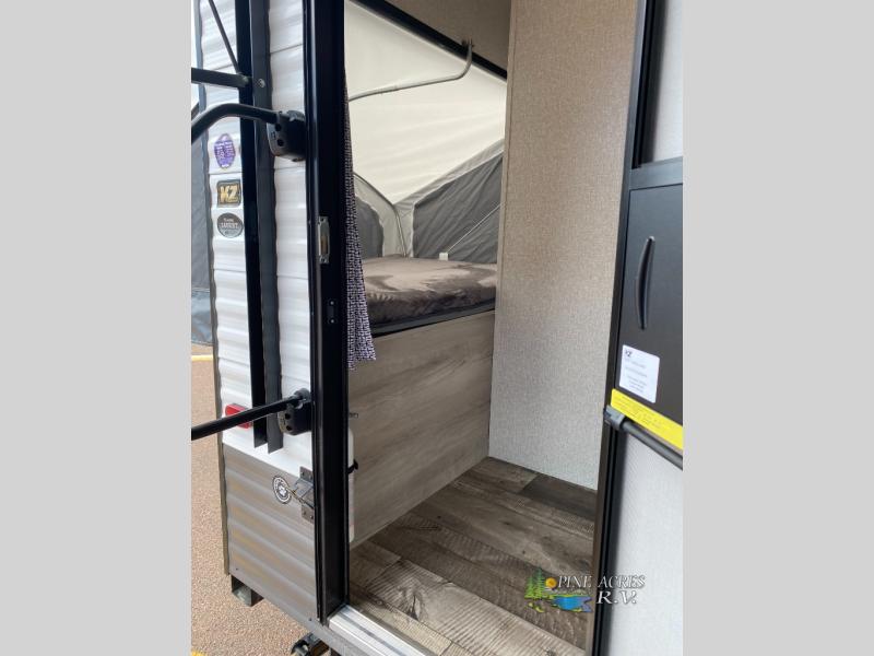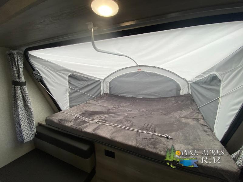 Nothing says hassle-free camping like an expandable, and this model is perfect for your group of six. There are two 54" x 74" tent end beds, a 70" bench seat, plus a booth dinette. You can prepare meals on the two burner cooktop, and dry goods can go in the pantry. This model also includes a 12' power awning that will provide shade as you visit with friends.