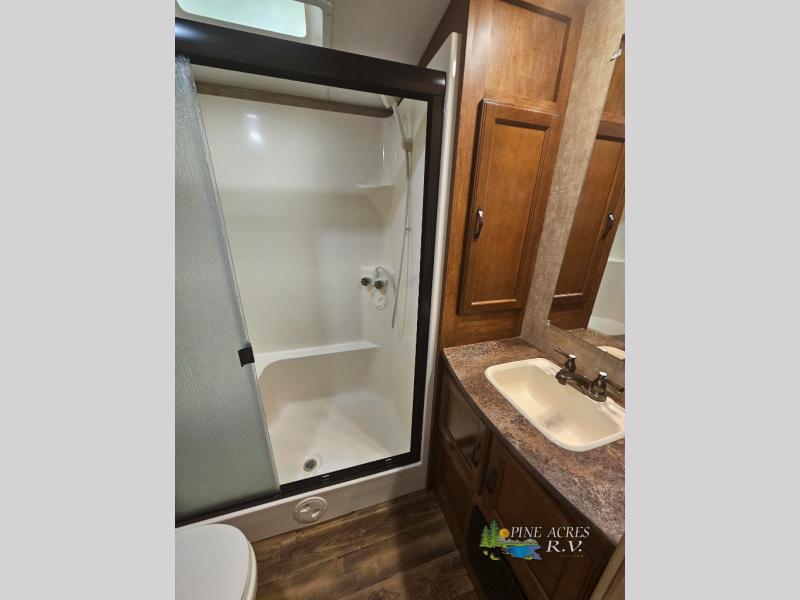As you proceed toward the front of the trailer, the bathroom is on the left. Inside the bathroom there is a toilet, shower with seat, linen cabinet, and sink.