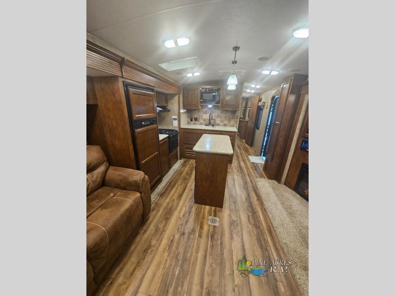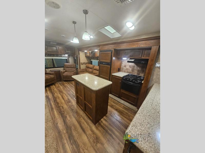 Stepping inside the travel trailer, to the left there is a closet. The slide just past the closet has an entertainment center and dinette. Along the rear wall you will find two lounge chairs. The second slide in the main living area offers a sofa, refrigerator, three burner range, and microwave. There is also a double kitchen sink with counter space on either side of the sink. In the middle of the kitchen you sure enjoy the kitchen island and all of the extra room it provides for meal prep.