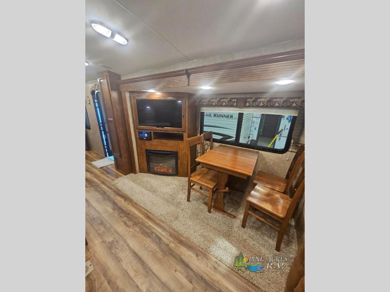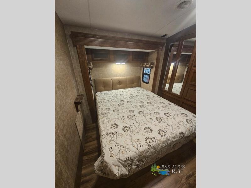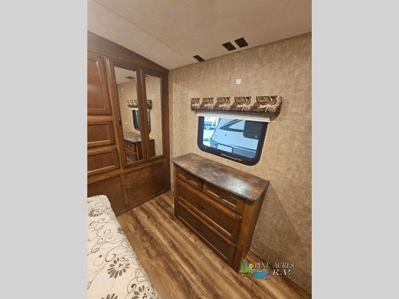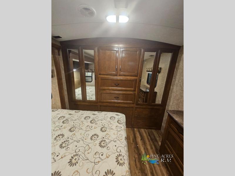 In the front bedroom you will find a queen bed slide. The bedroom TV is located across from the bed. Along the front wall you will find a large closet with drawers.