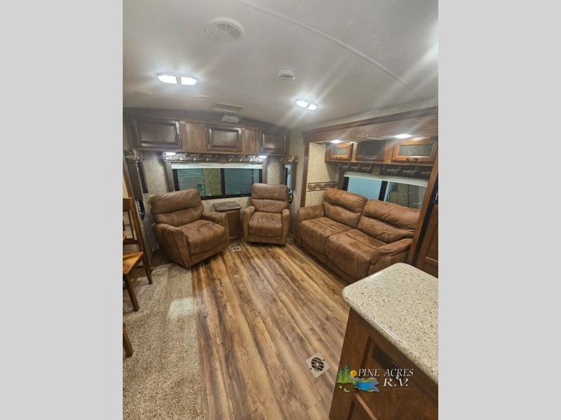 Throughout the travel trailer you will find plenty of overhead cabinets, as well as a large pass thru storage area.