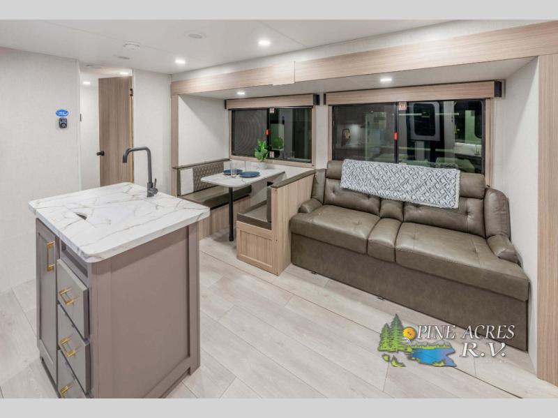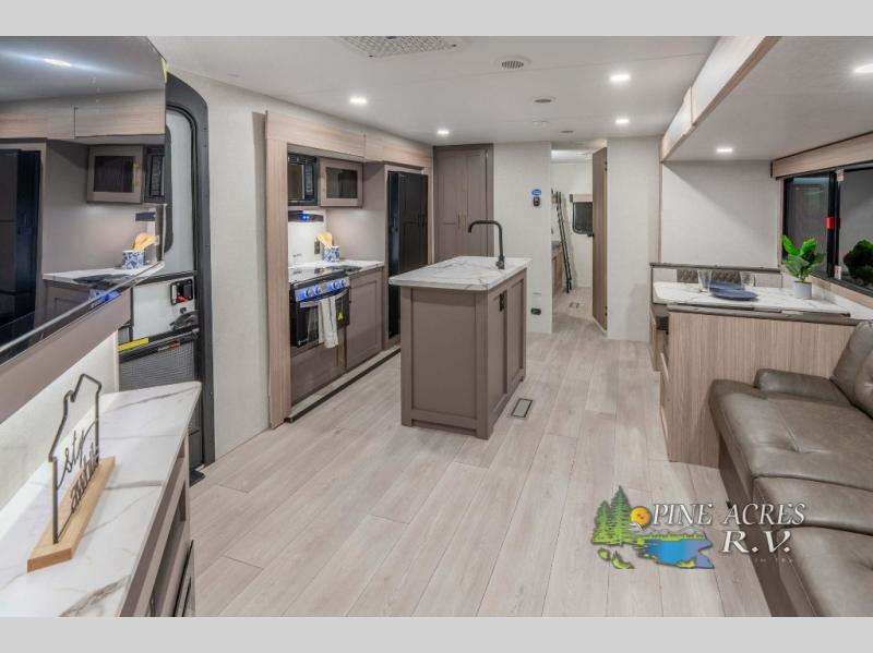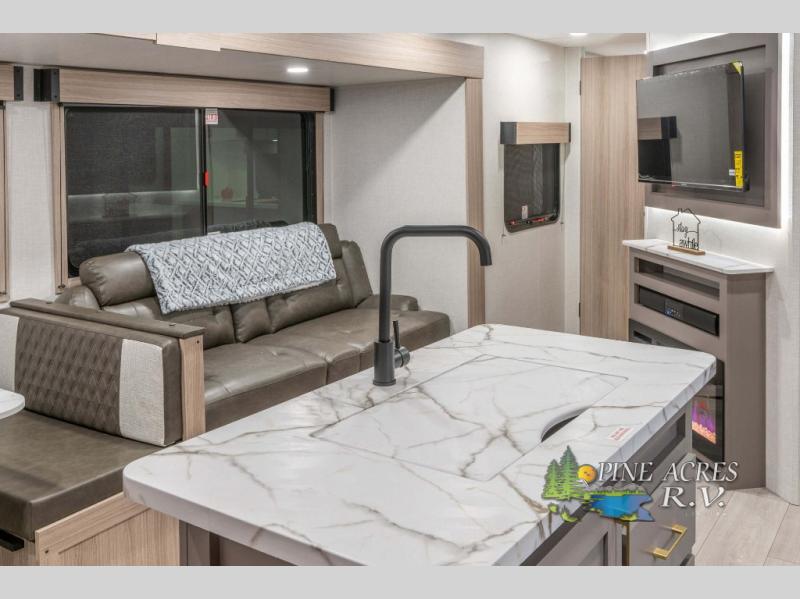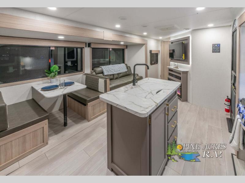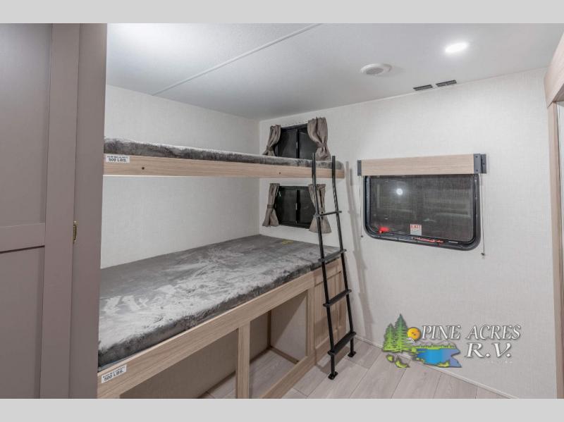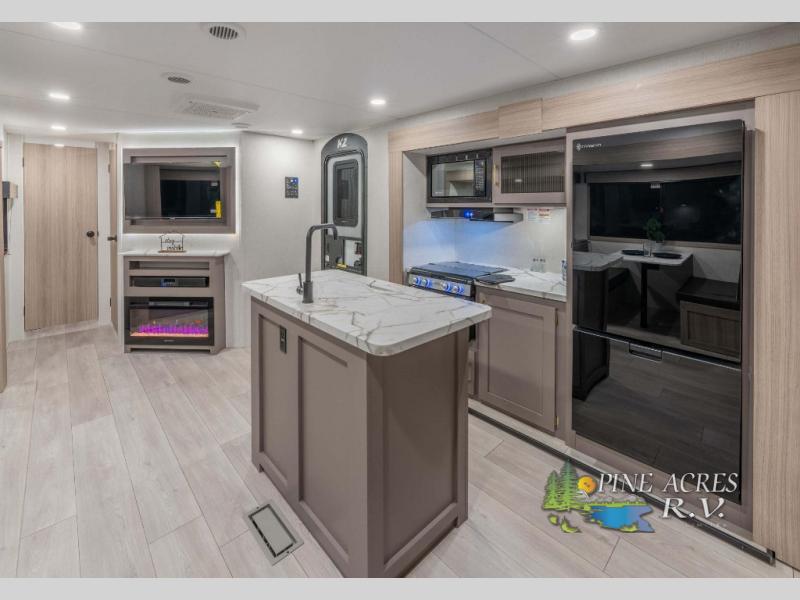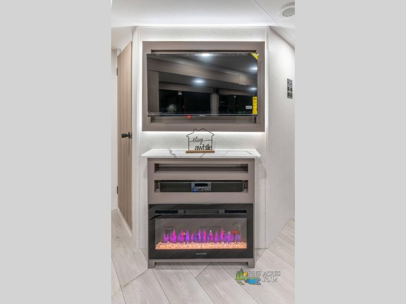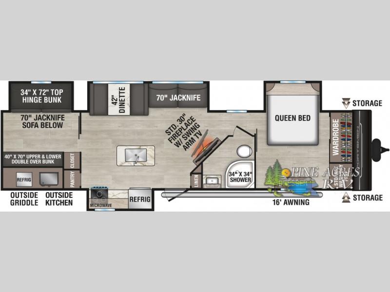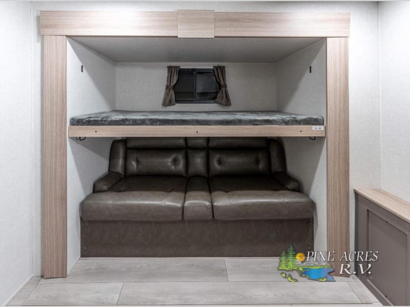 If you've been looking for a travel trailer with plenty of space for your family or group of friends, look no further! The private bunkhouse includes a set of bunks plus a jackknife sofa with a hinge bunk above. Everyone can gather in the main living area at the booth dinette, and there is a second jackknife sofa here for more seating while you watch a movie cozied up by the fireplace.You will love how spacious is the front bedroom that includes tons of storage options featuring a large wardrobe, a dresser and even storage with washer and dryer prep! If the weather is nice, head outdoors to relax under the 16' power awning as the cook prepares dinner on the outside griddle!