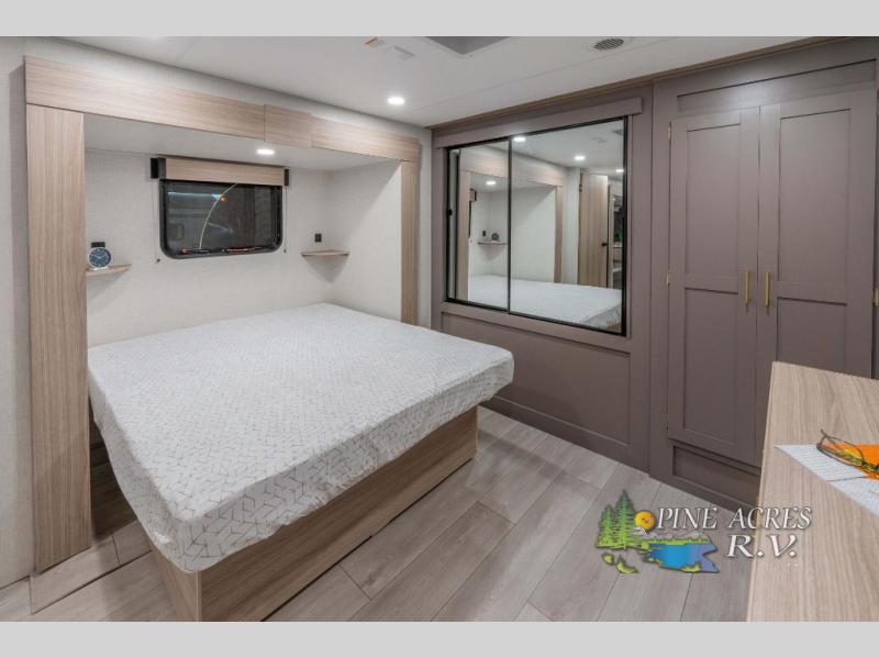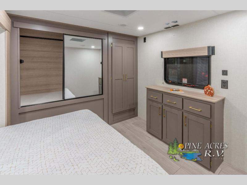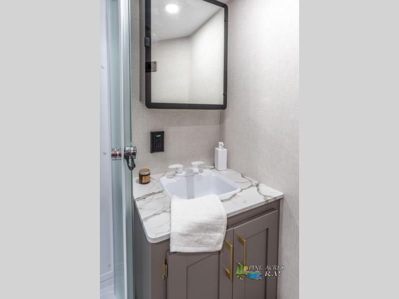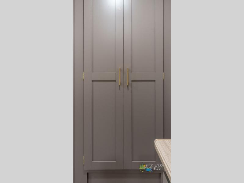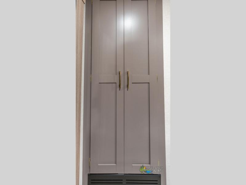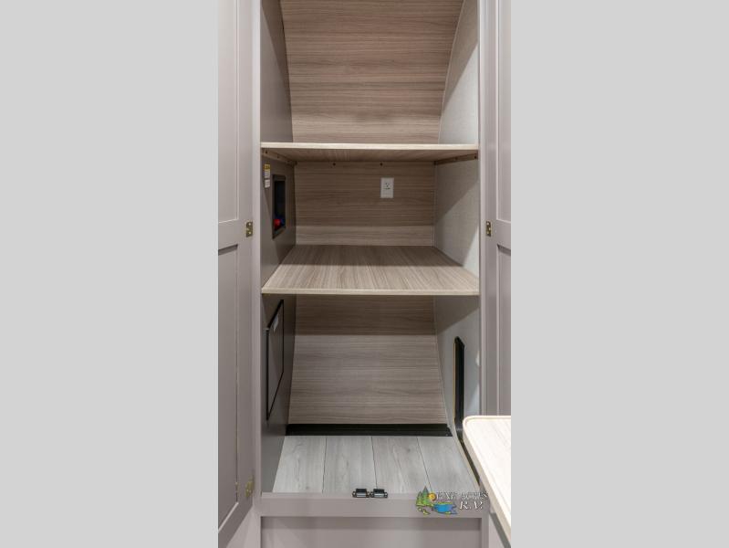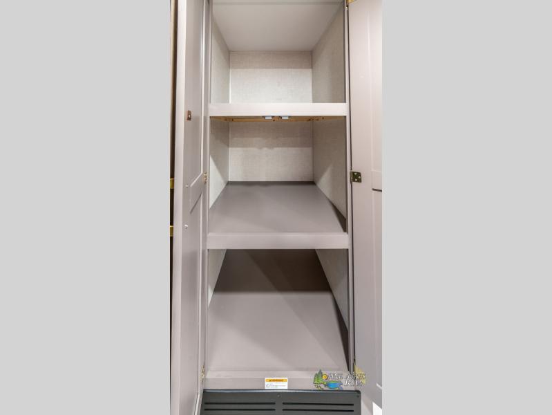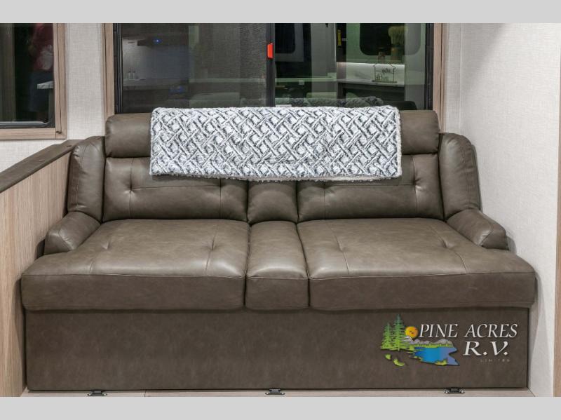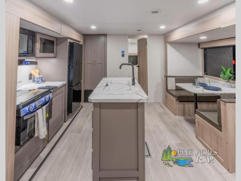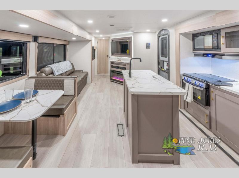 If you've been looking for a travel trailer with plenty of space for your family or group of friends, look no further! The private bunkhouse includes a set of bunks plus a jackknife sofa with a hinge bunk above. Everyone can gather in the main living area at the booth dinette, and there is a second jackknife sofa here for more seating while you watch a movie cozied up by the fireplace.You will love how spacious is the front bedroom that includes tons of storage options featuring a large wardrobe, a dresser and even storage with washer and dryer prep! If the weather is nice, head outdoors to relax under the 16' power awning as the cook prepares dinner on the outside griddle!